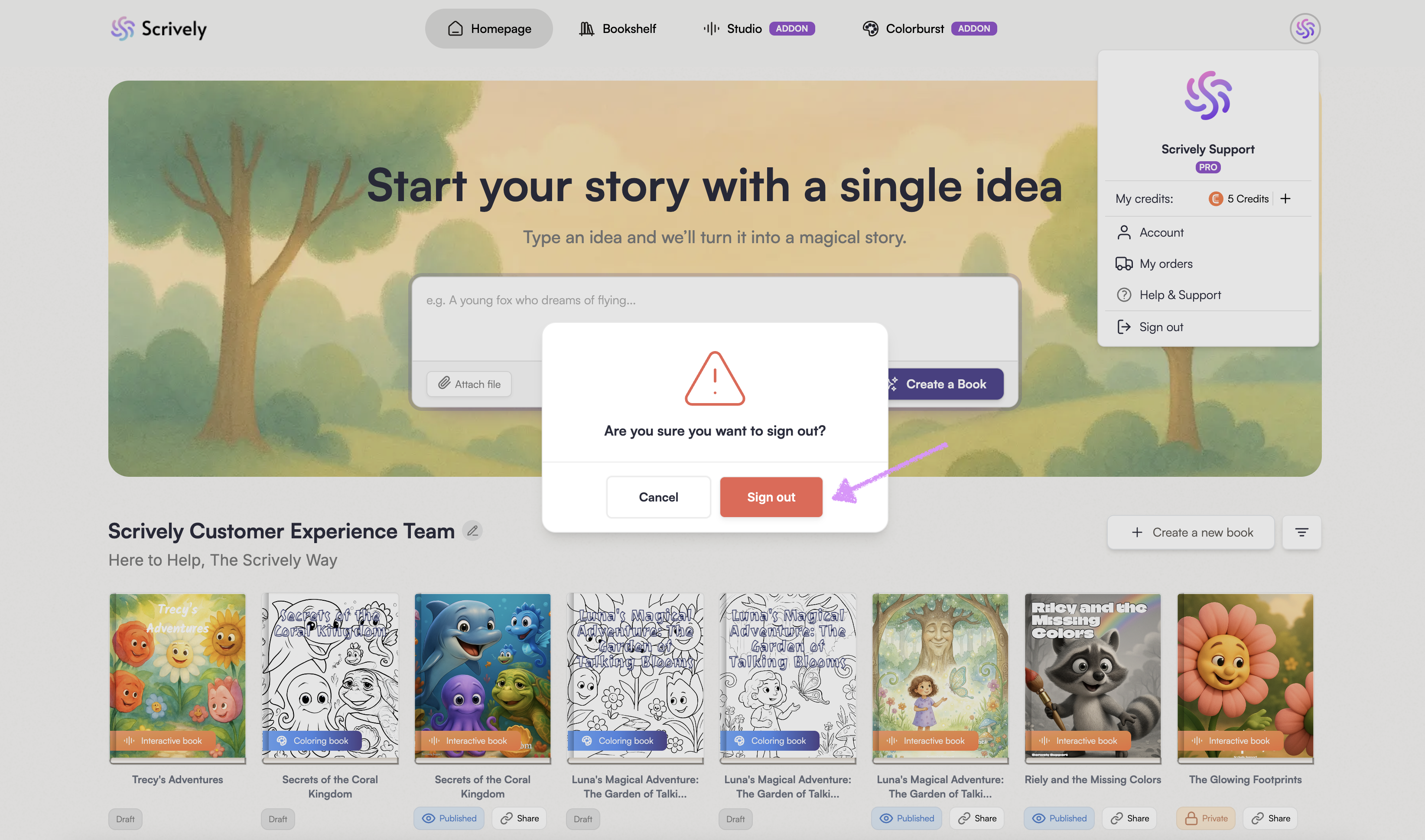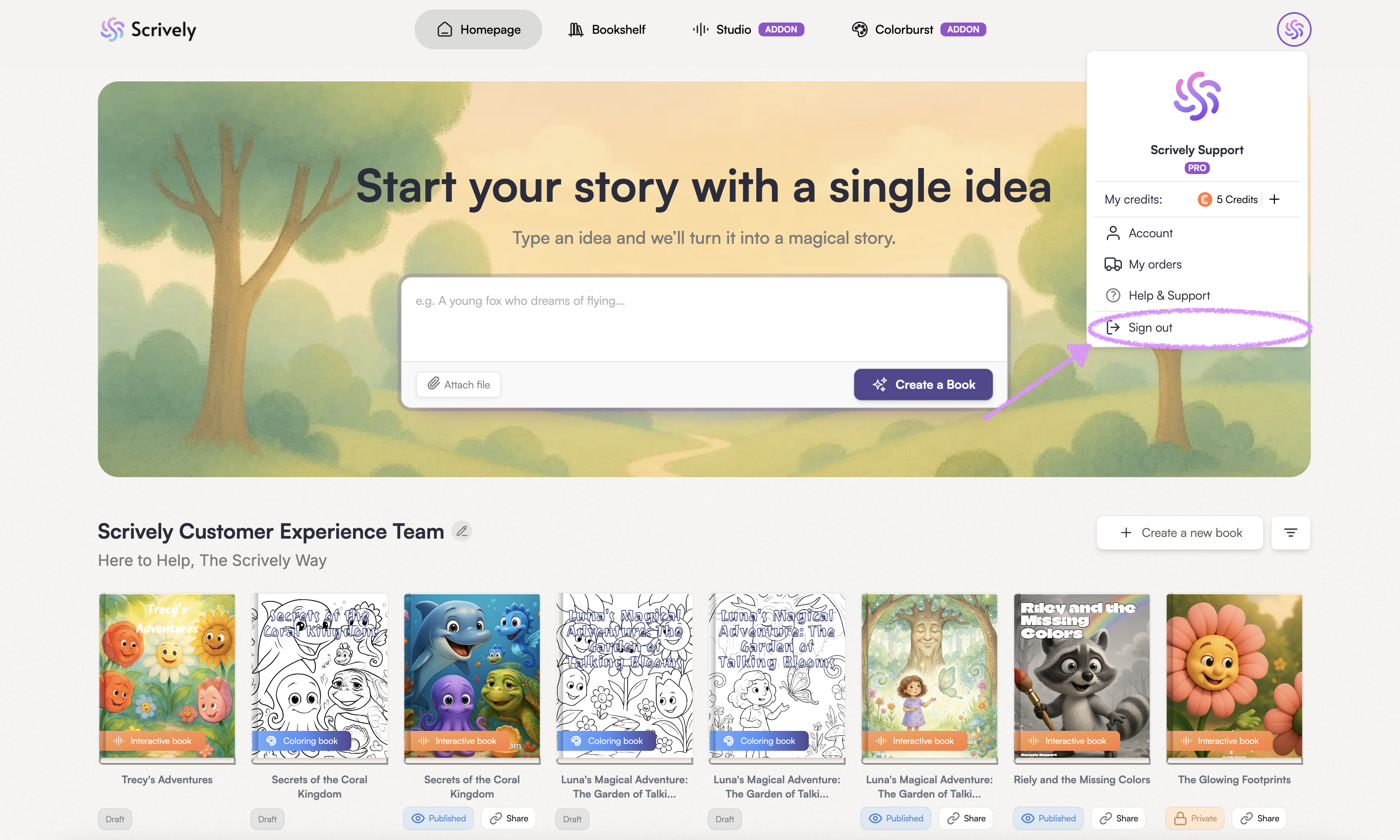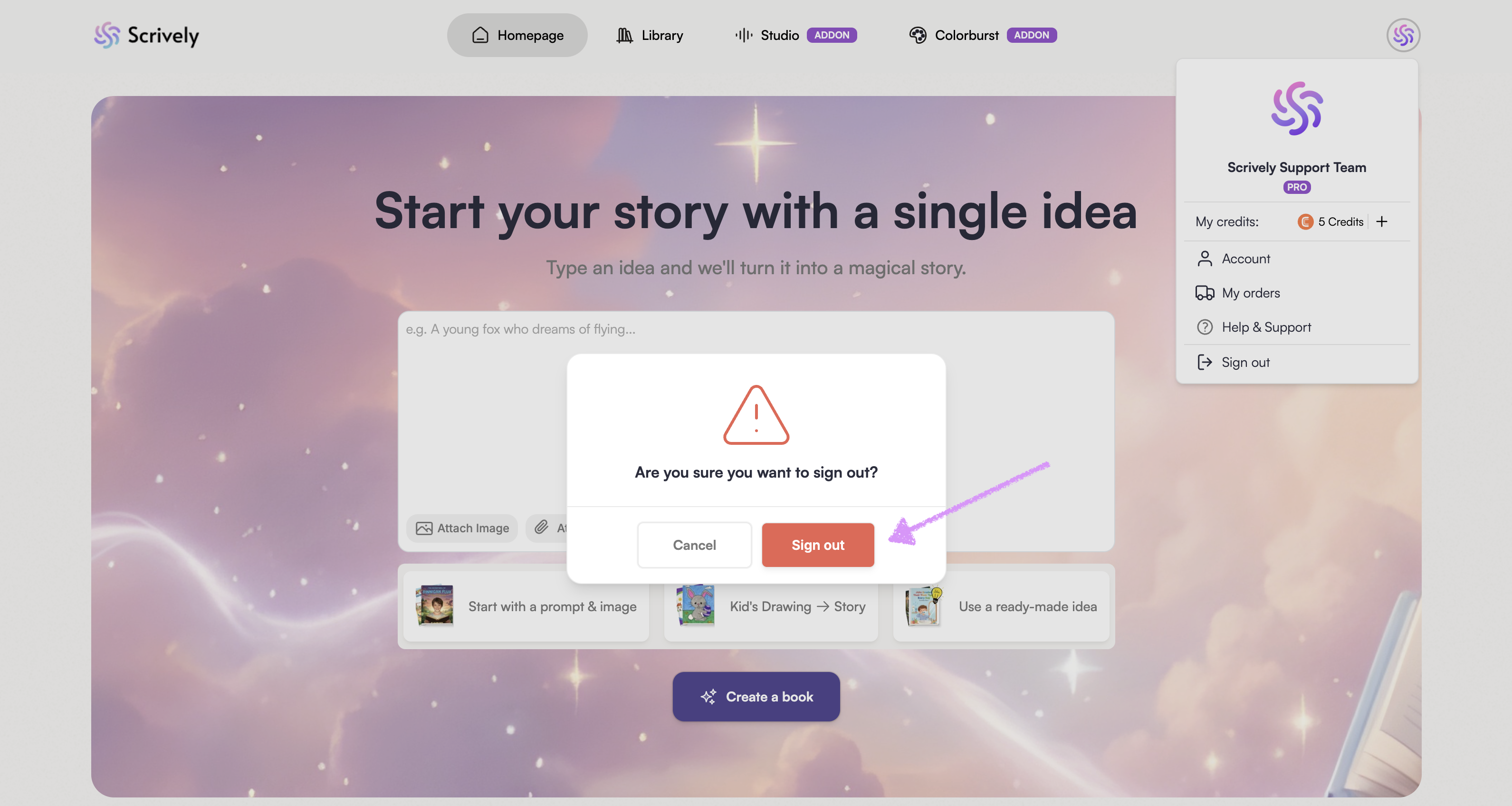 To sign out of your account, navigate to the upper right corner of the Scrively Homepage and click on your avatar.