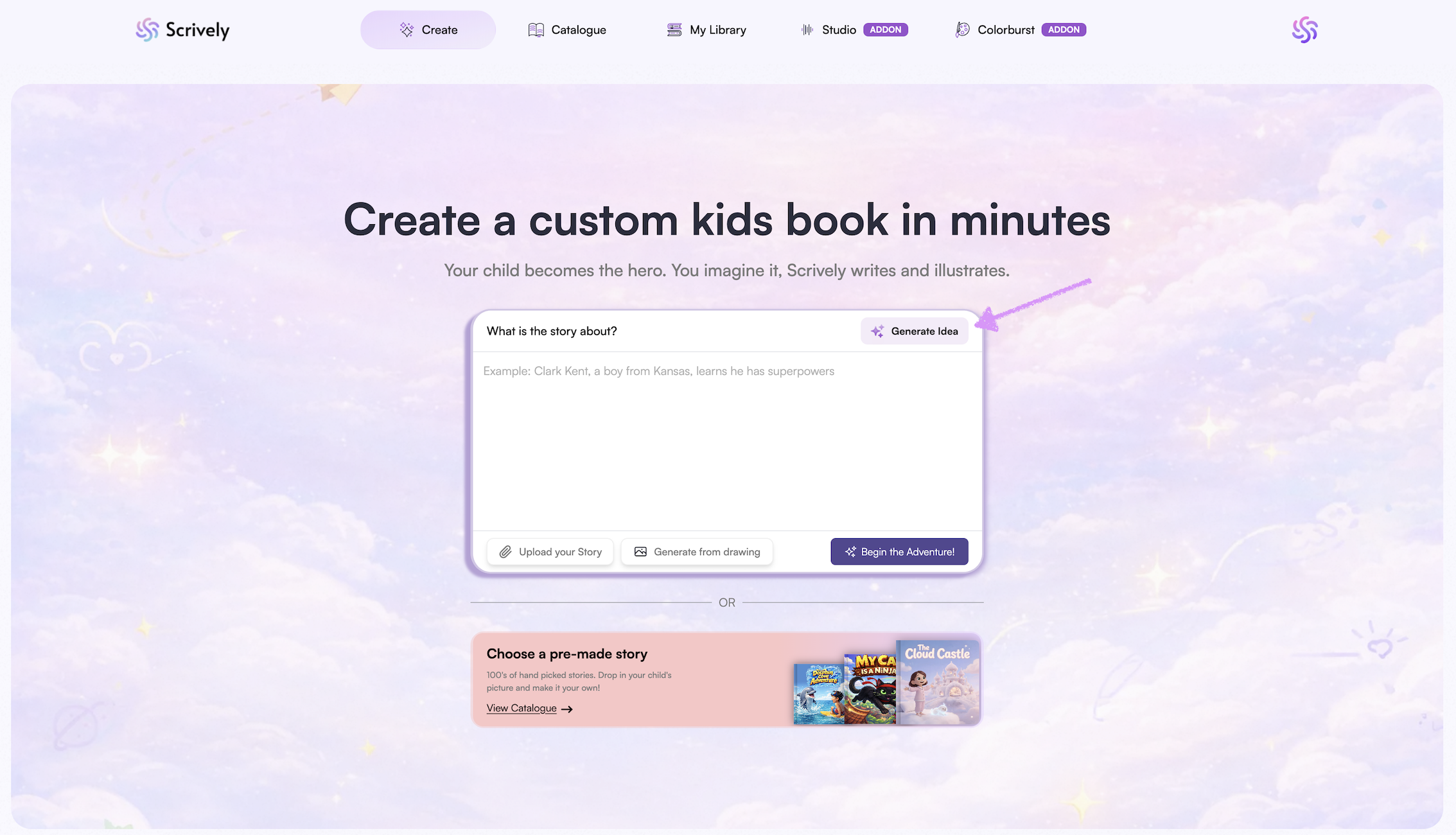 Need an idea for a story? Use the "Generate Idea" option and Scrively will create one for you.