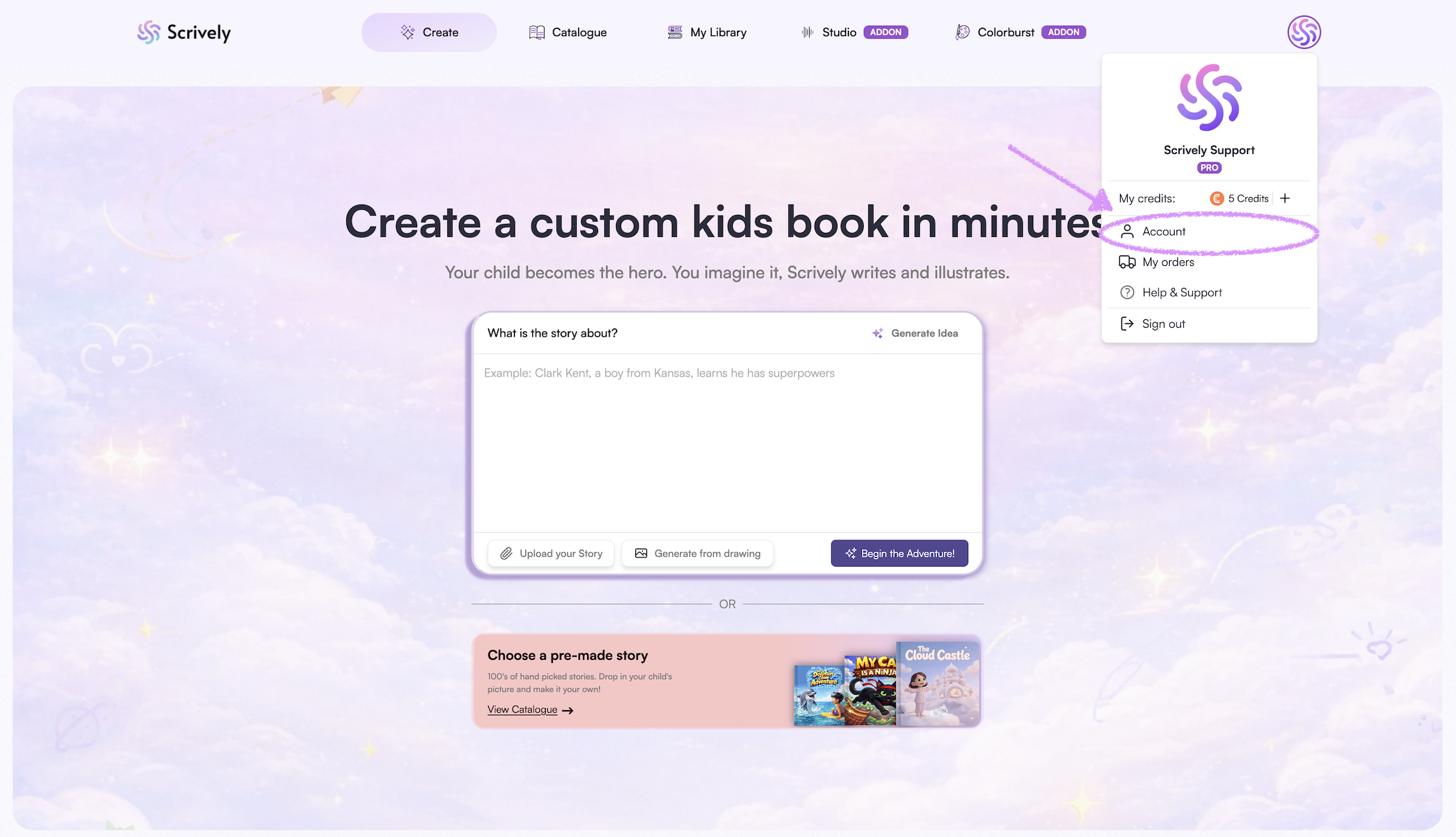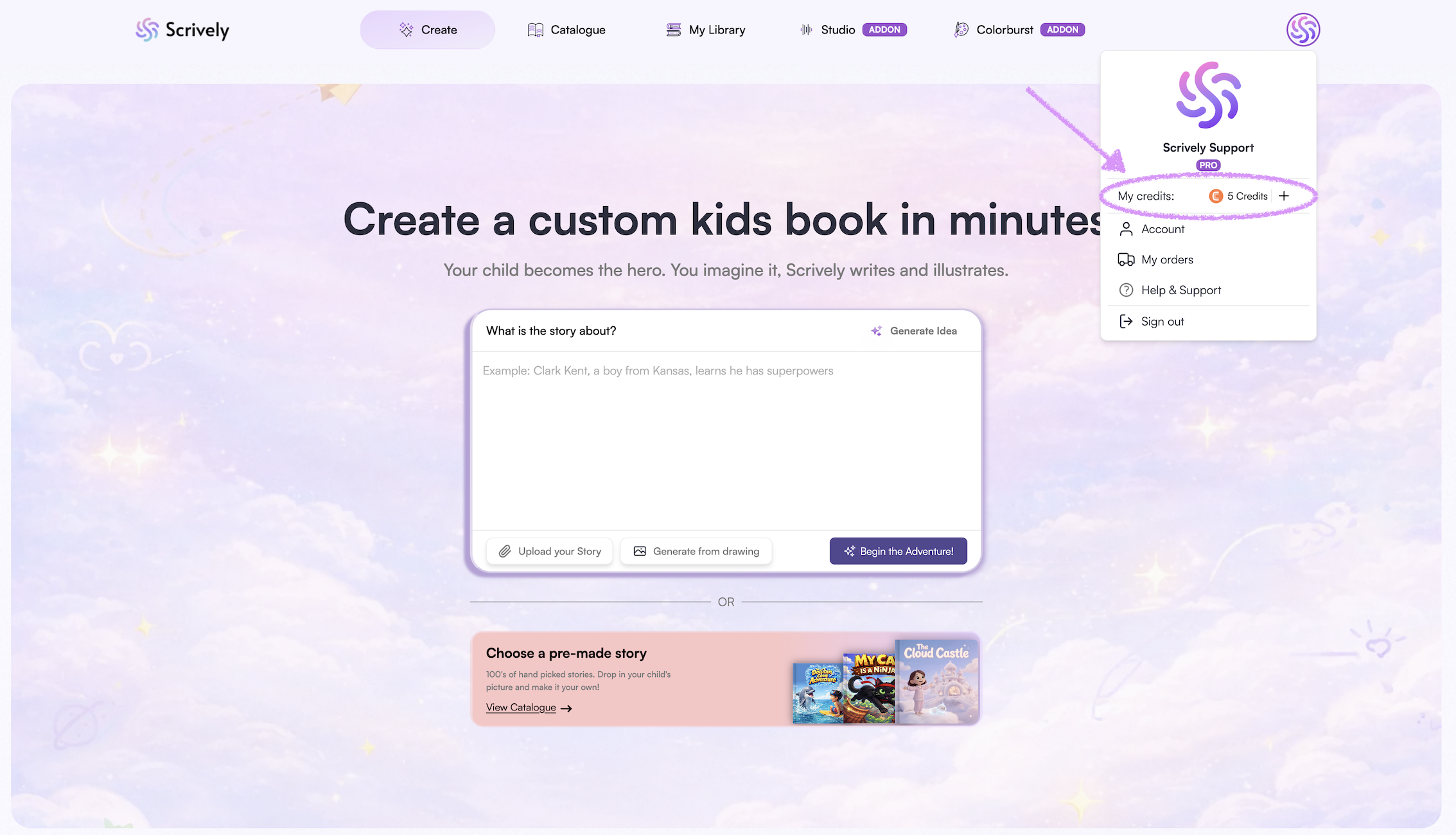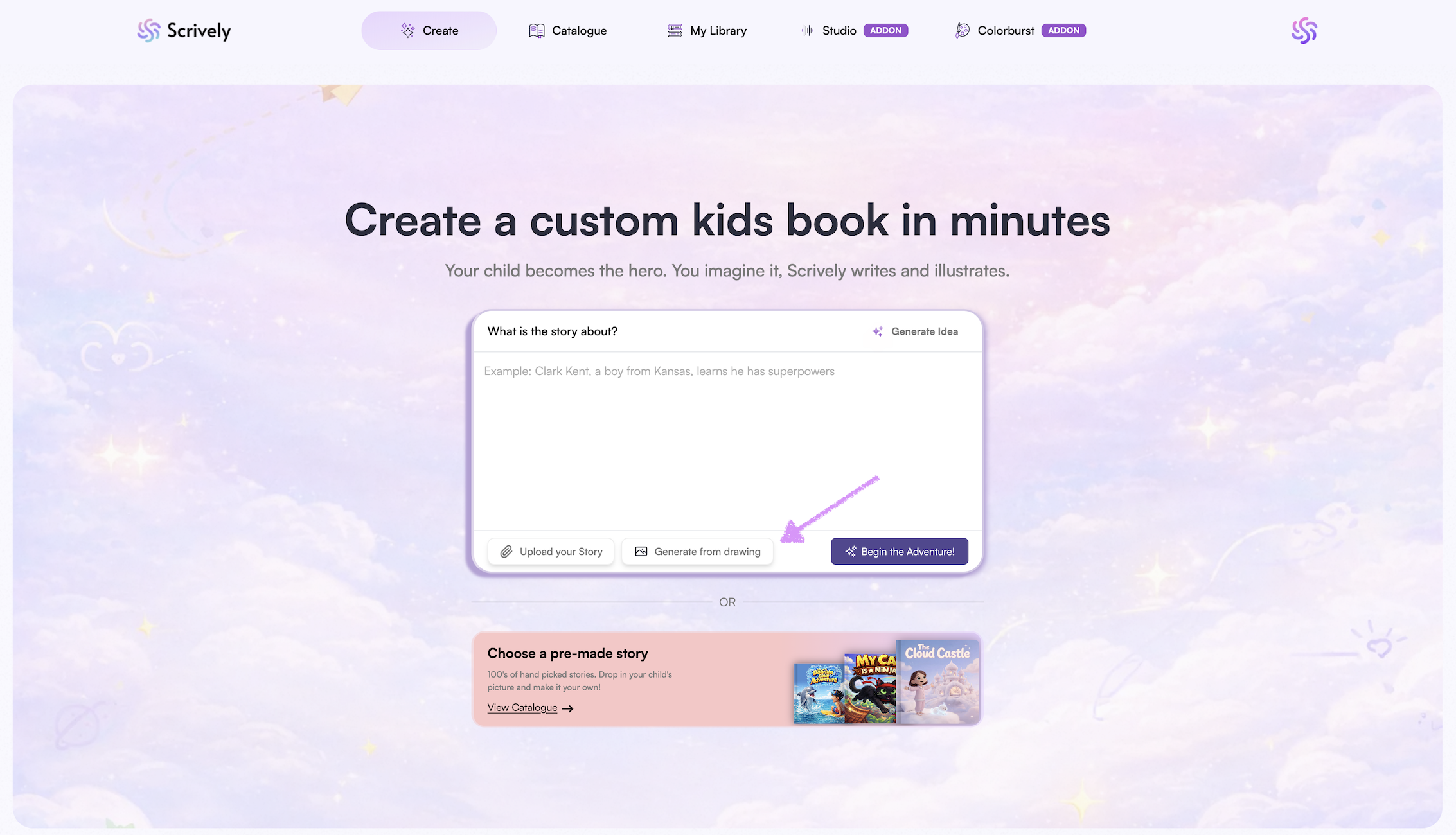 You also have the option to upload a drawing, which Scrively can use to generate a story based on your illustration.
