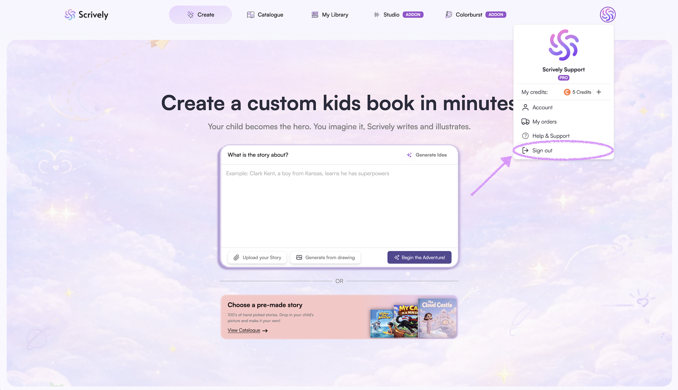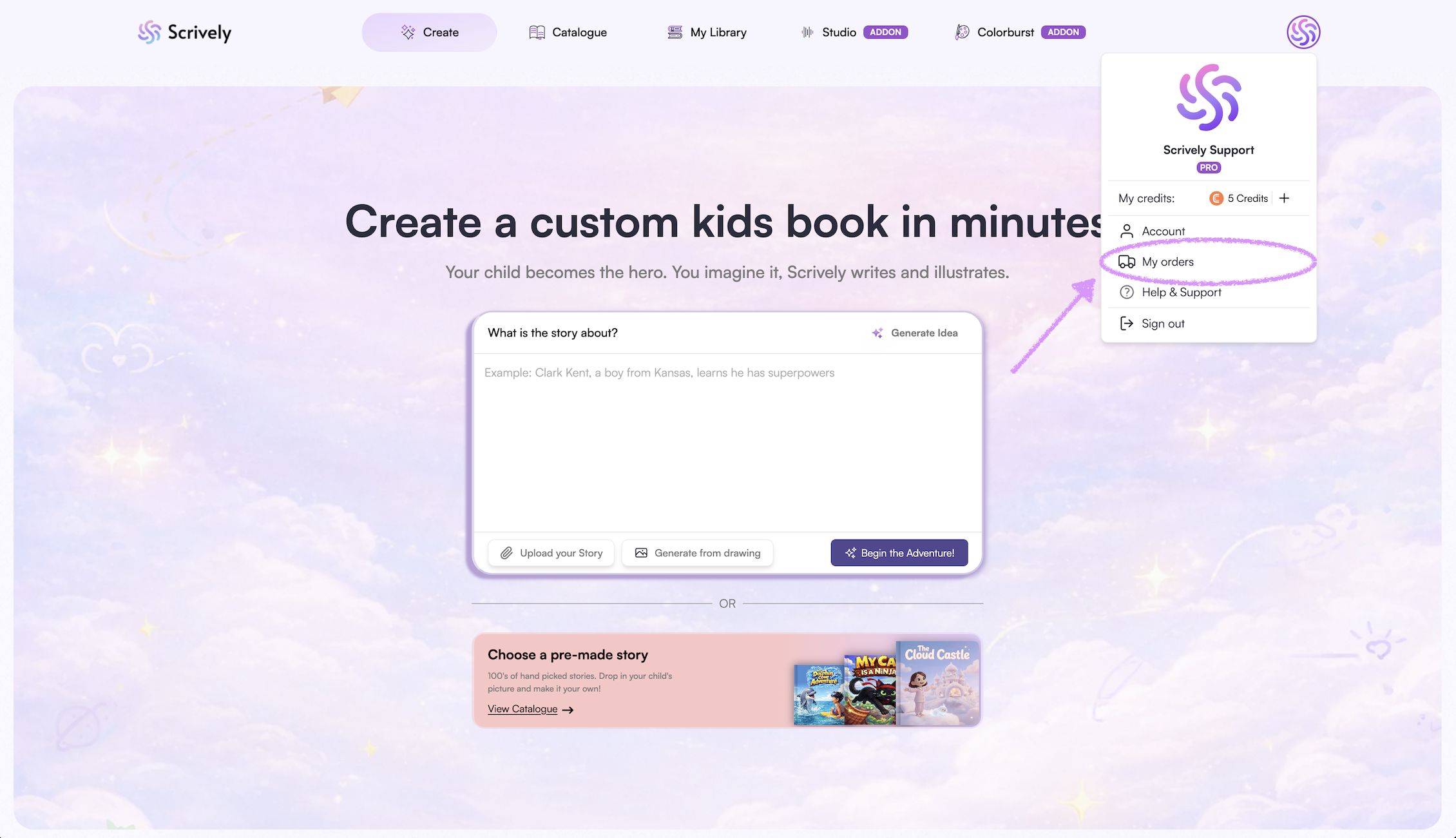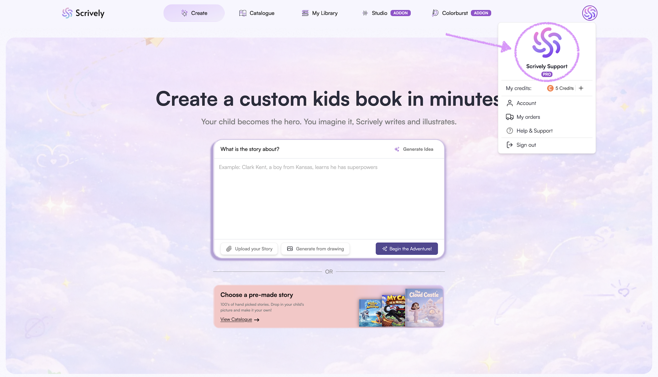 You also have the option to upload a drawing, which Scrively can use to generate a story based on your illustration.