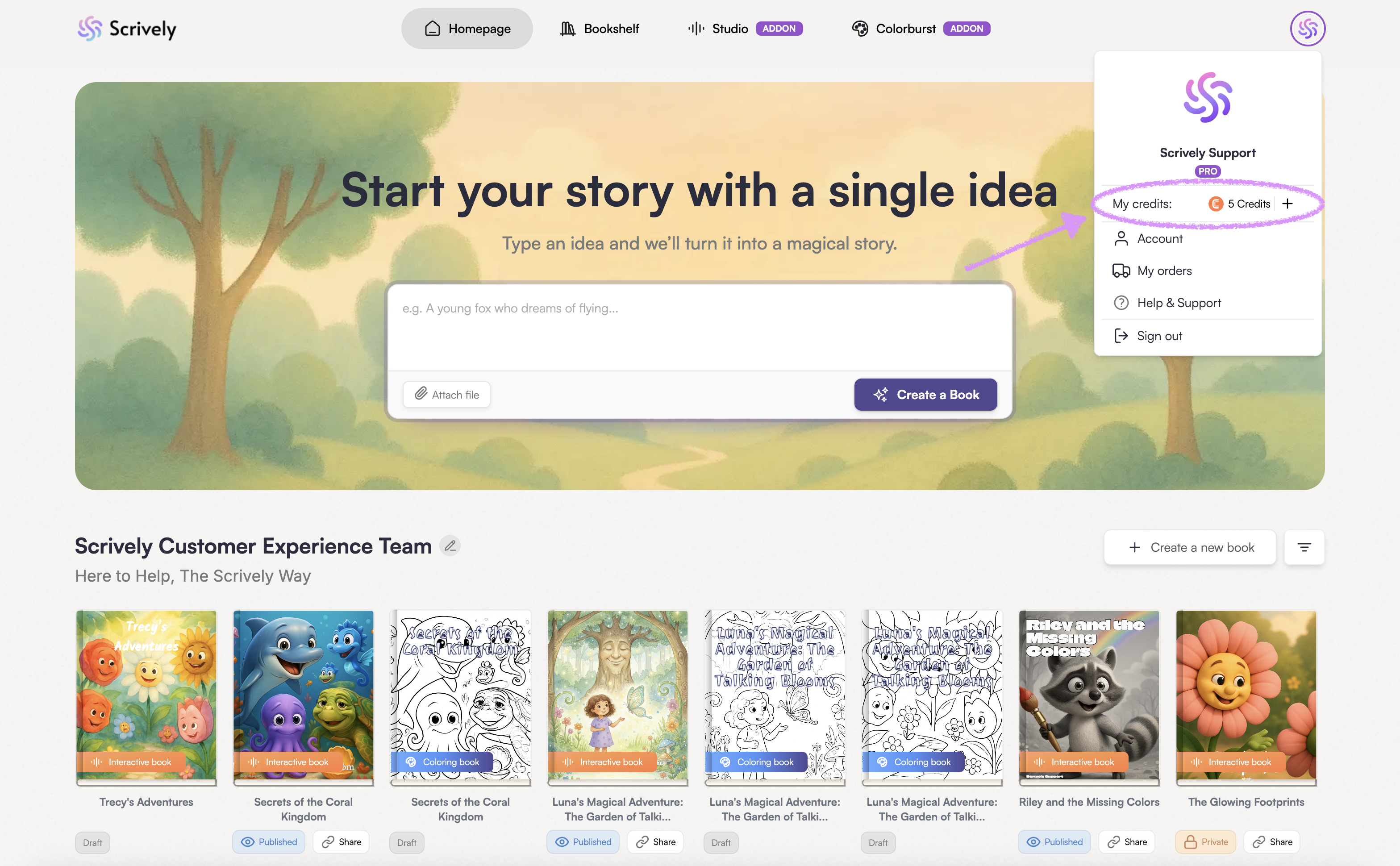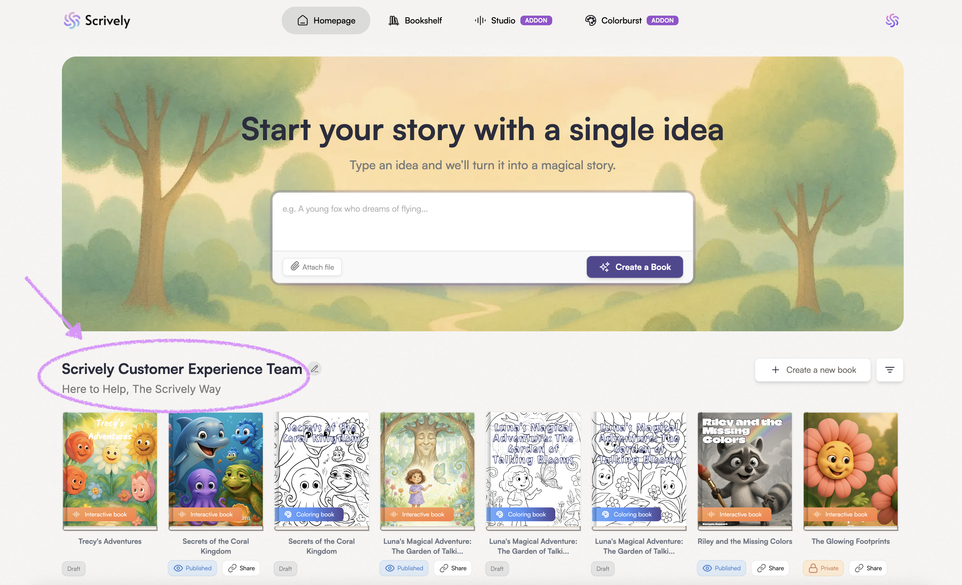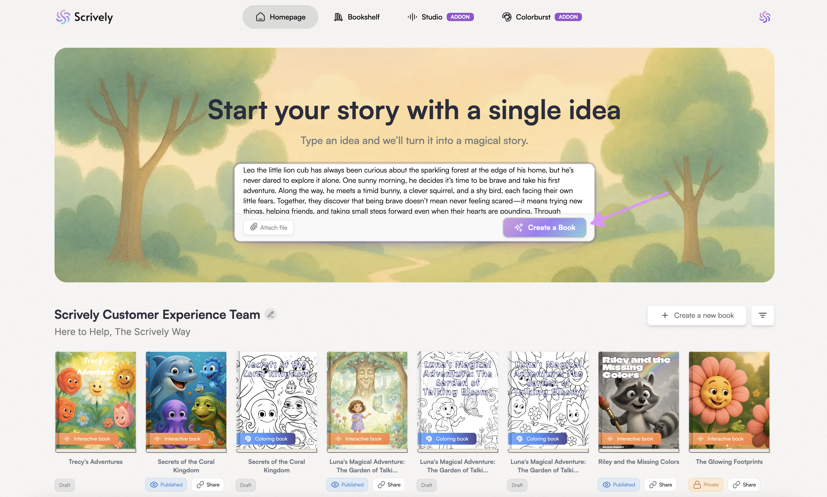 After downloading and logging into your Scrively account, you’ll land on the "Homepage." At the top, you’ll see the story box where you can type in or paste the idea for your book. The more details you include, the better the story will turn out!