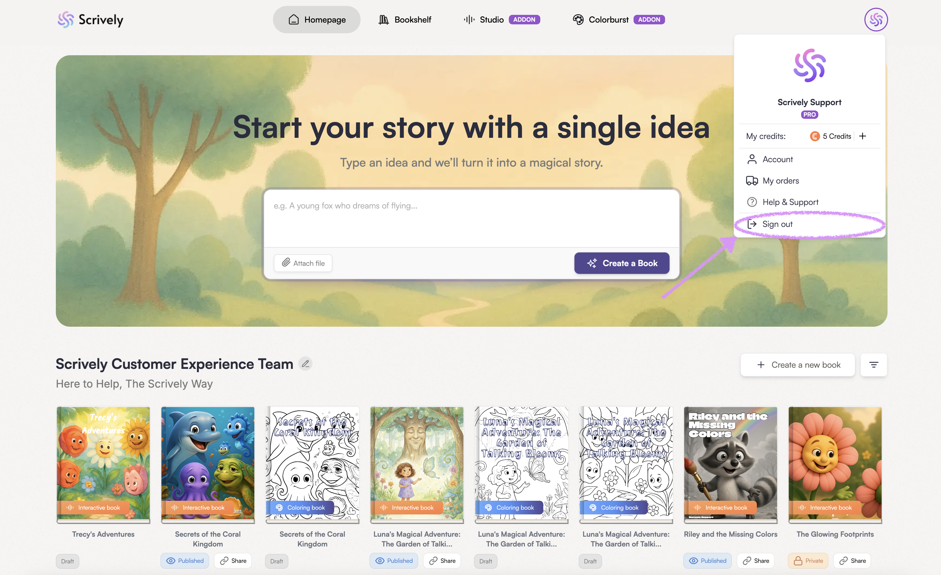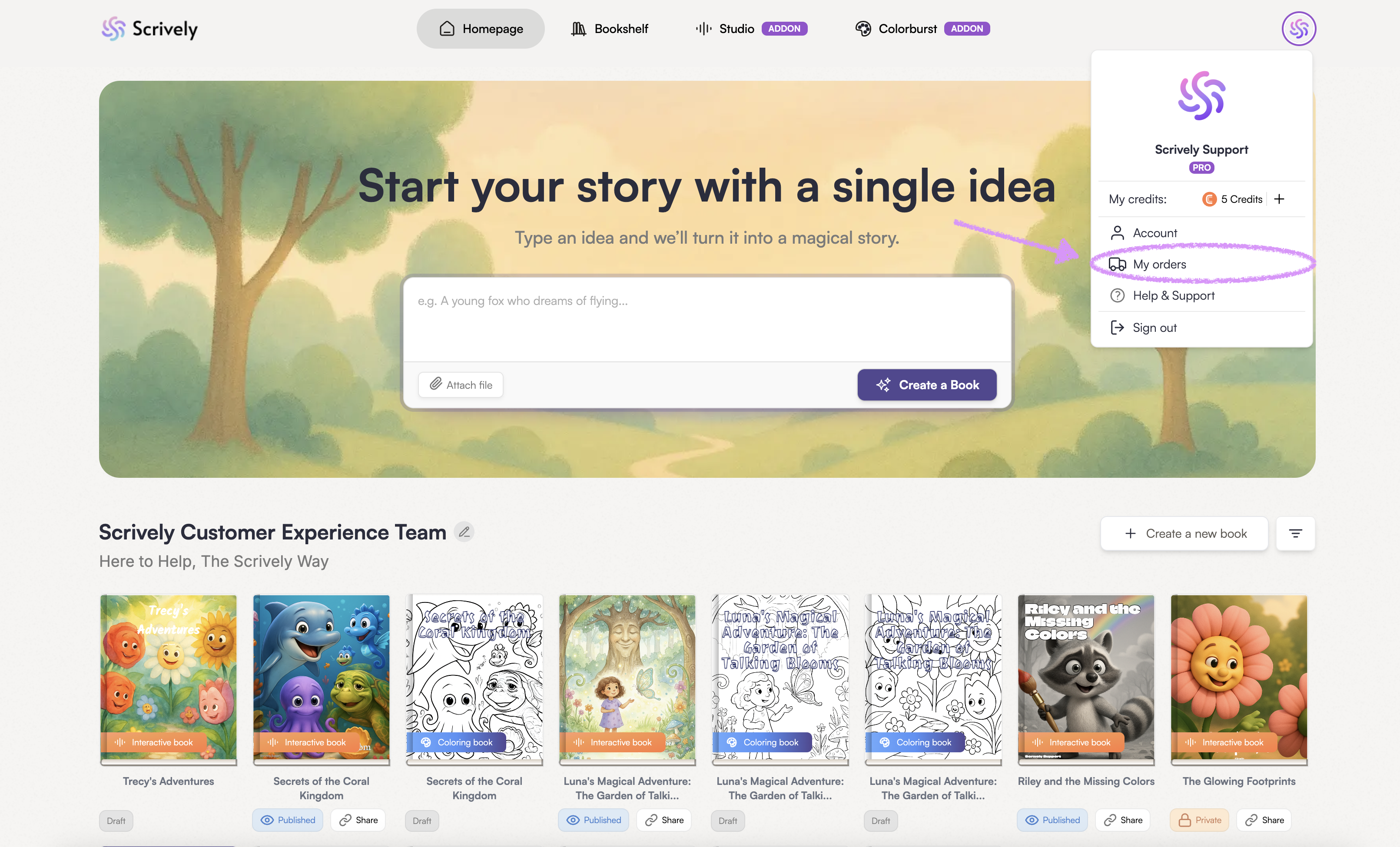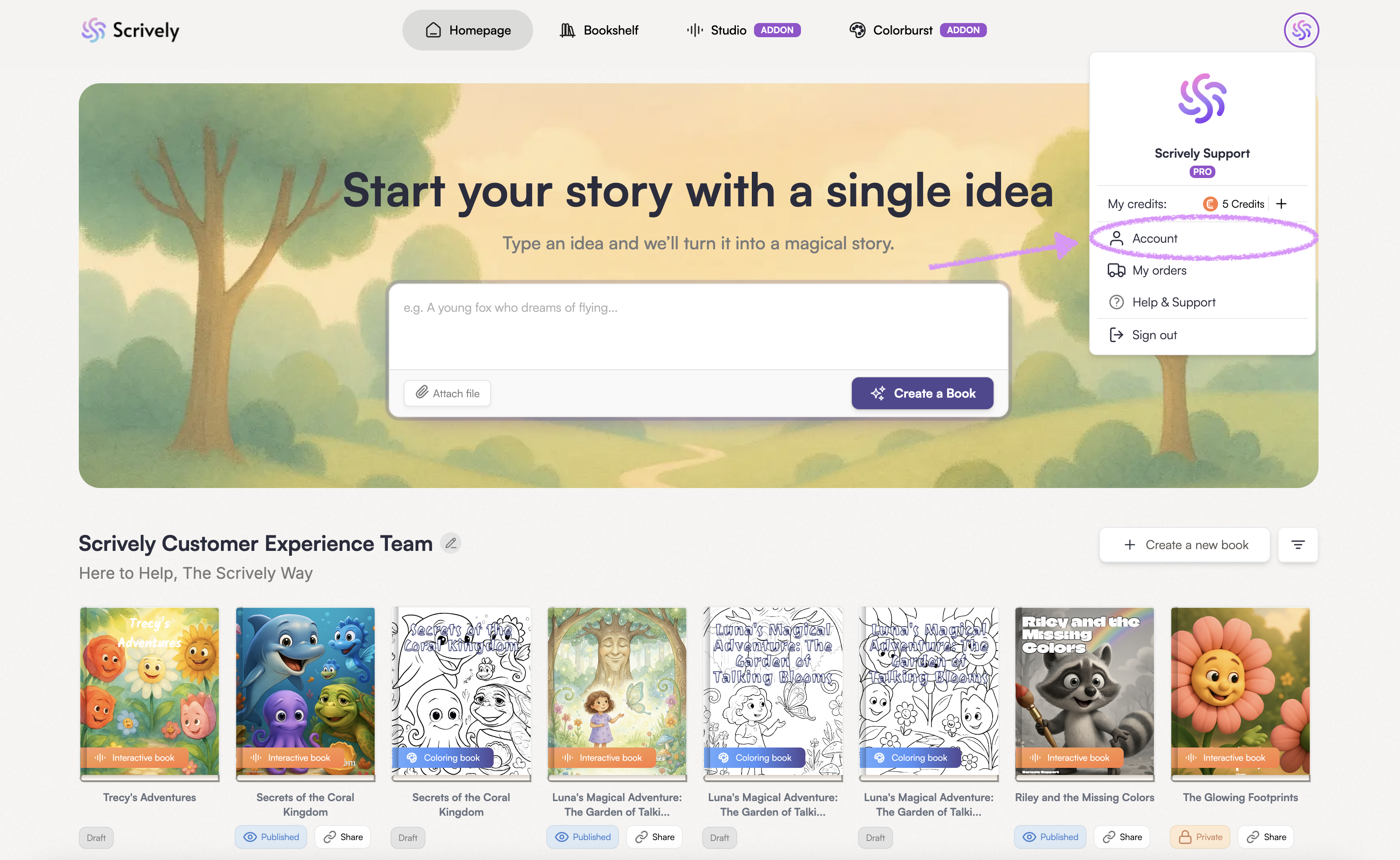 After downloading and logging into your Scrively account, you’ll land on the "Homepage." At the top, you’ll see the story box where you can type in or paste the idea for your book. The more details you include, the better the story will turn out!