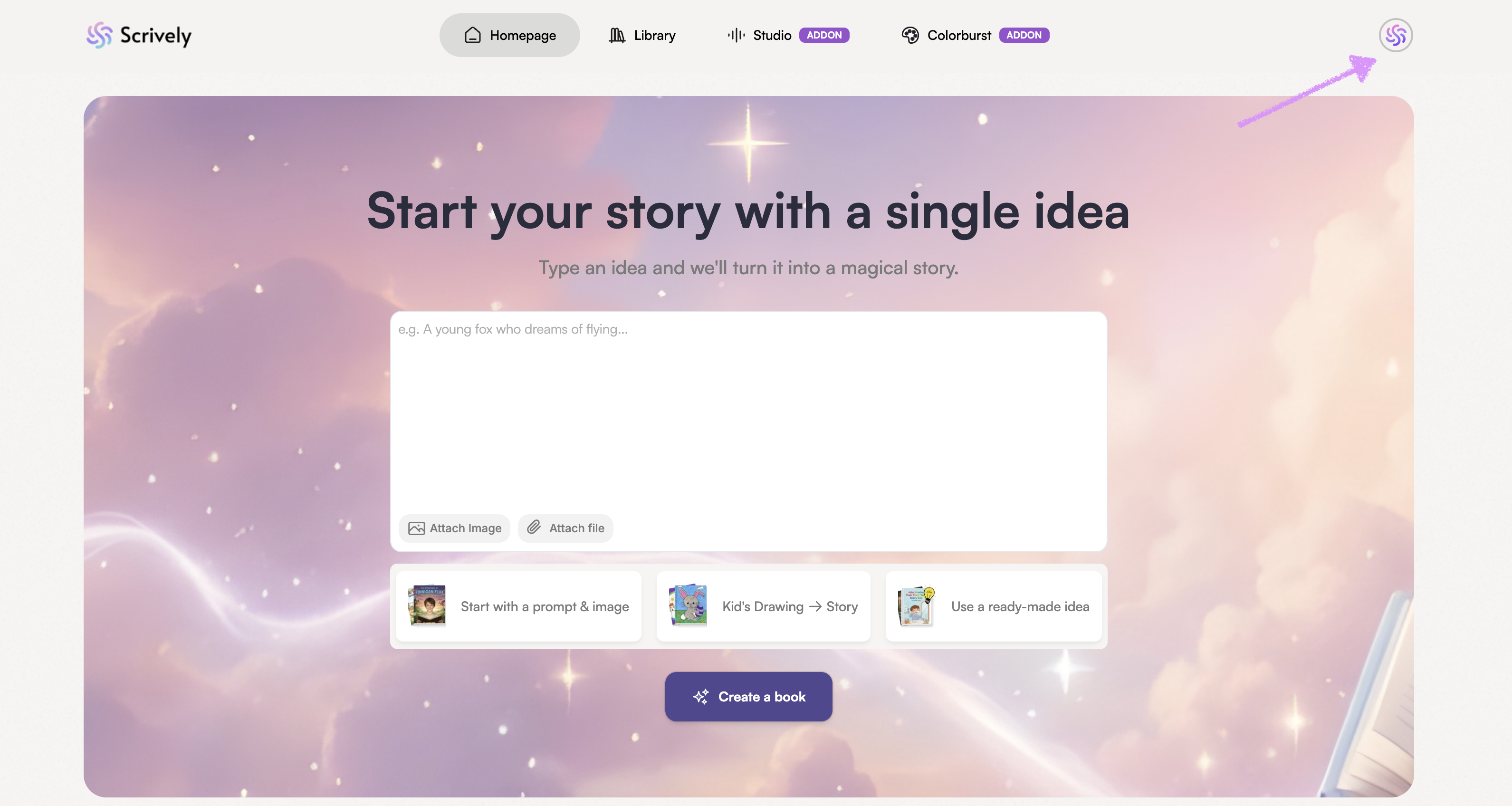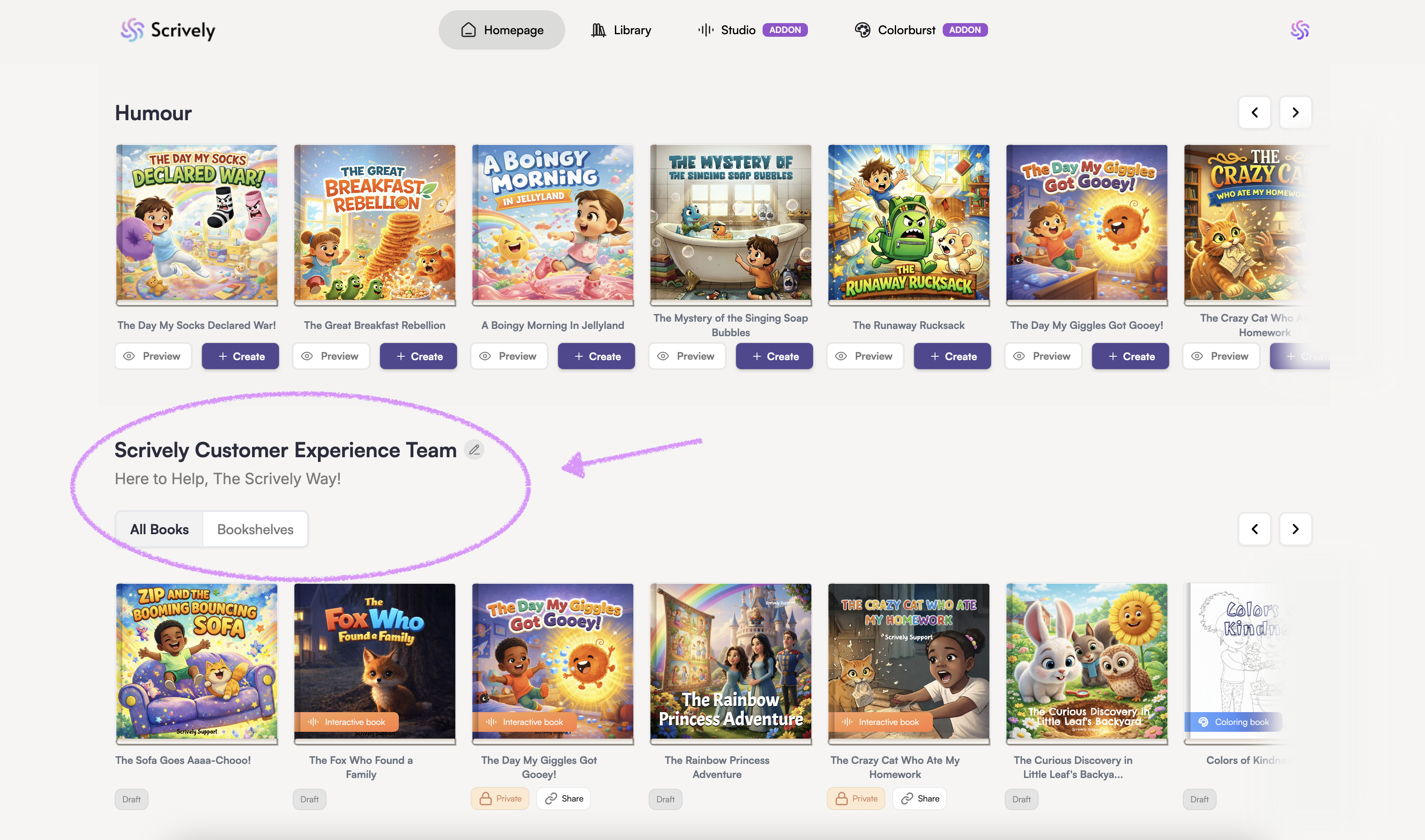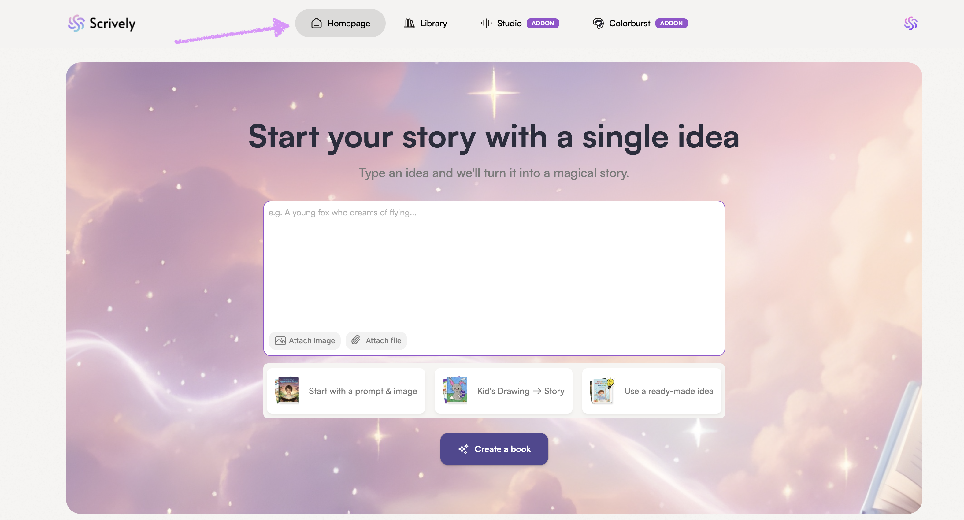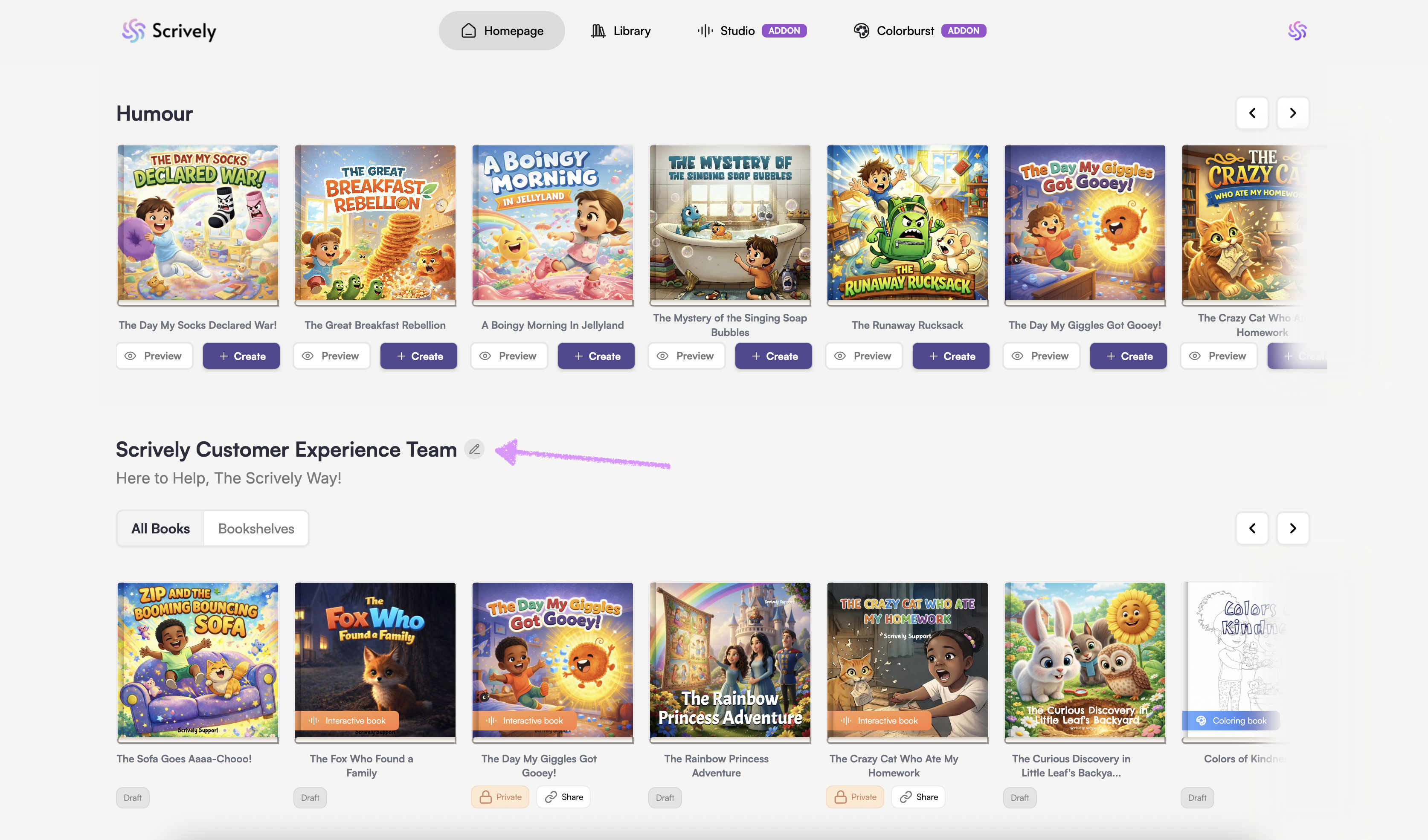After creating your storybook, it will appear in your library at the bottom of the Homepage.