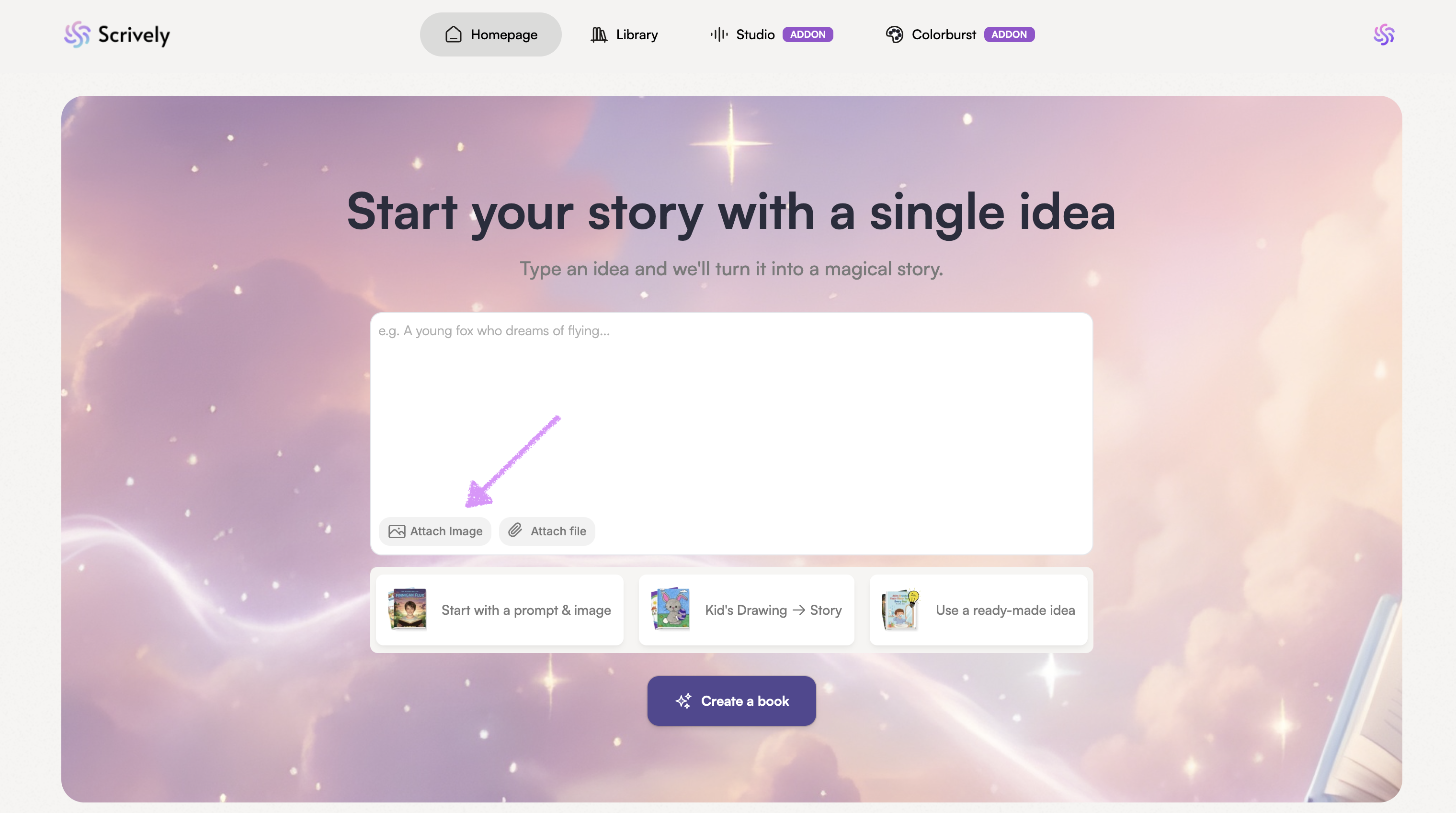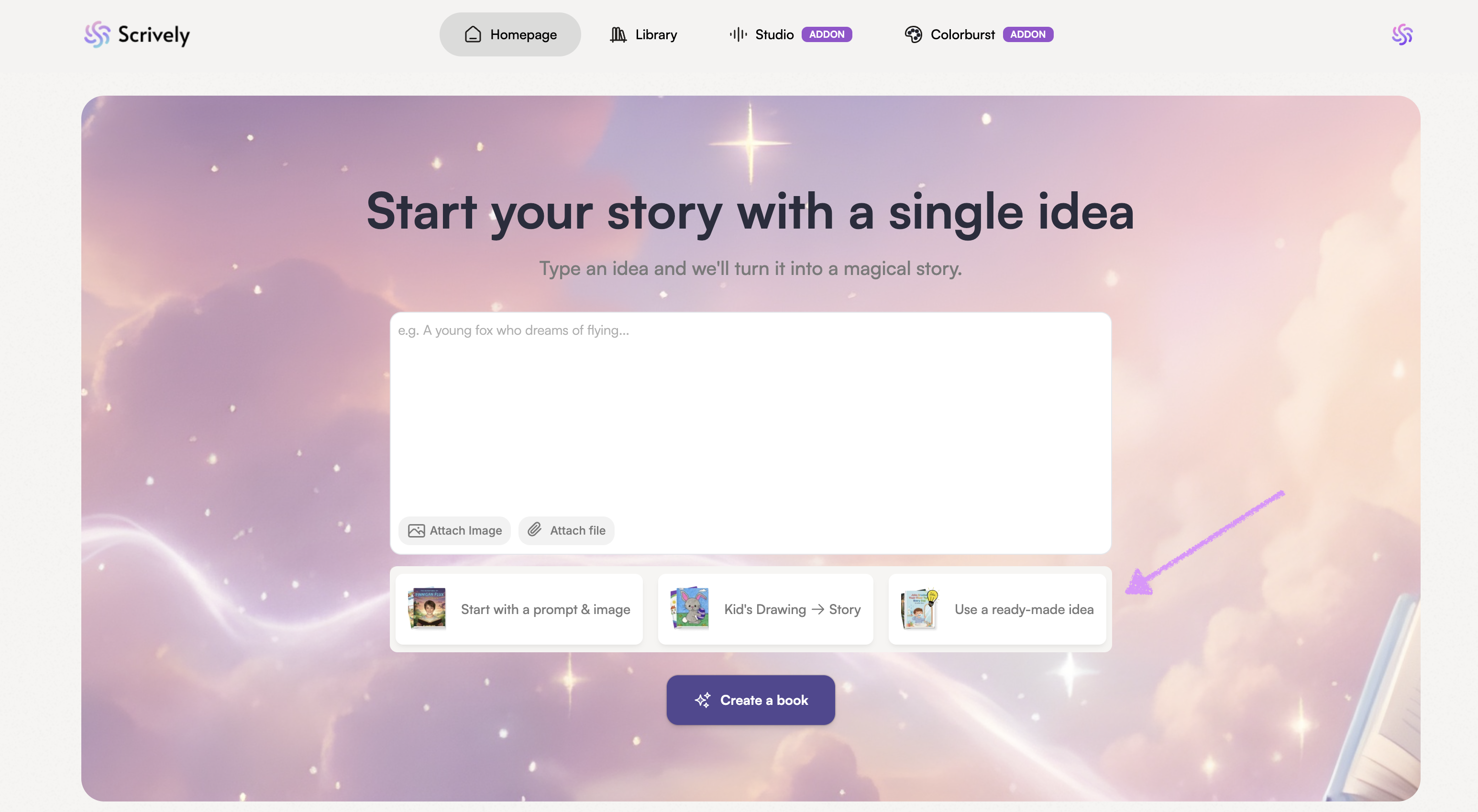 Below the story box, we offer three additional ways to generate your storybook: use a prompt with an image, upload a drawing, or choose from a ready-made idea.