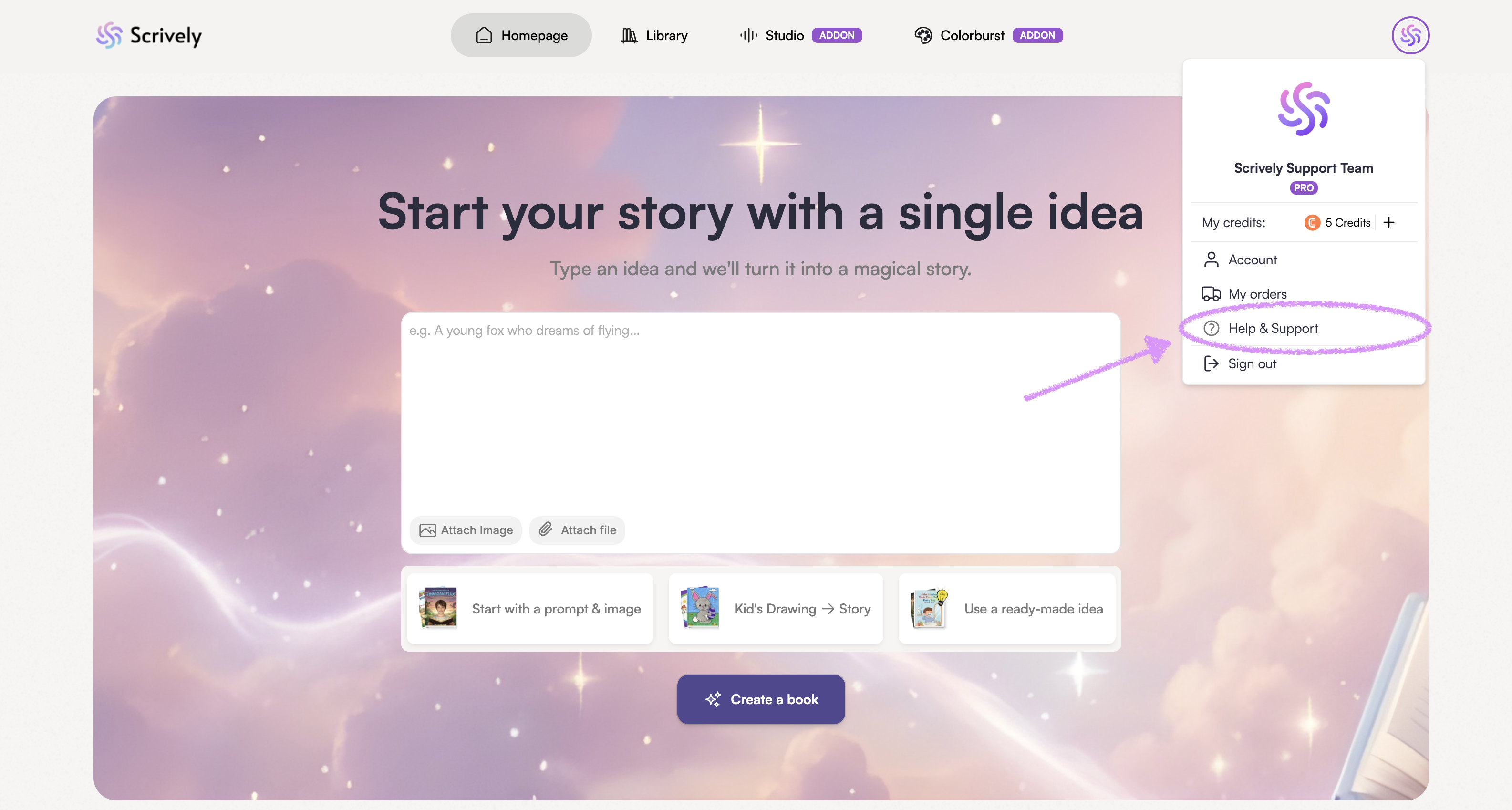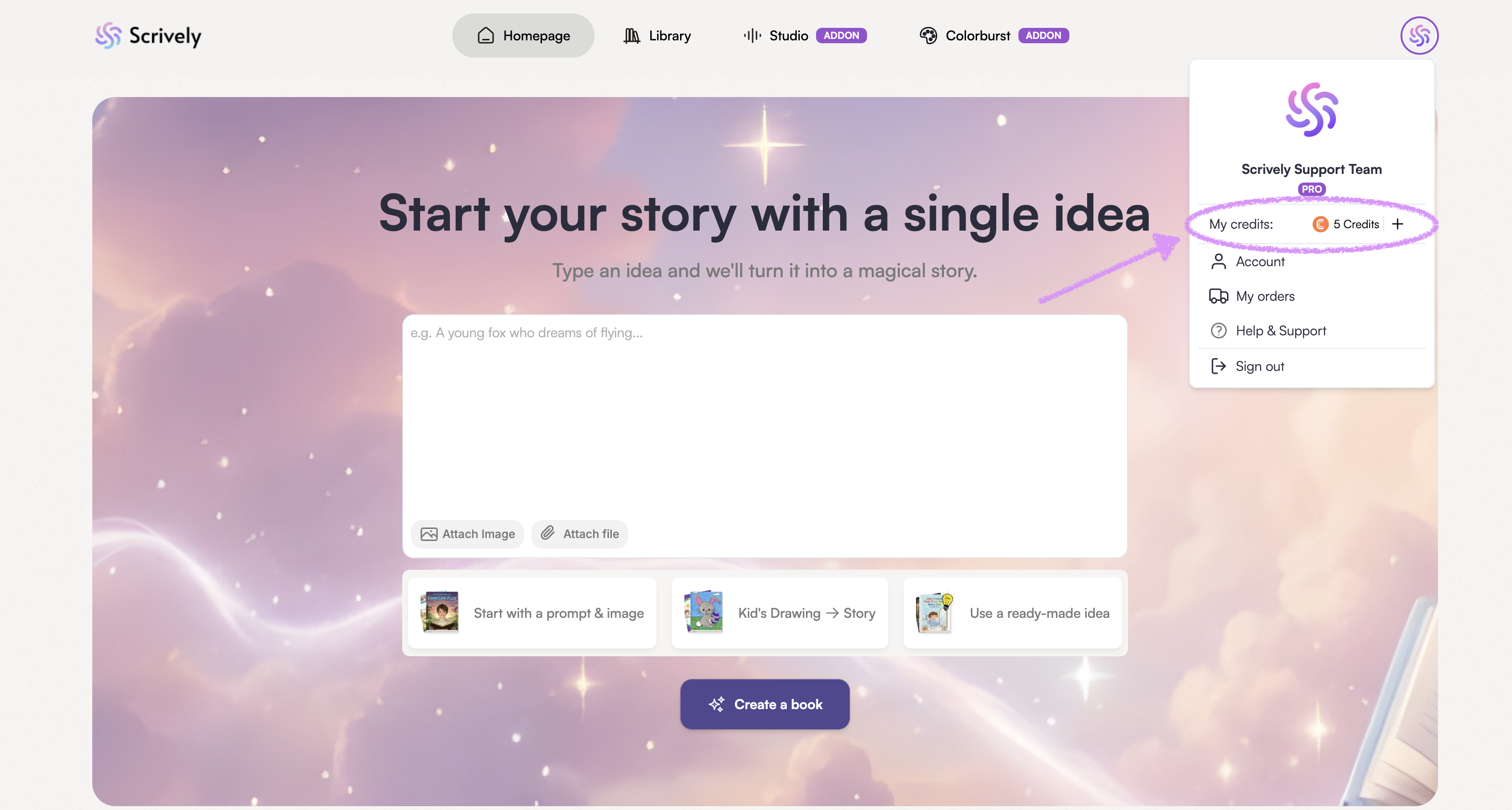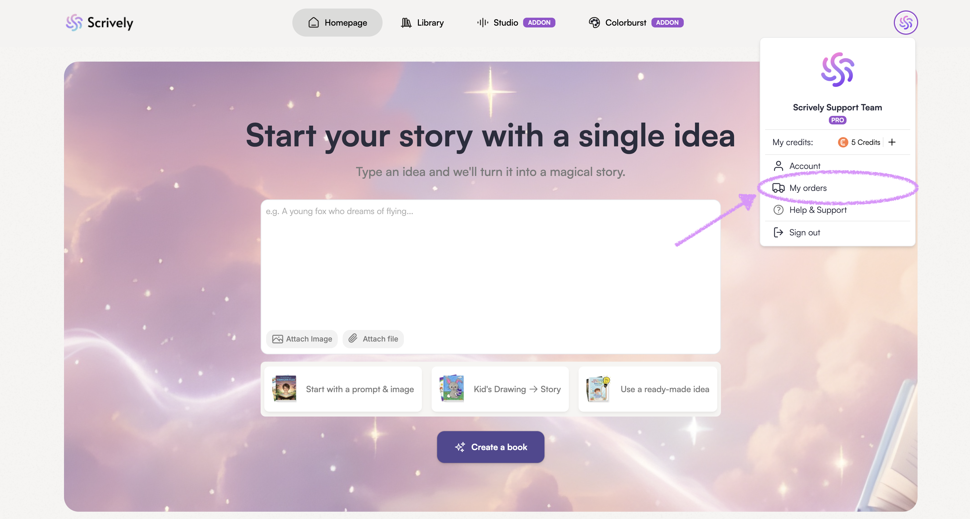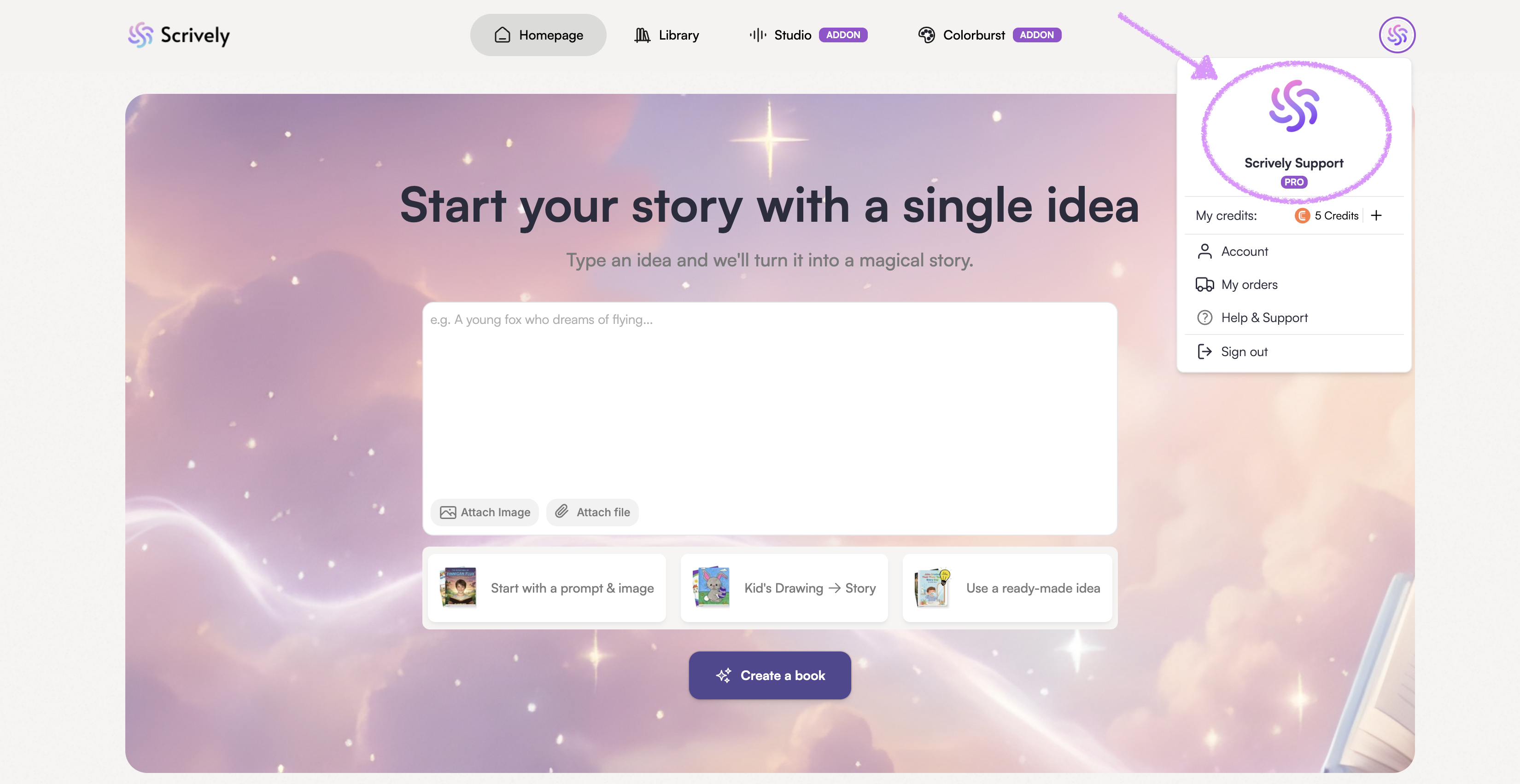 To manage your account, click on your avatar at the top right corner of the Homepage. Here you can review your plan information, credits for purchasing hardcover books, account preferences, orders, contact support and sign out.