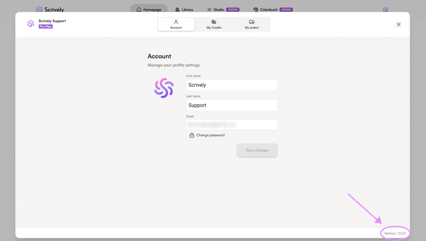 To update your account's email address, please reach out to our customer experience team. To facilitate this change, we will need proof of purchase, which can be provided in the form of the payment confirmation receipt sent to you.You can also check your current Scrively version in the bottom-right corner of the Account tab.