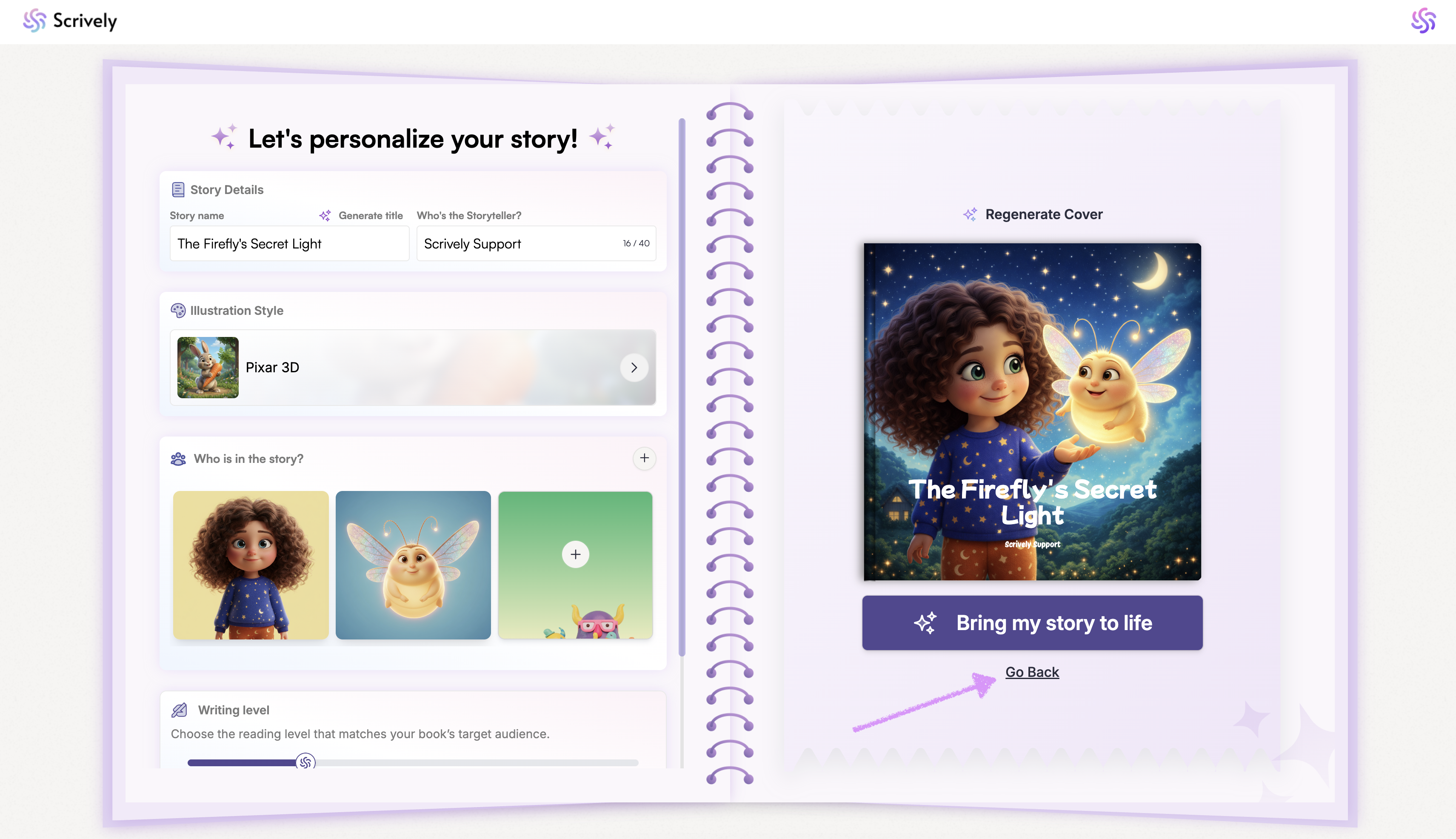 After you provide Scrively with your story details, you’ll be taken to the Story Builder, where you can expand your narrative, add more details, and shape your story exactly how you envision it.