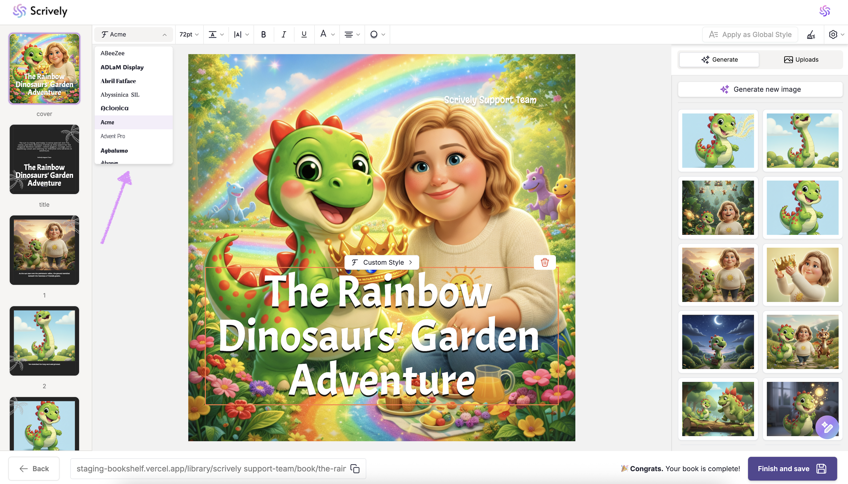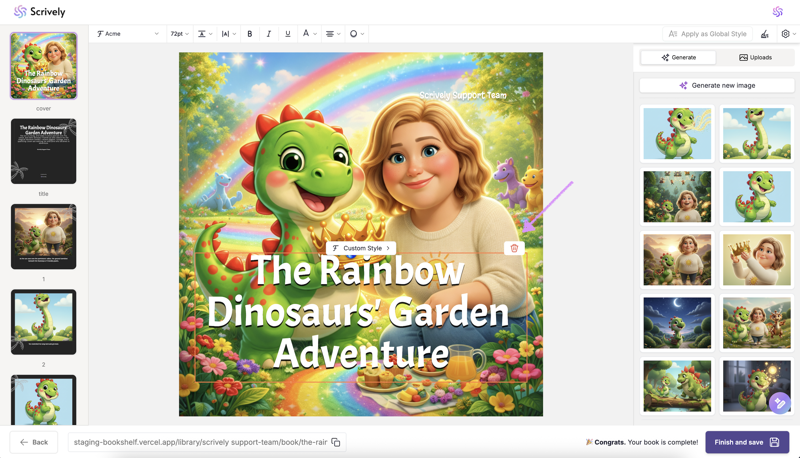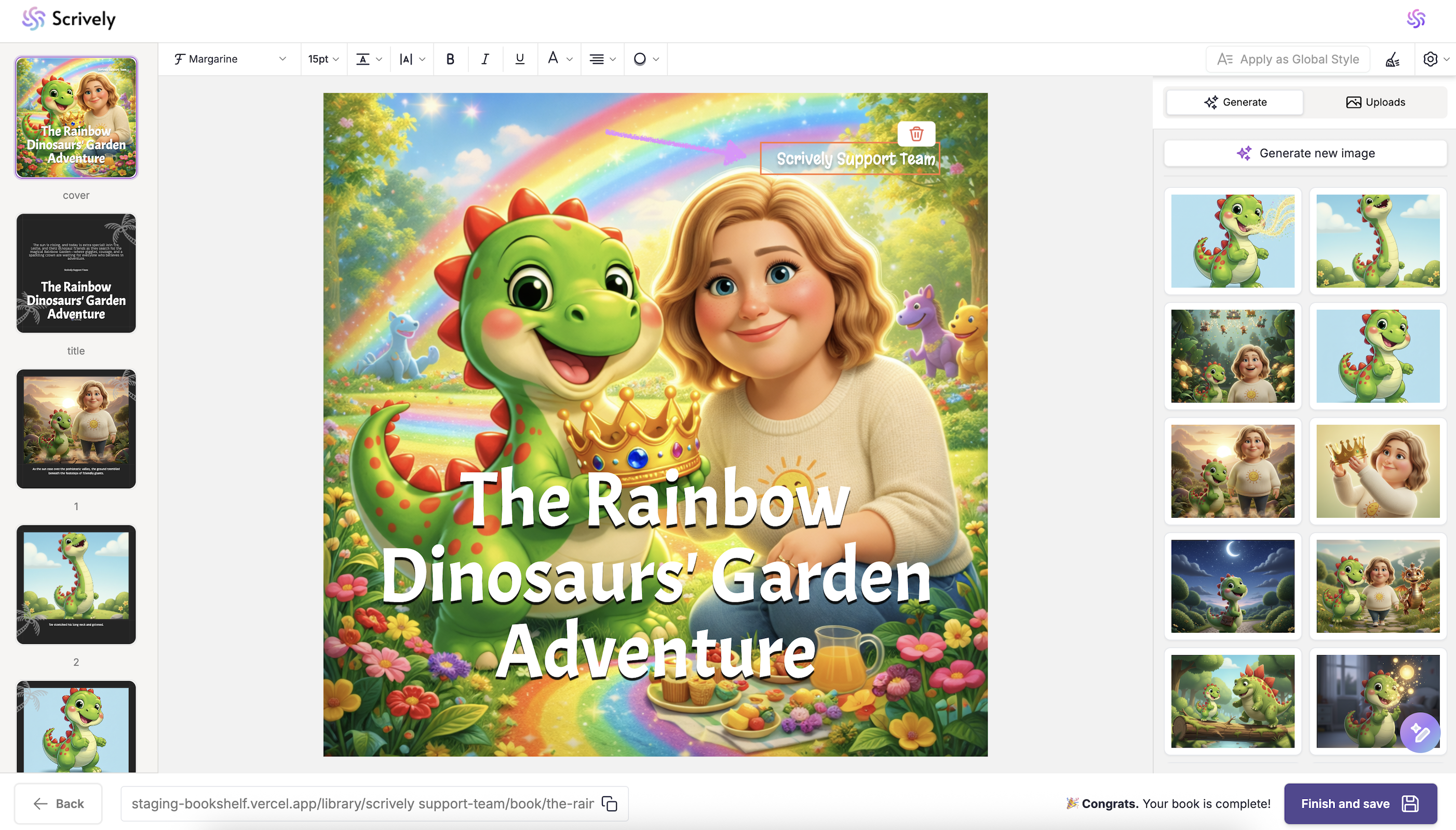 Once your story is written, it’s time to bring it to life visually. Scrively’s design tools make it easy to personalize your book’s appearance. From fonts and layouts to illustrations and page styles, design your book so that it looks just as good as it reads.