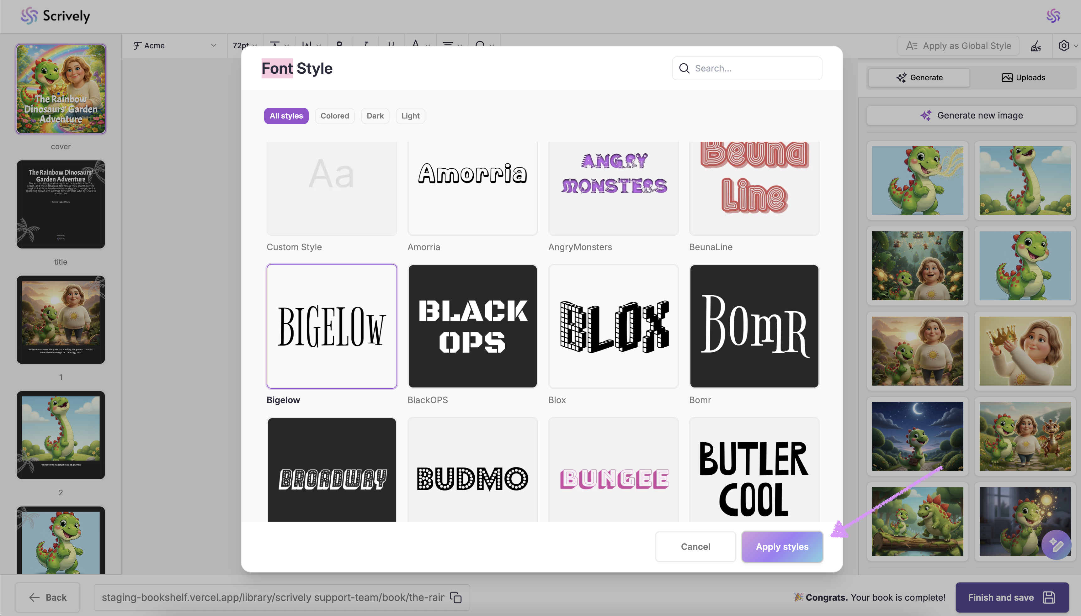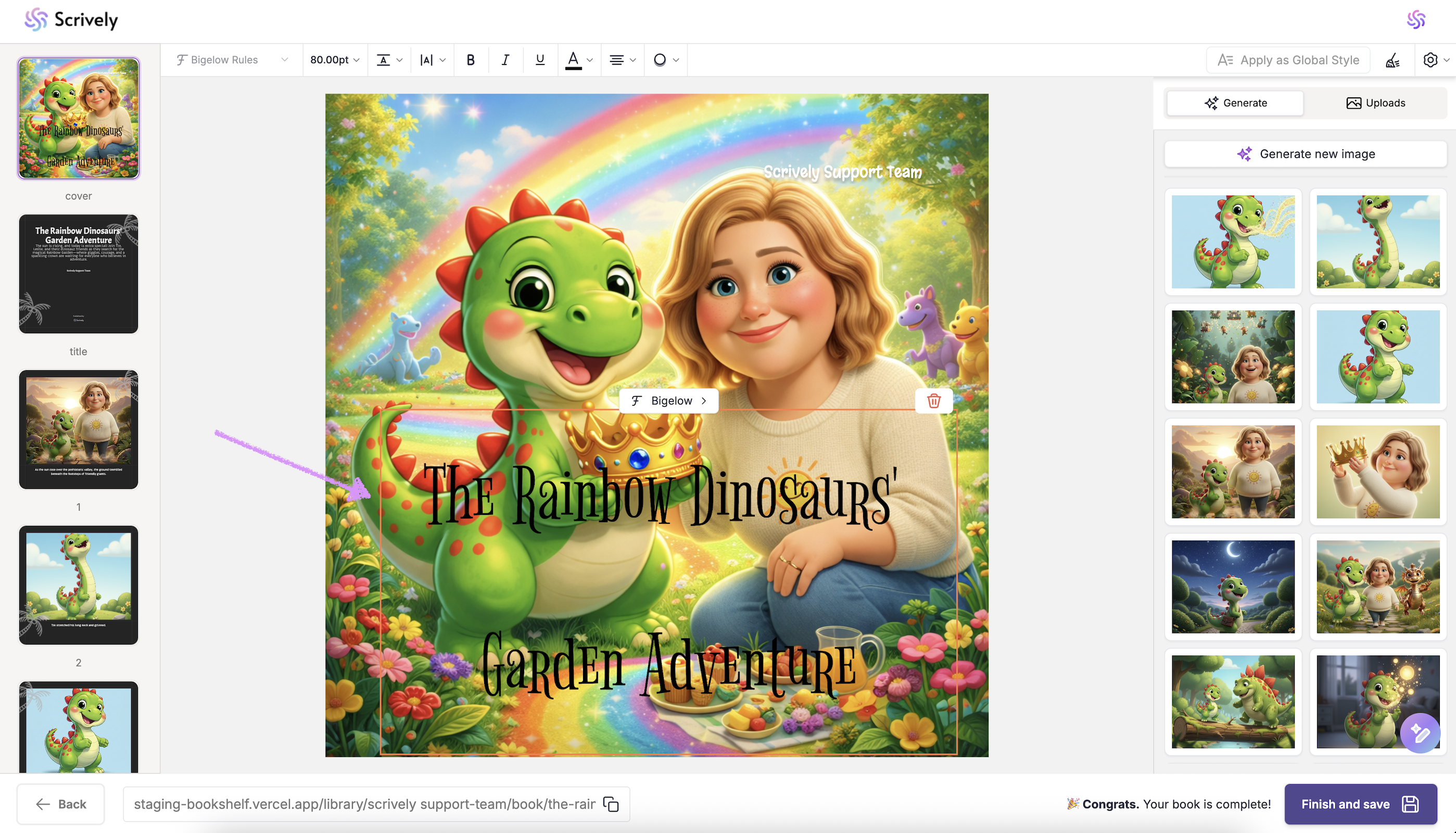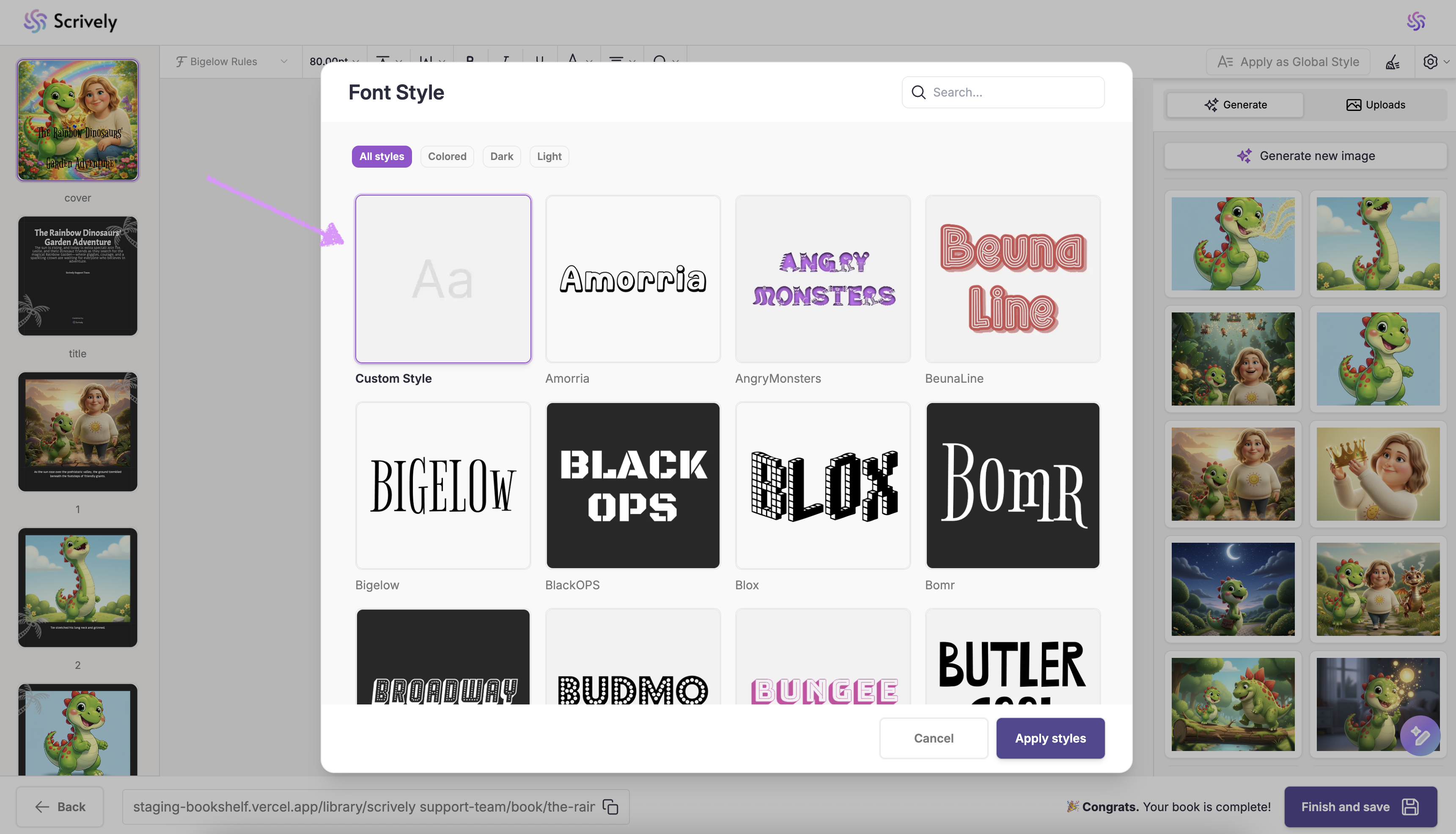 Once your story is written, it’s time to bring it to life visually. Scrively’s design tools make it easy to personalize your book’s appearance. From fonts and layouts to illustrations and page styles, design your book so that it looks just as good as it reads.