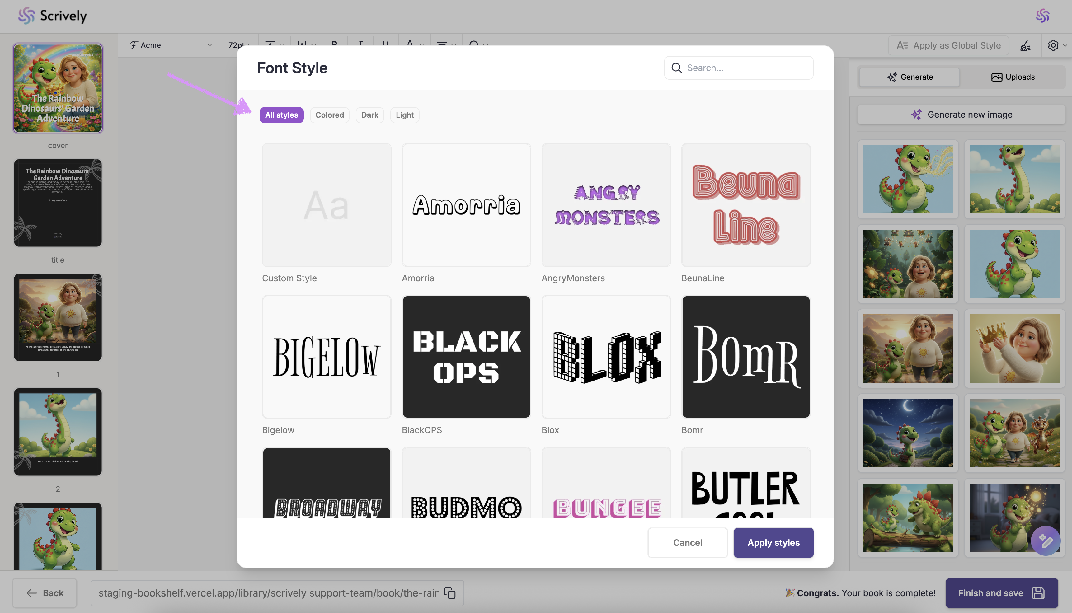 Explore font styles by filtering through all styles, colored, dark, or light options.
