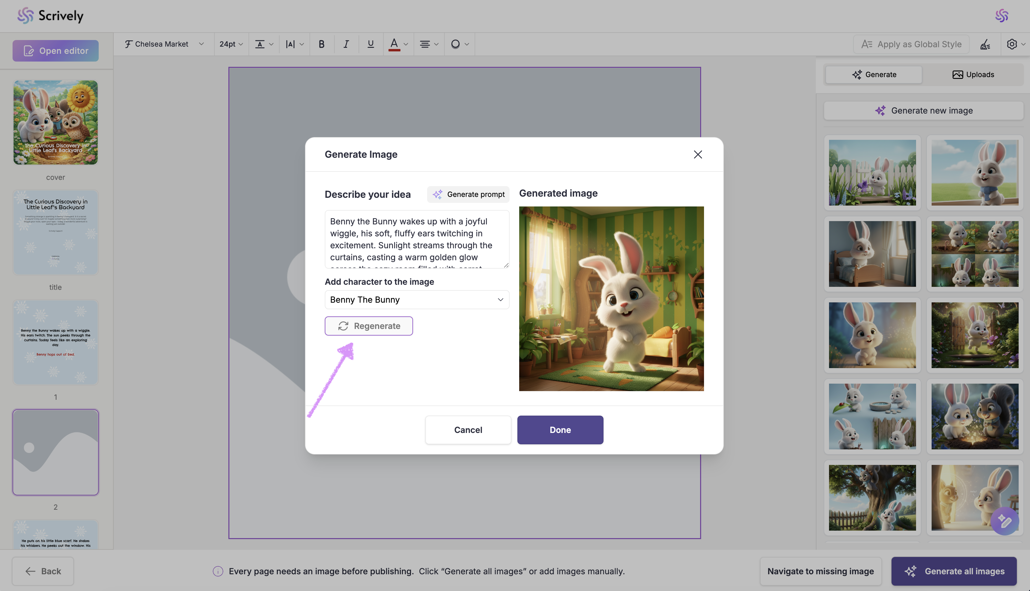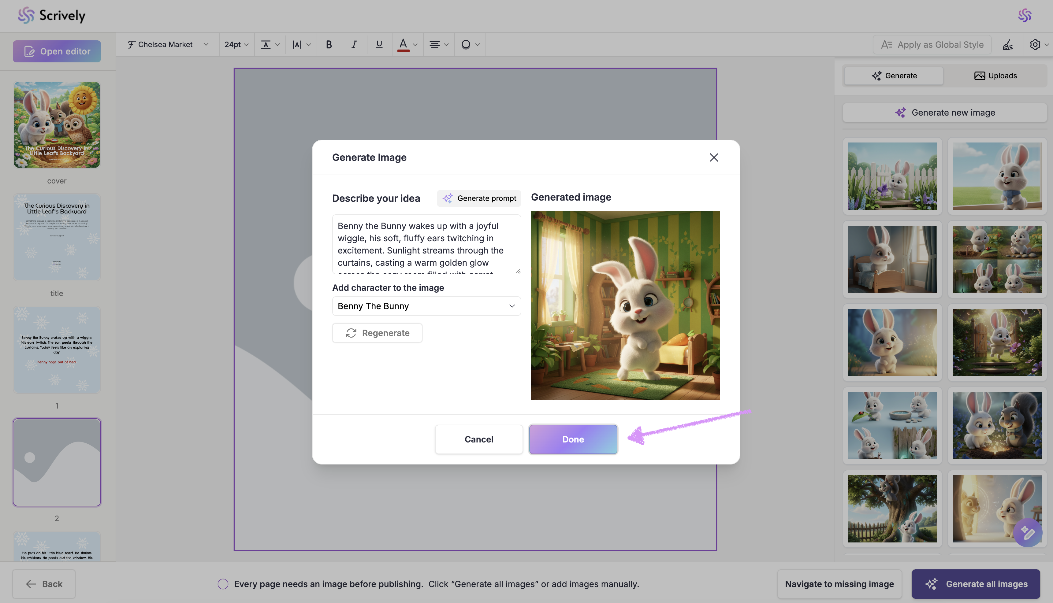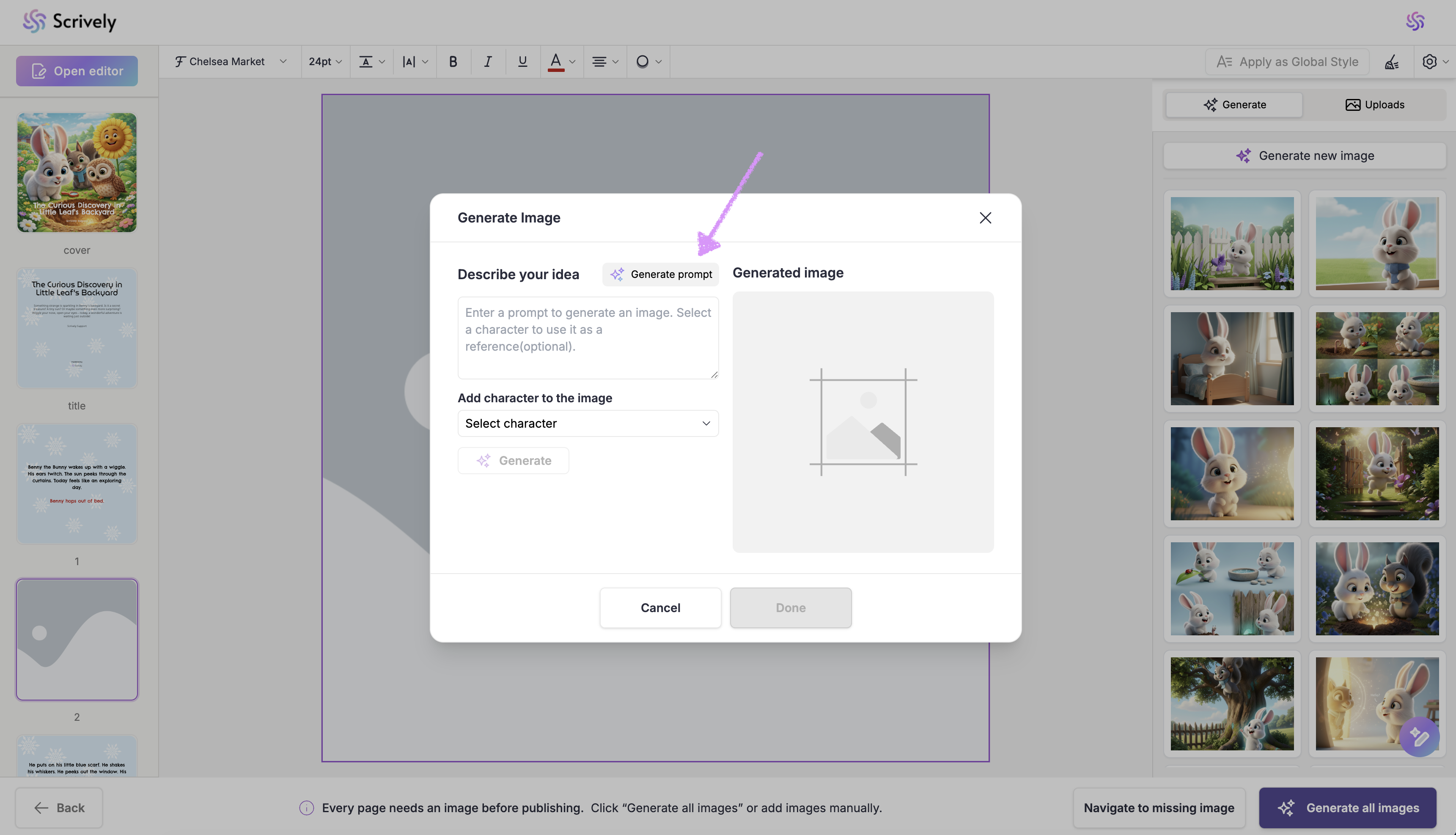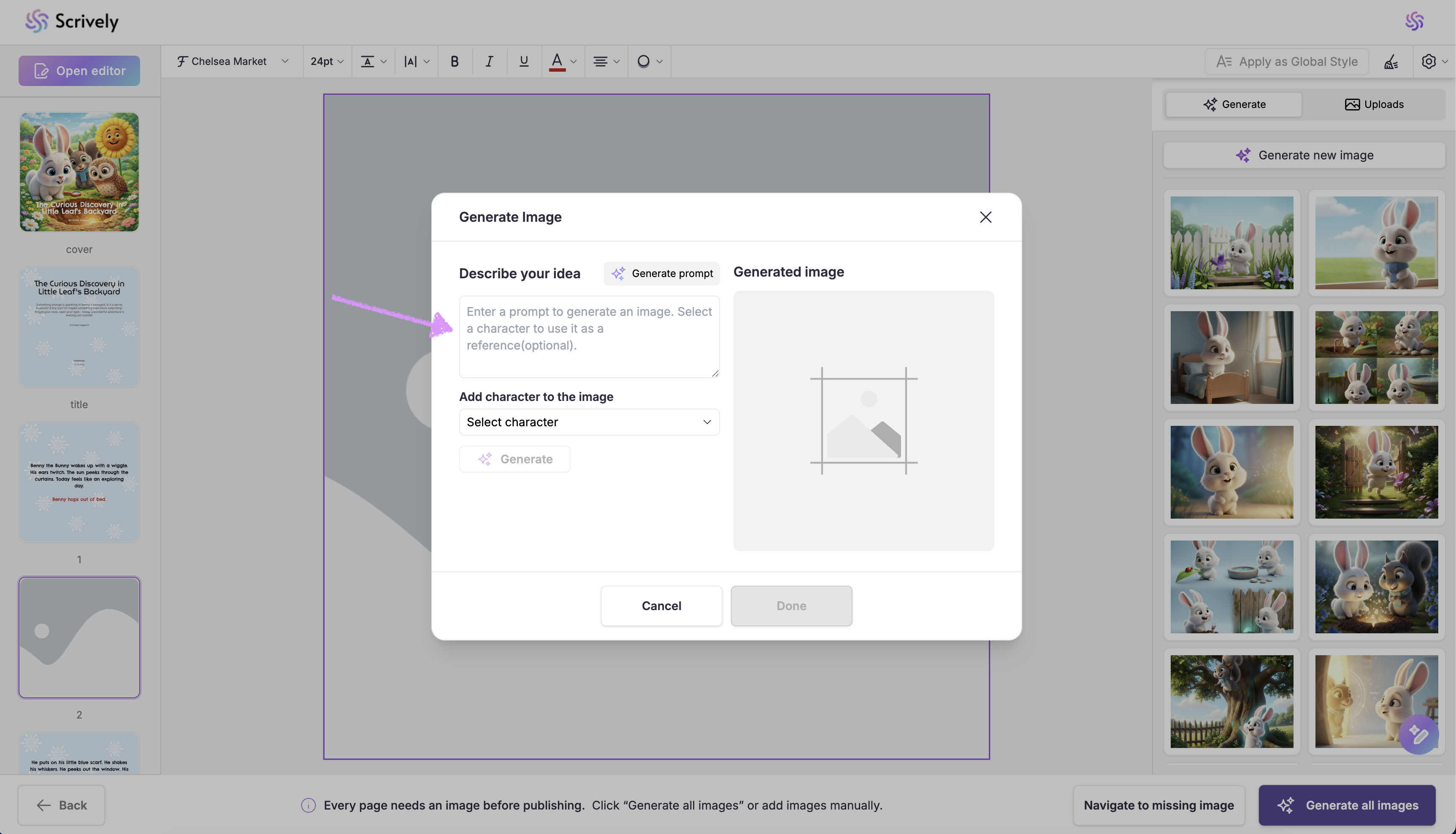 If you’d prefer not to generate images for each page, click on “Generate All Images” in the bottom right corner. Scrively will automatically create images for every page based on your story’s context.