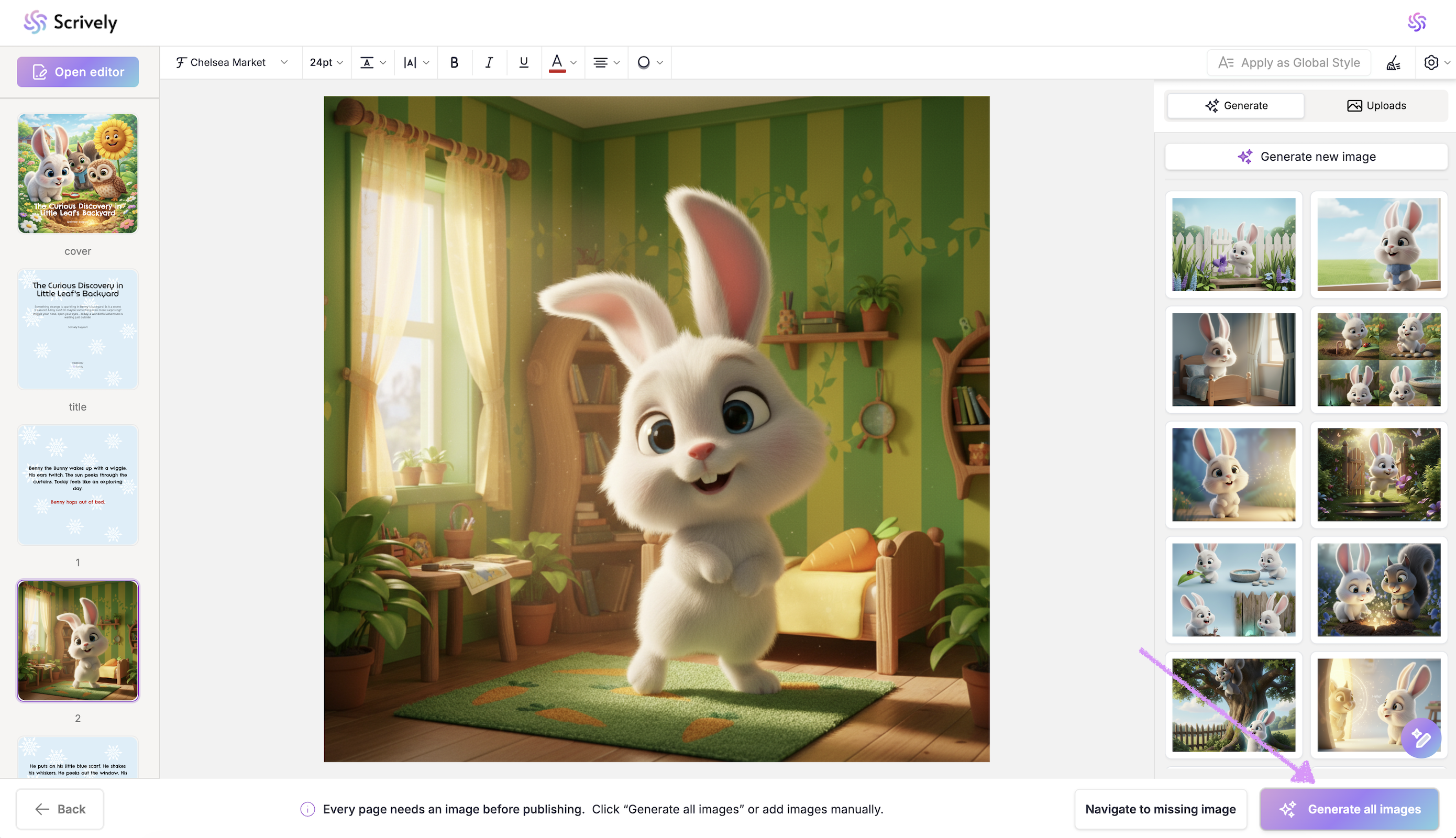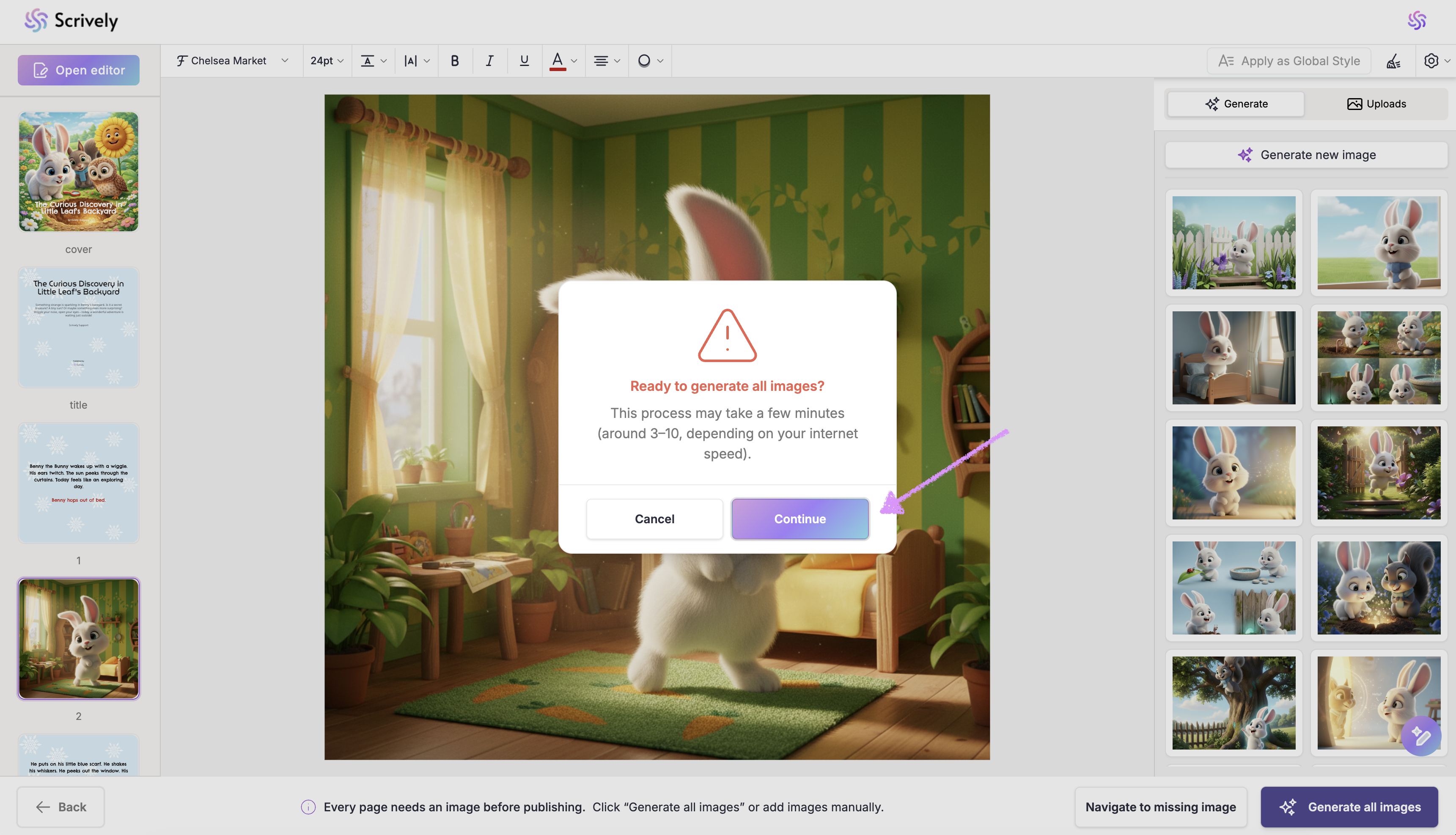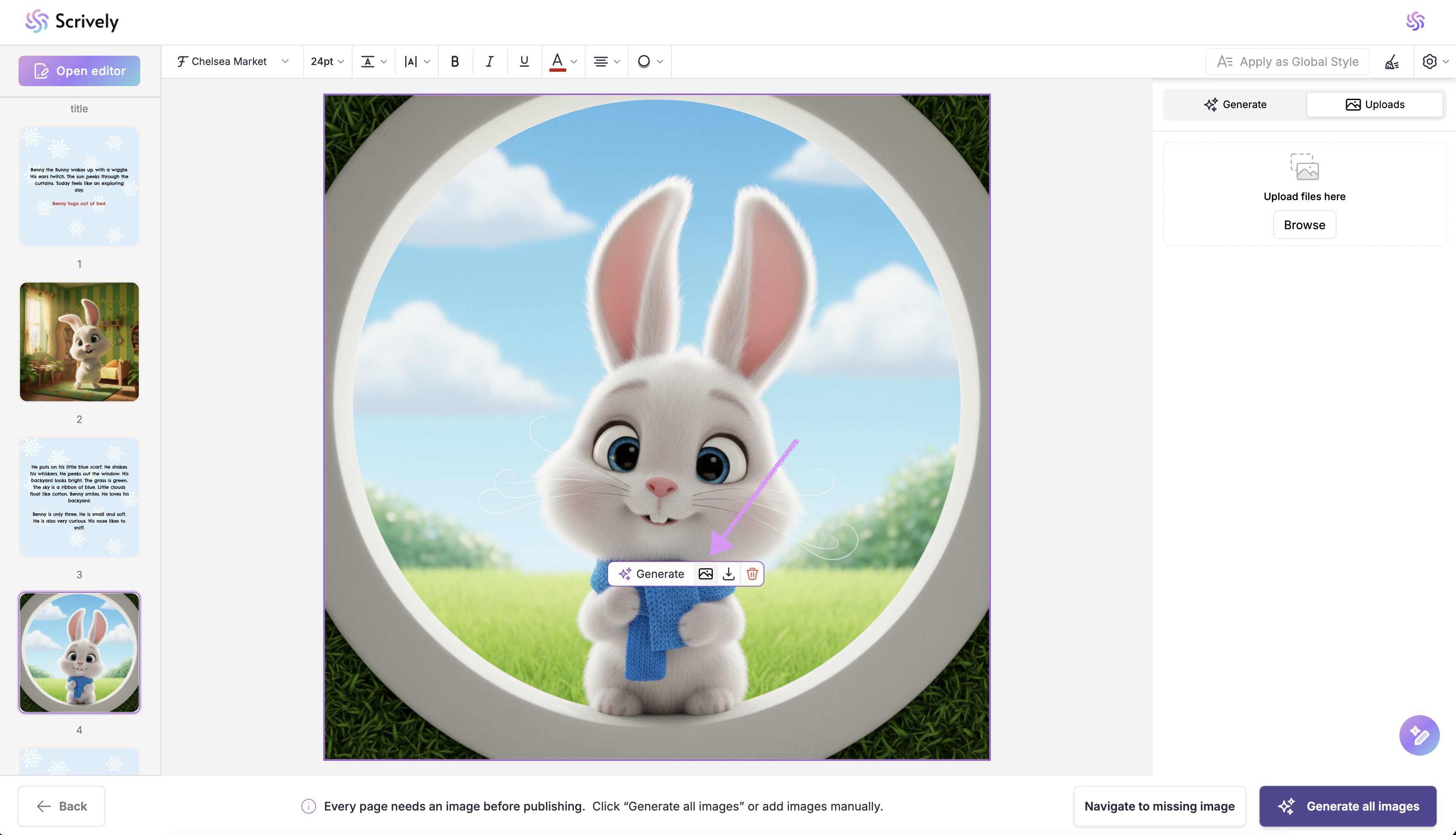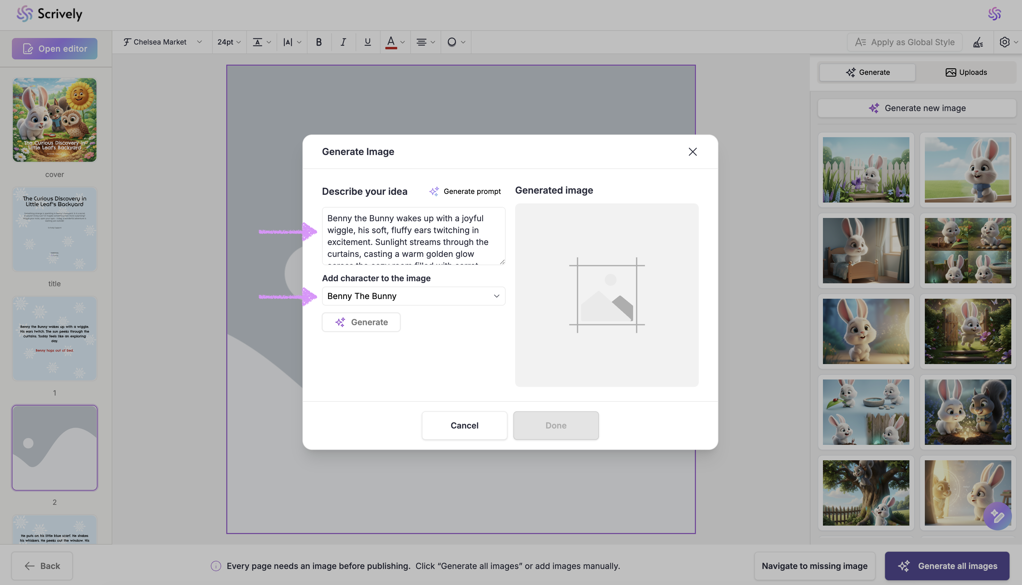 If you’d prefer not to generate images for each page, click on “Generate All Images” in the bottom right corner. Scrively will automatically create images for every page based on your story’s context.