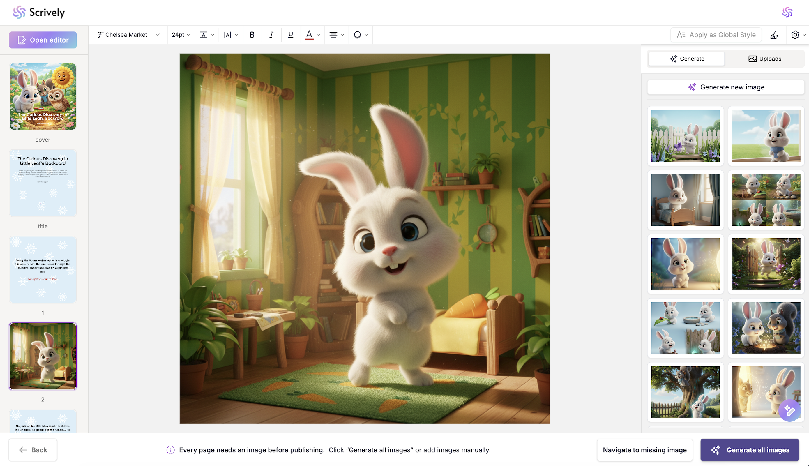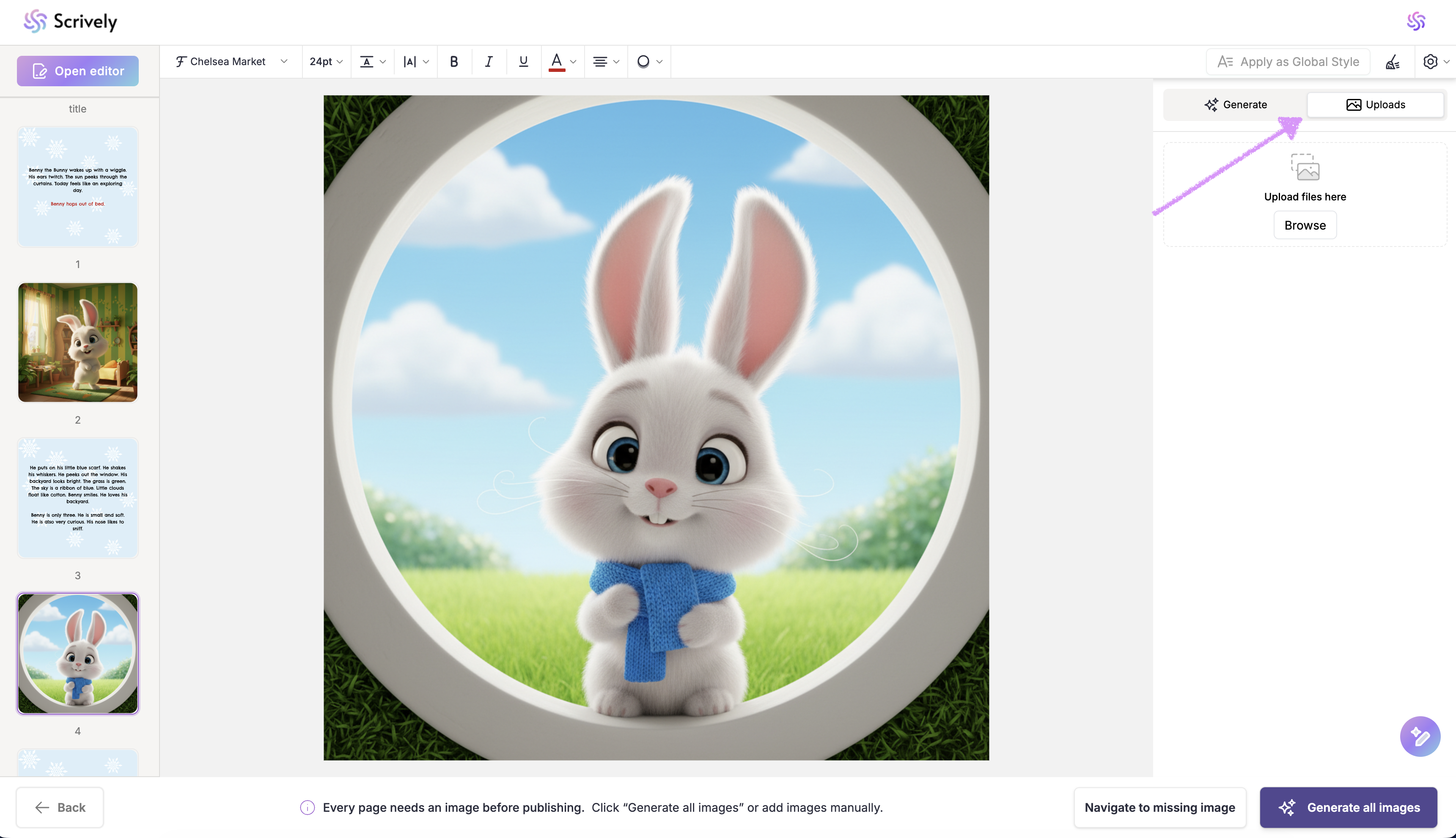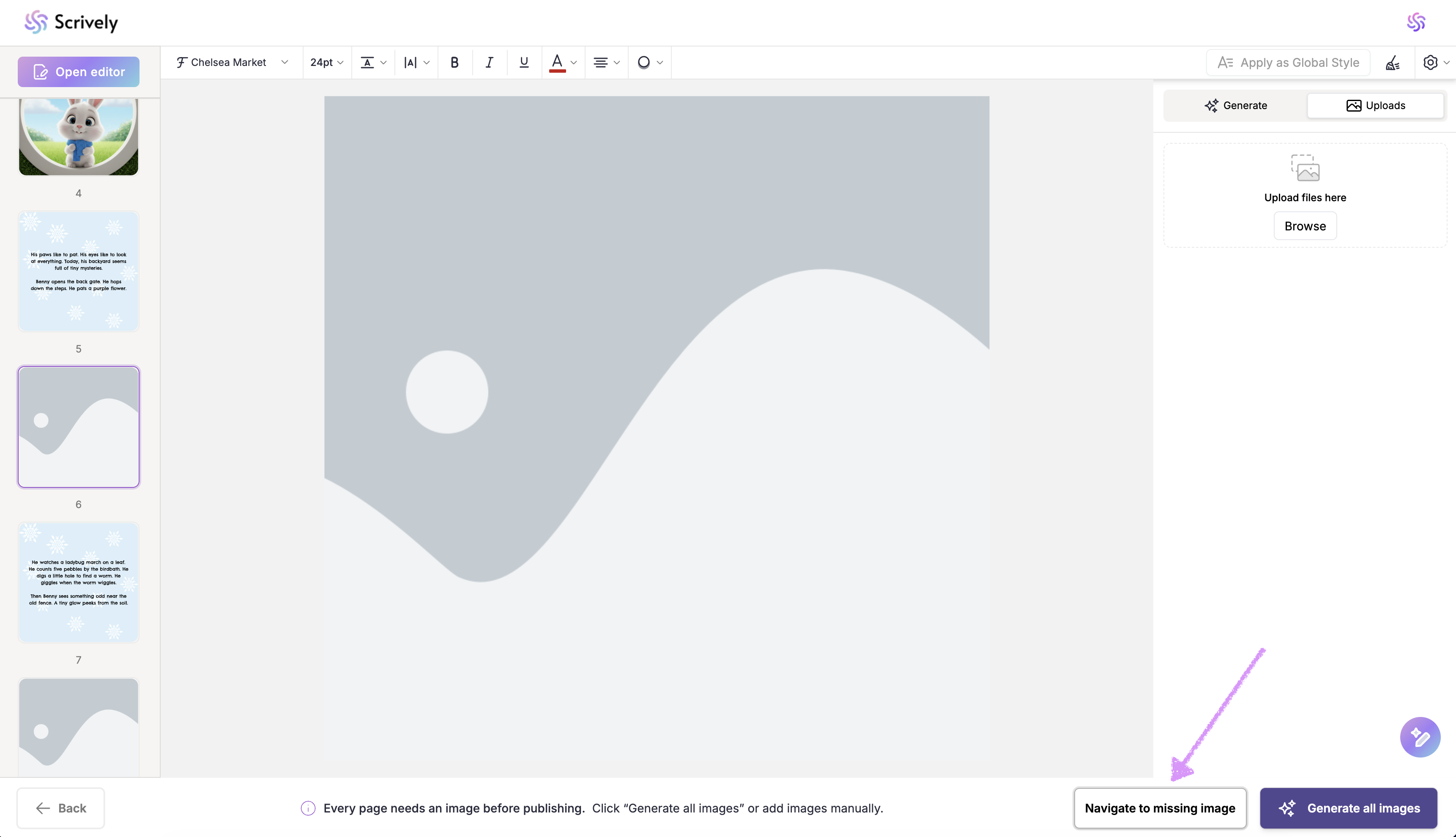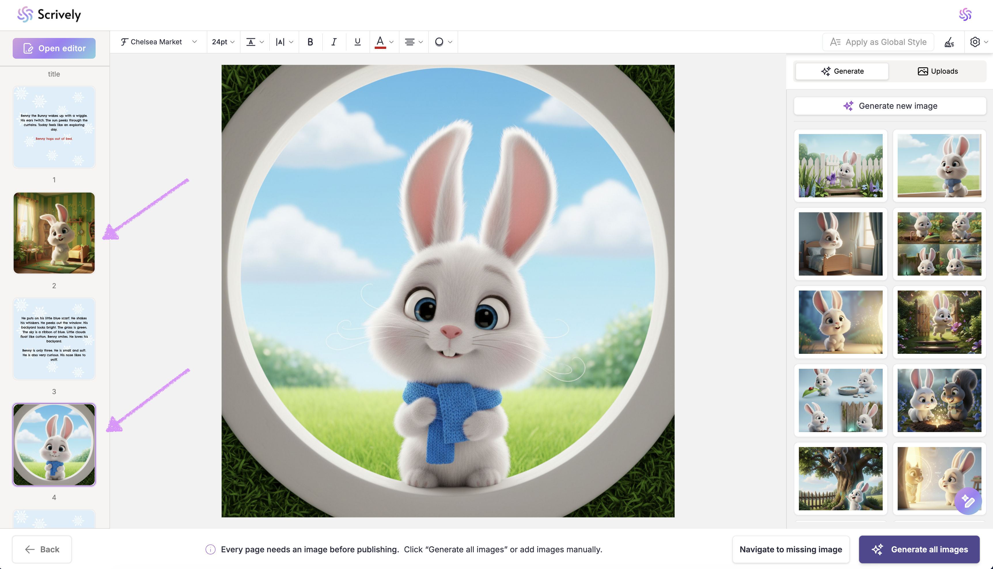If you’d prefer not to generate images for each page, click on “Generate All Images” in the bottom right corner. Scrively will automatically create images for every page based on your story’s context.