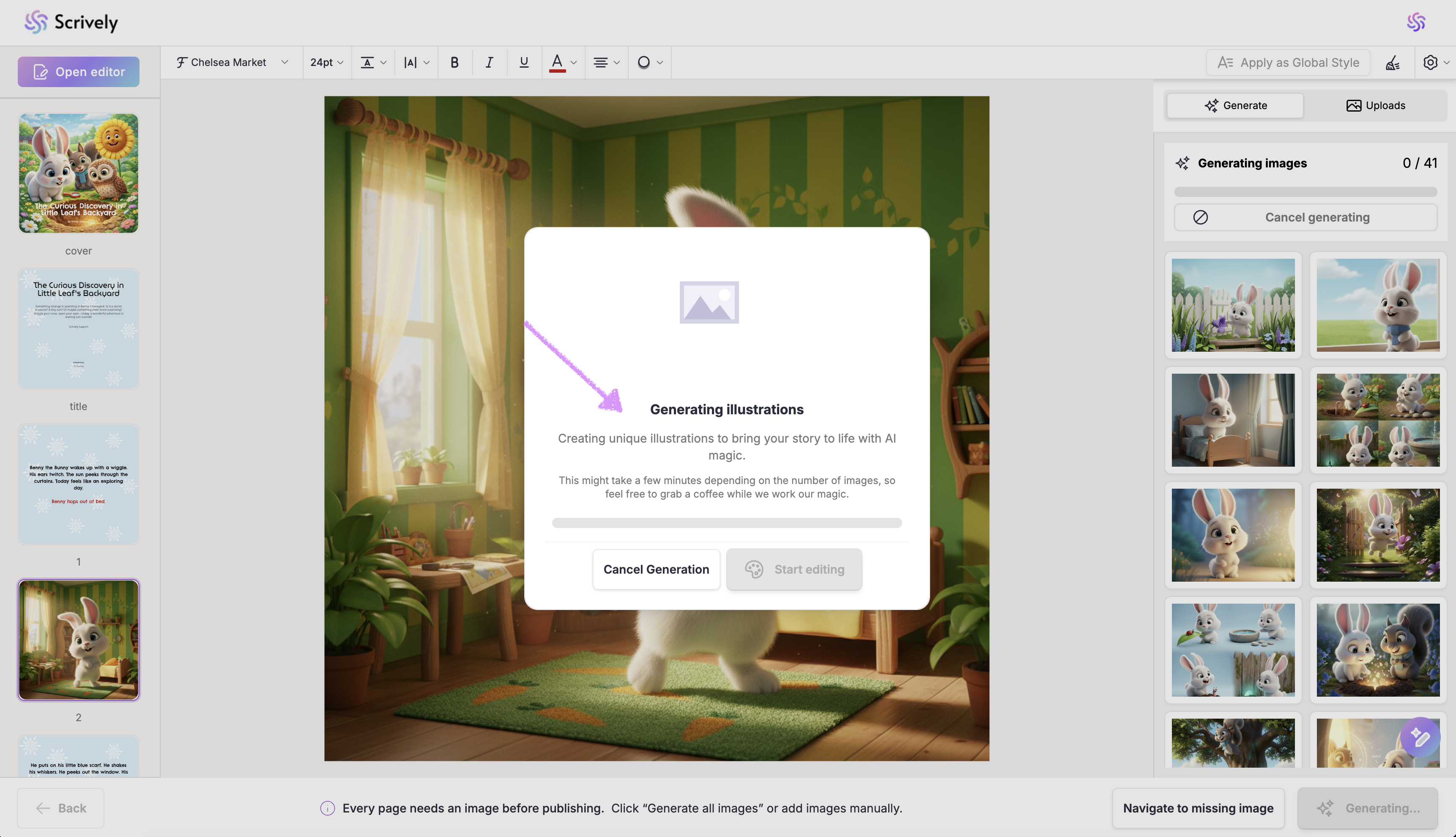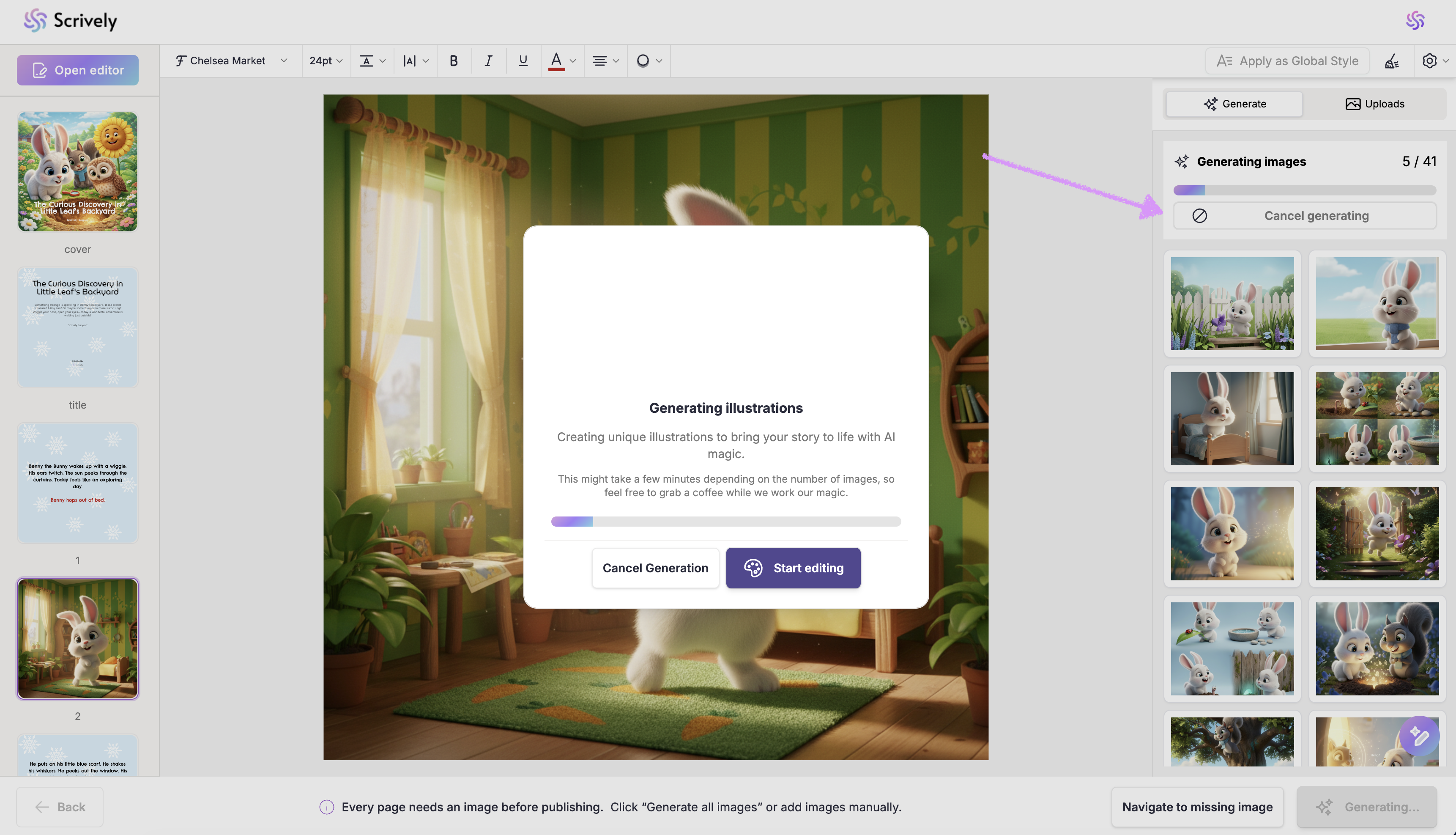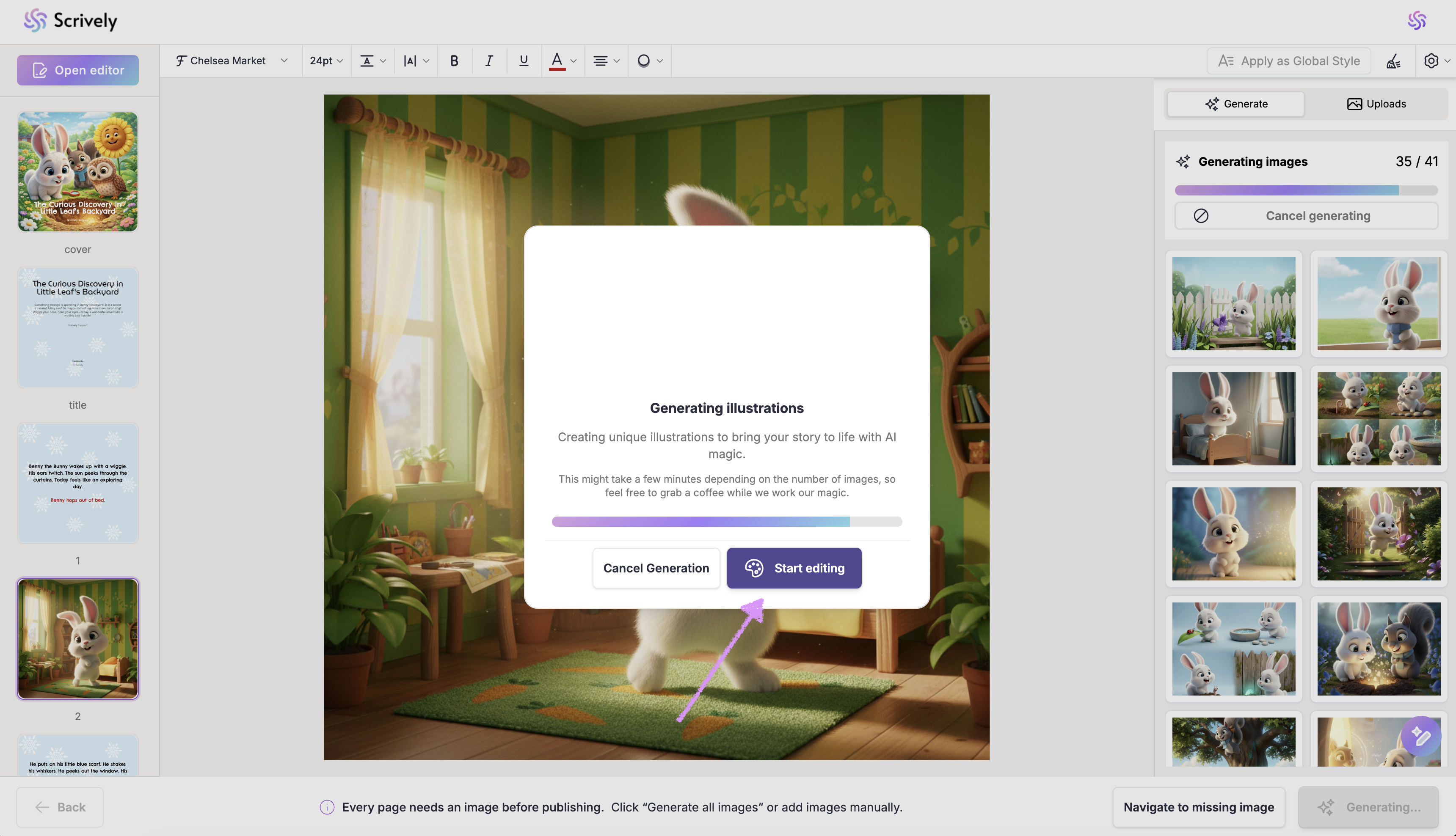Once your first five images are ready, you’ll see the “Start editing” option. This lets you continue working on your book while the rest of the images finish generating in the background.