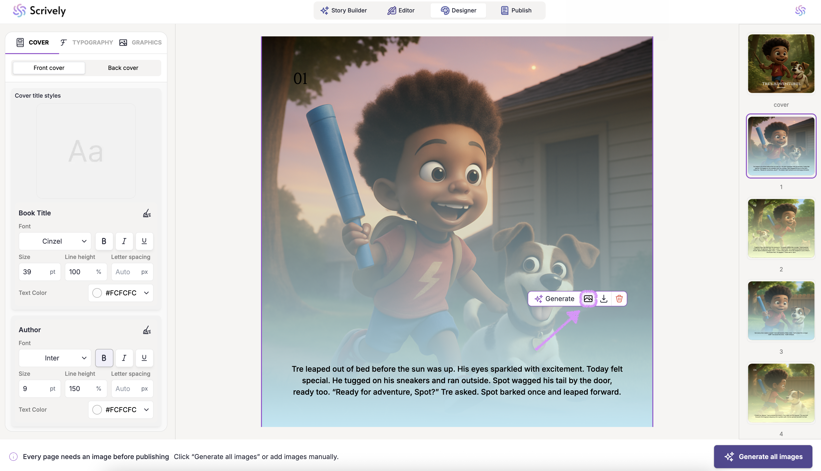 If you’d prefer not to generate images for each page, click on “Generate All Images” in the bottom right corner. Scrively will automatically create images for every page based on your story’s context.