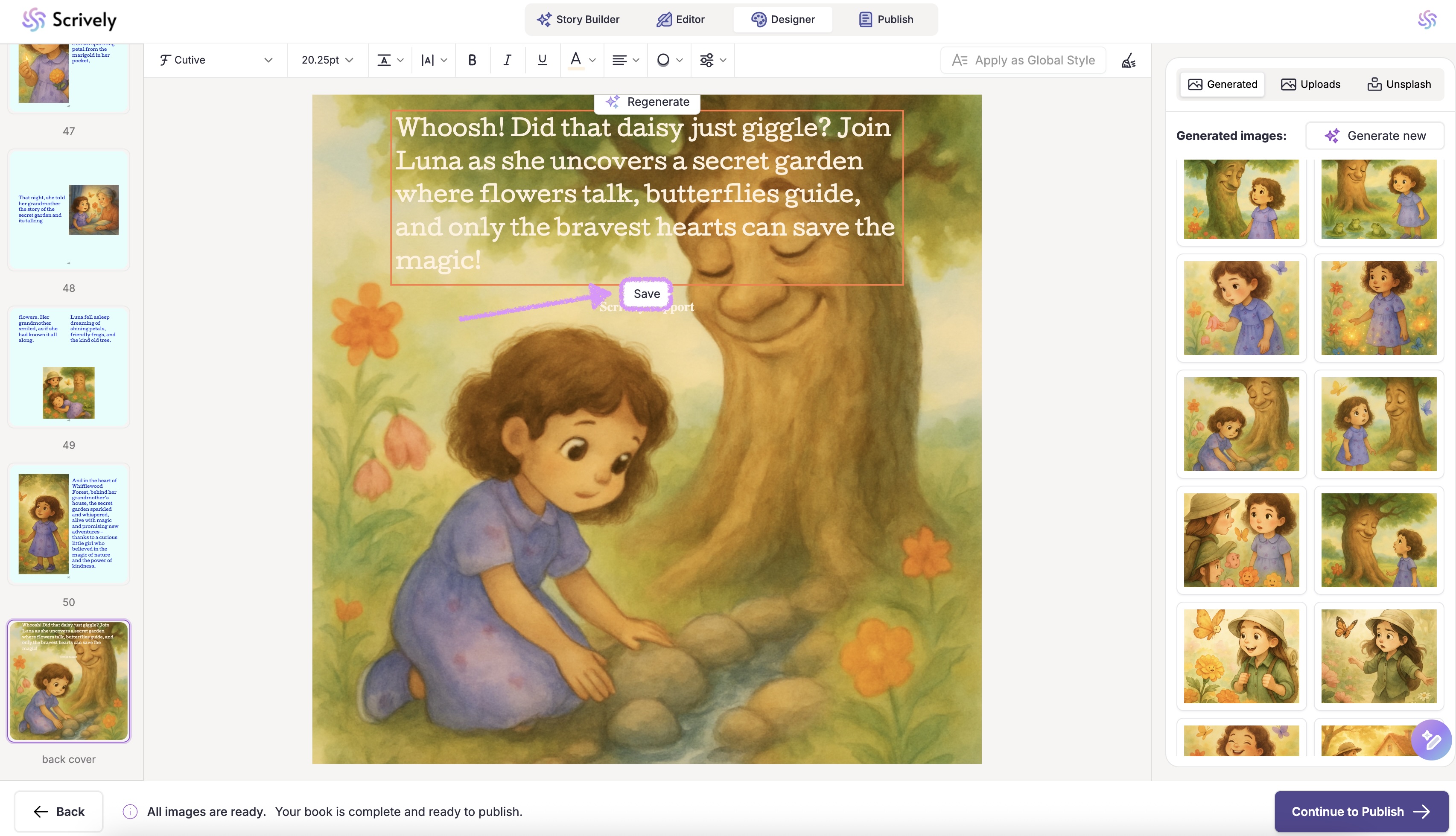 Alternatively, let Scrively do the writing for you. Click on “Generate” to have a compelling back cover blurb created based on your story.