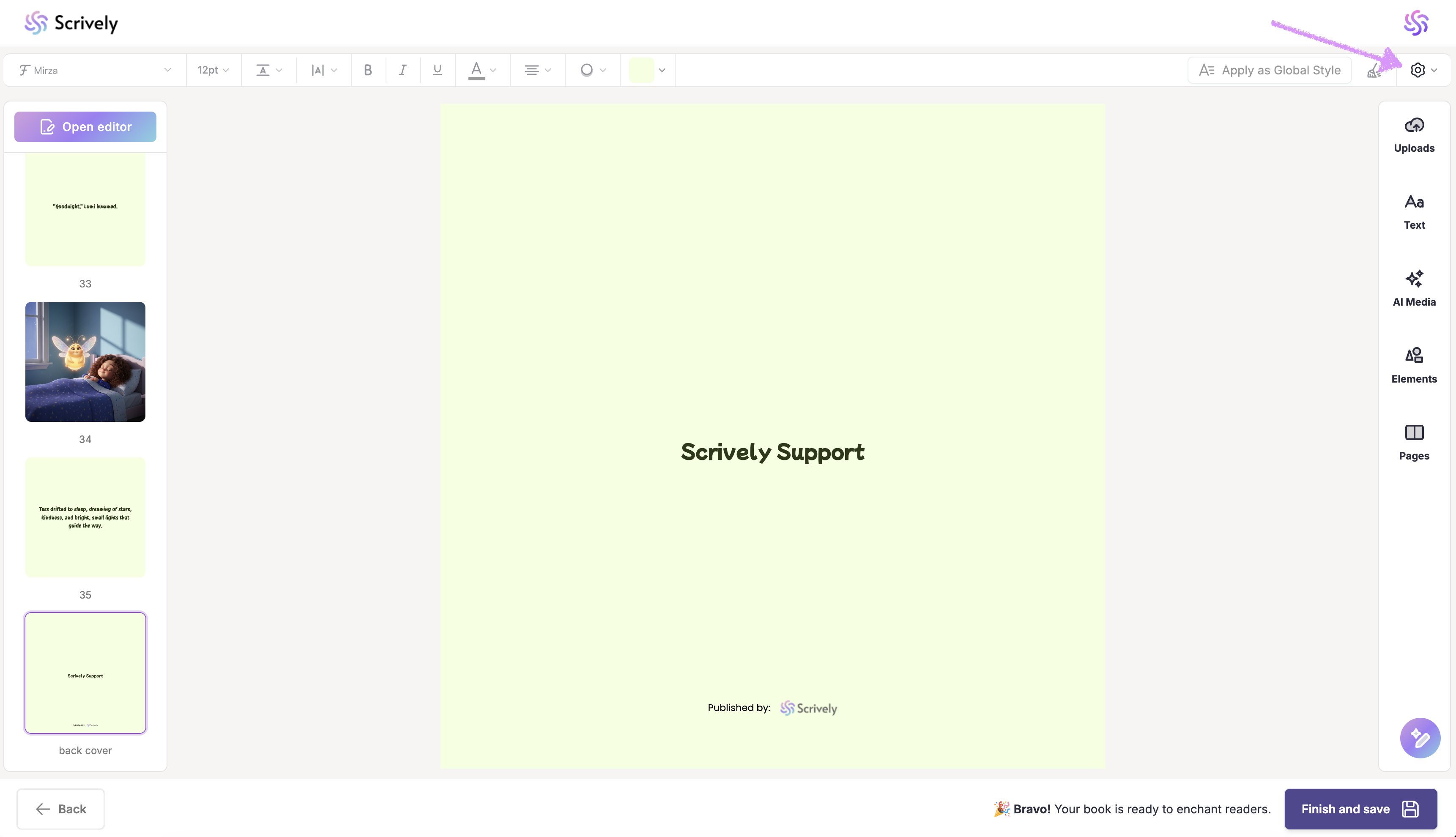 In the Designer (book layout view) navigate to your book's back cover page then, click on the settings gear in the top right side of the quick actions menu.