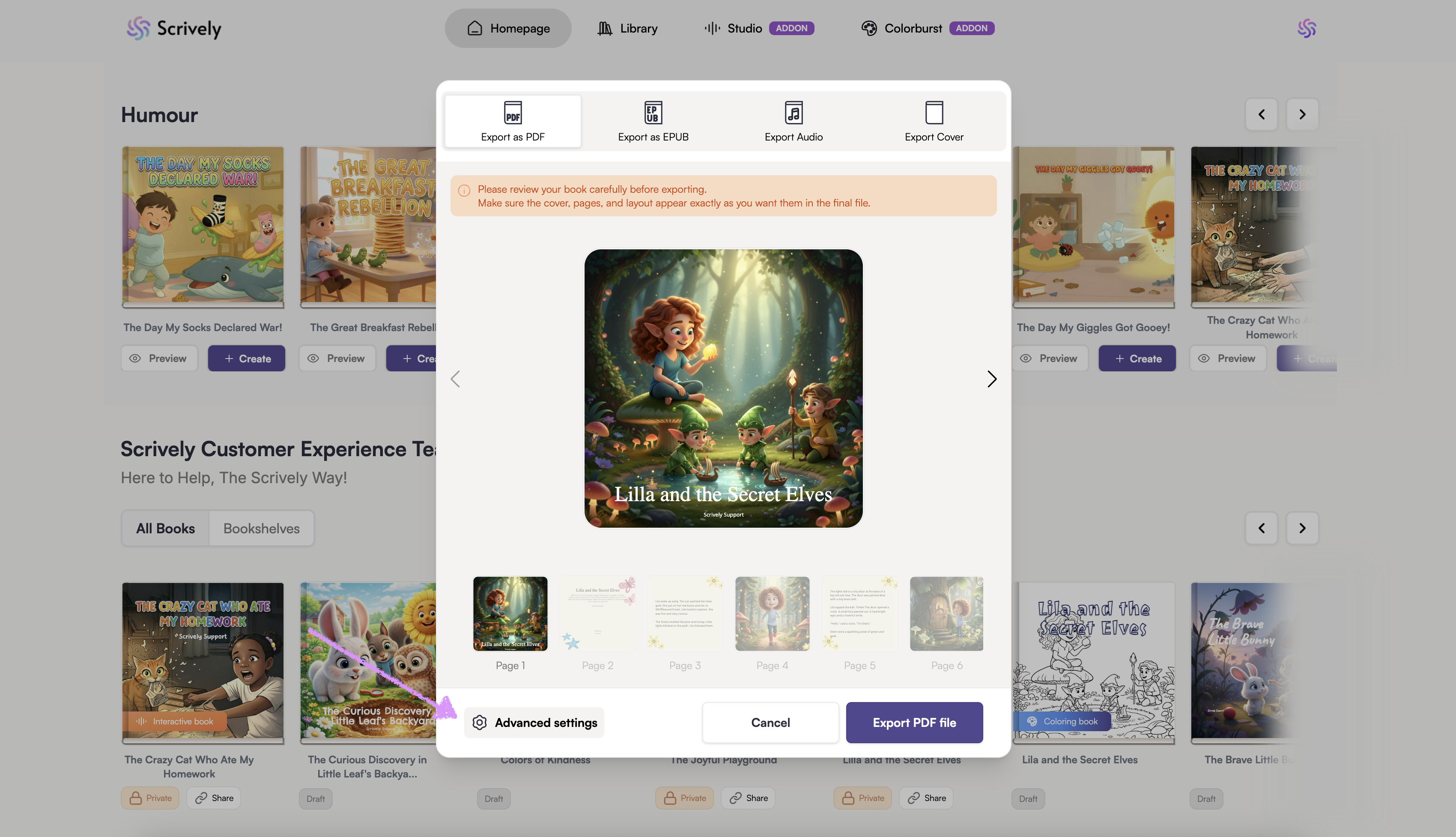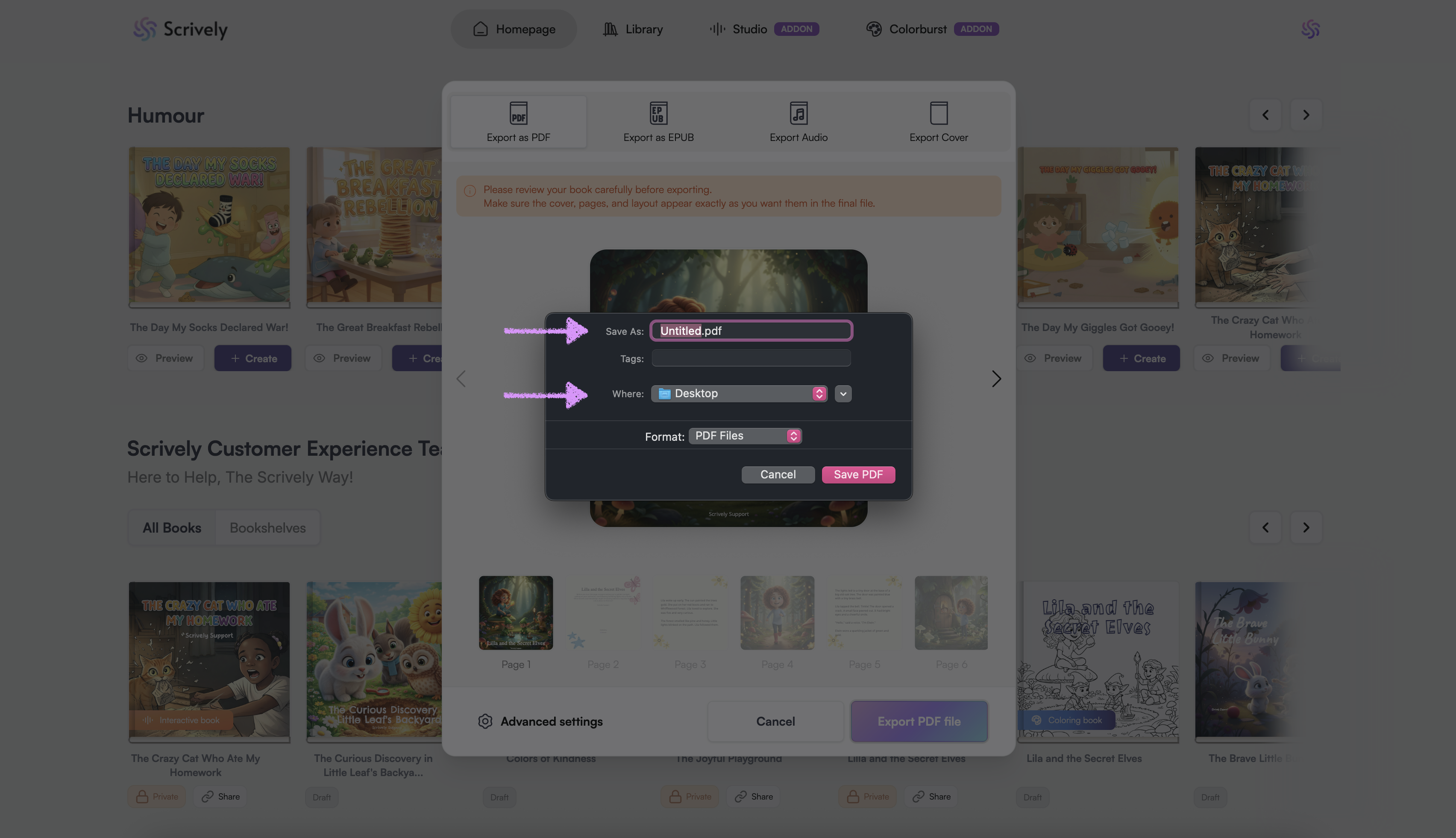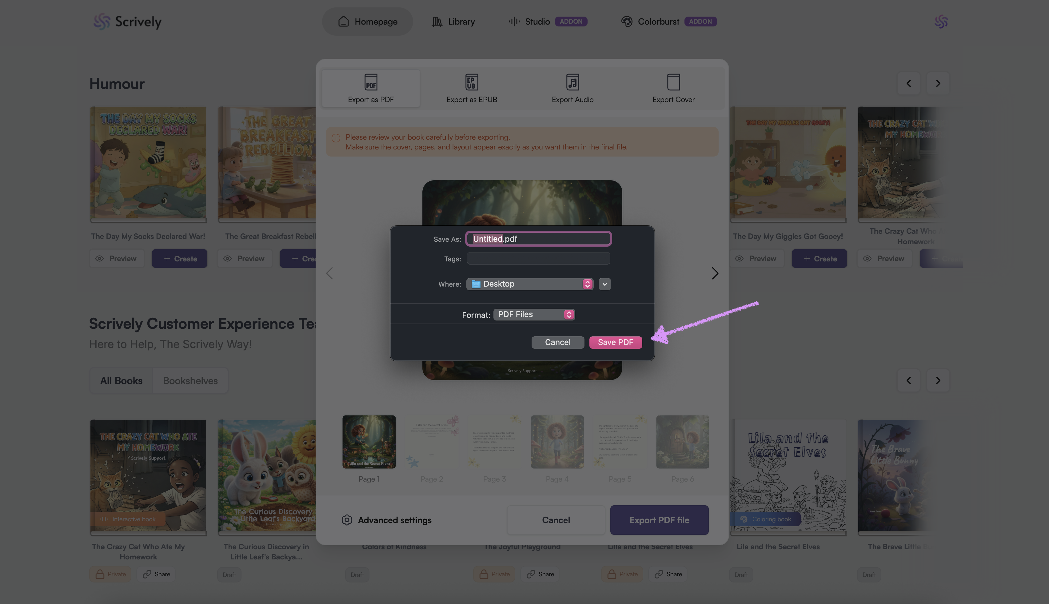 From your Scrively Homepage, scroll to your library at the bottom and hover over the book you’d like to save as a PDF. Click the ellipsis (⋮) menu that appears.