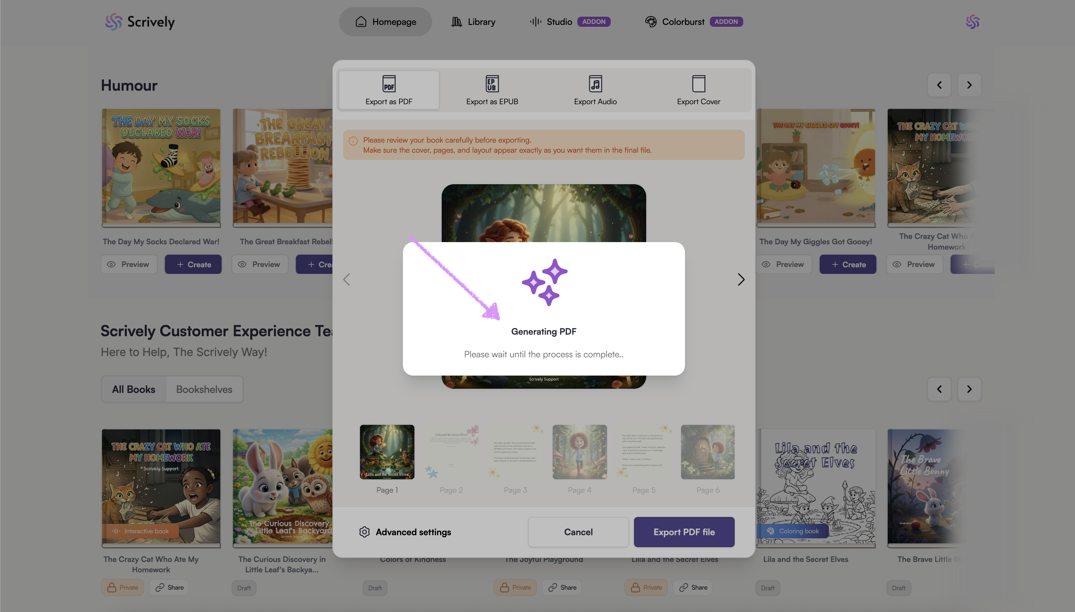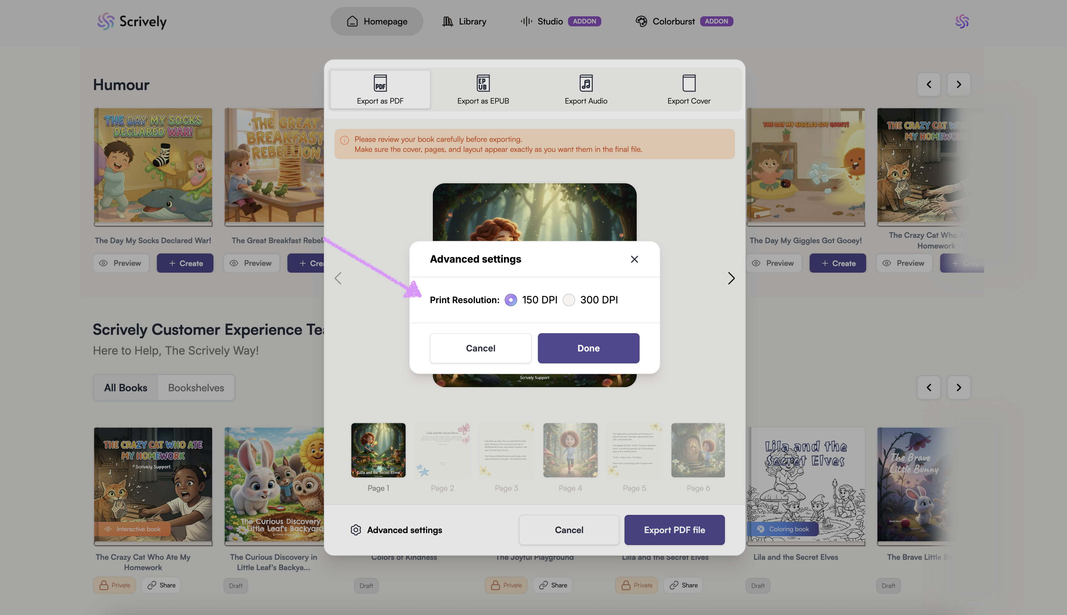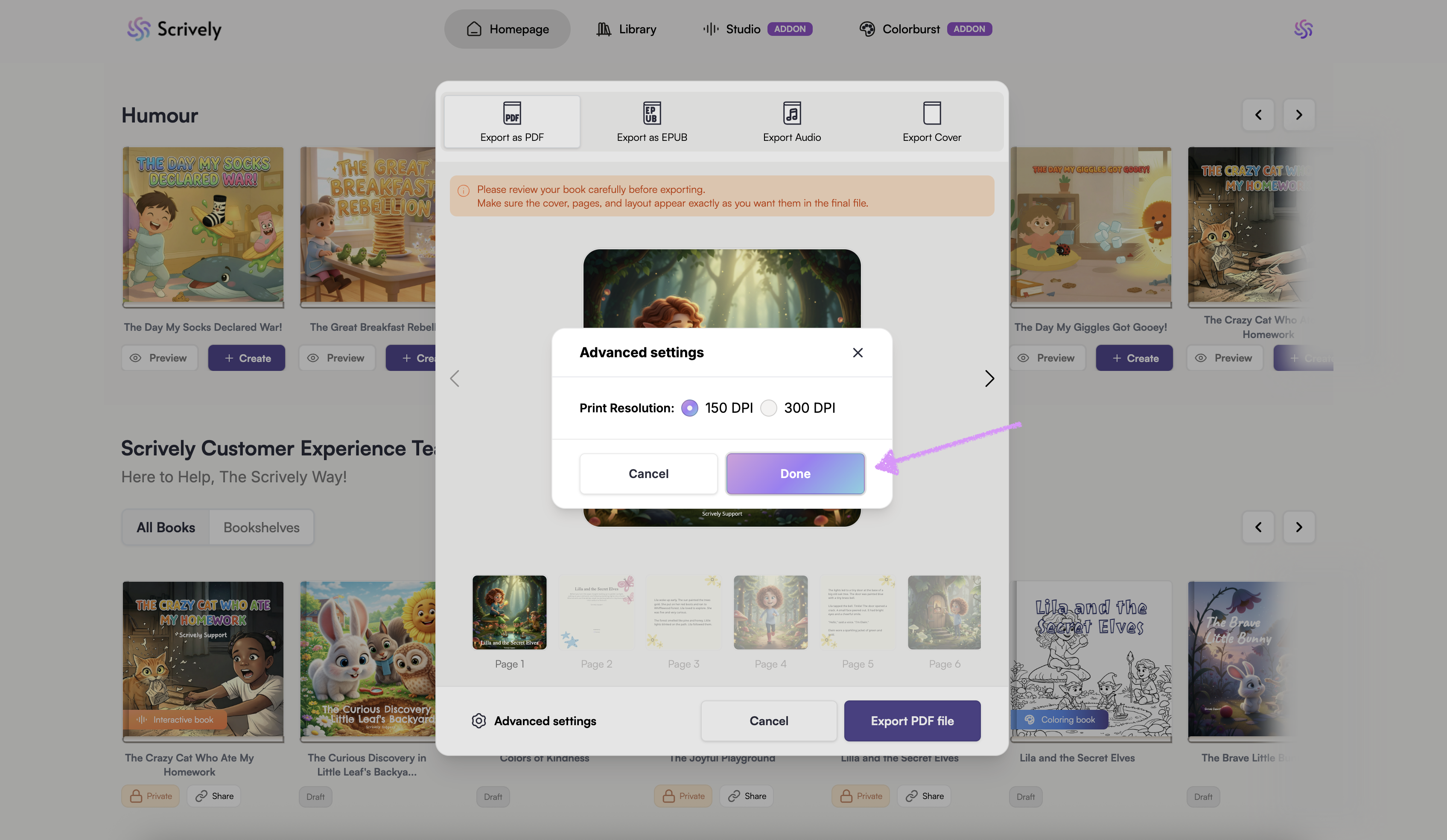 From your Scrively Homepage, scroll to your library at the bottom and hover over the book you’d like to save as a PDF. Click the ellipsis (⋮) menu that appears.