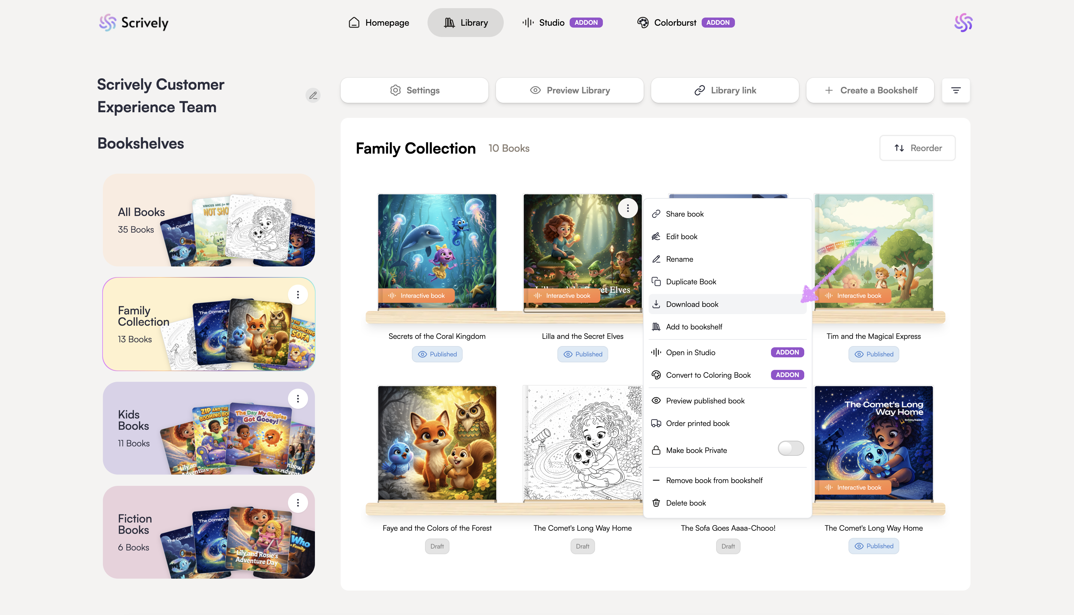 Hover over the book you’d like to save as a PDF. Click the ellipsis (⋮) menu that appears.