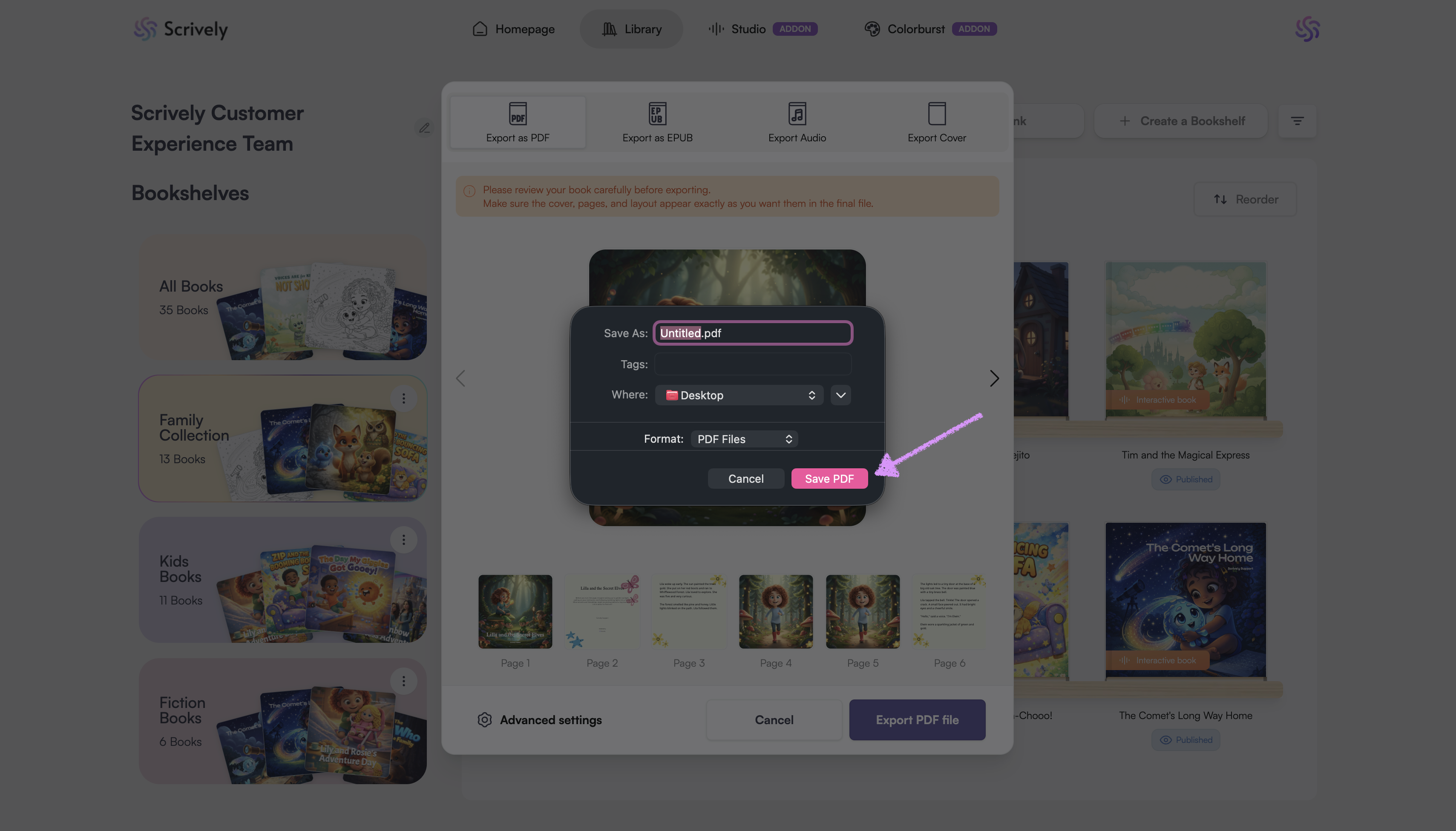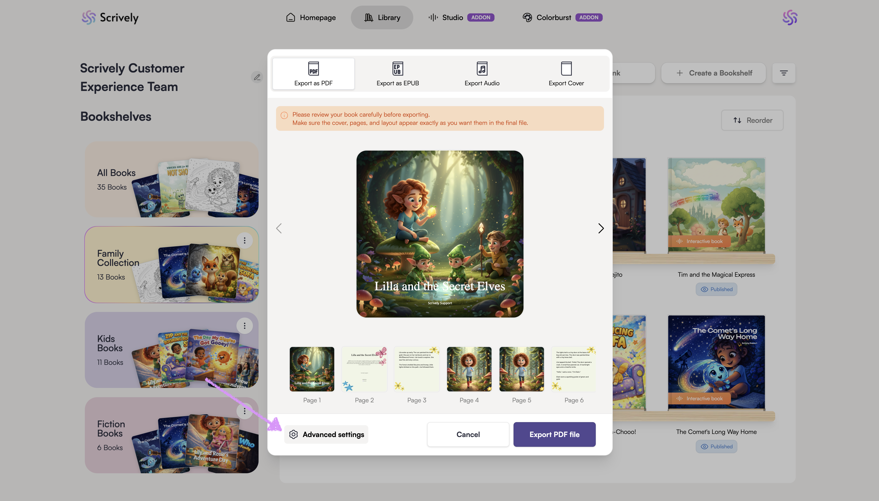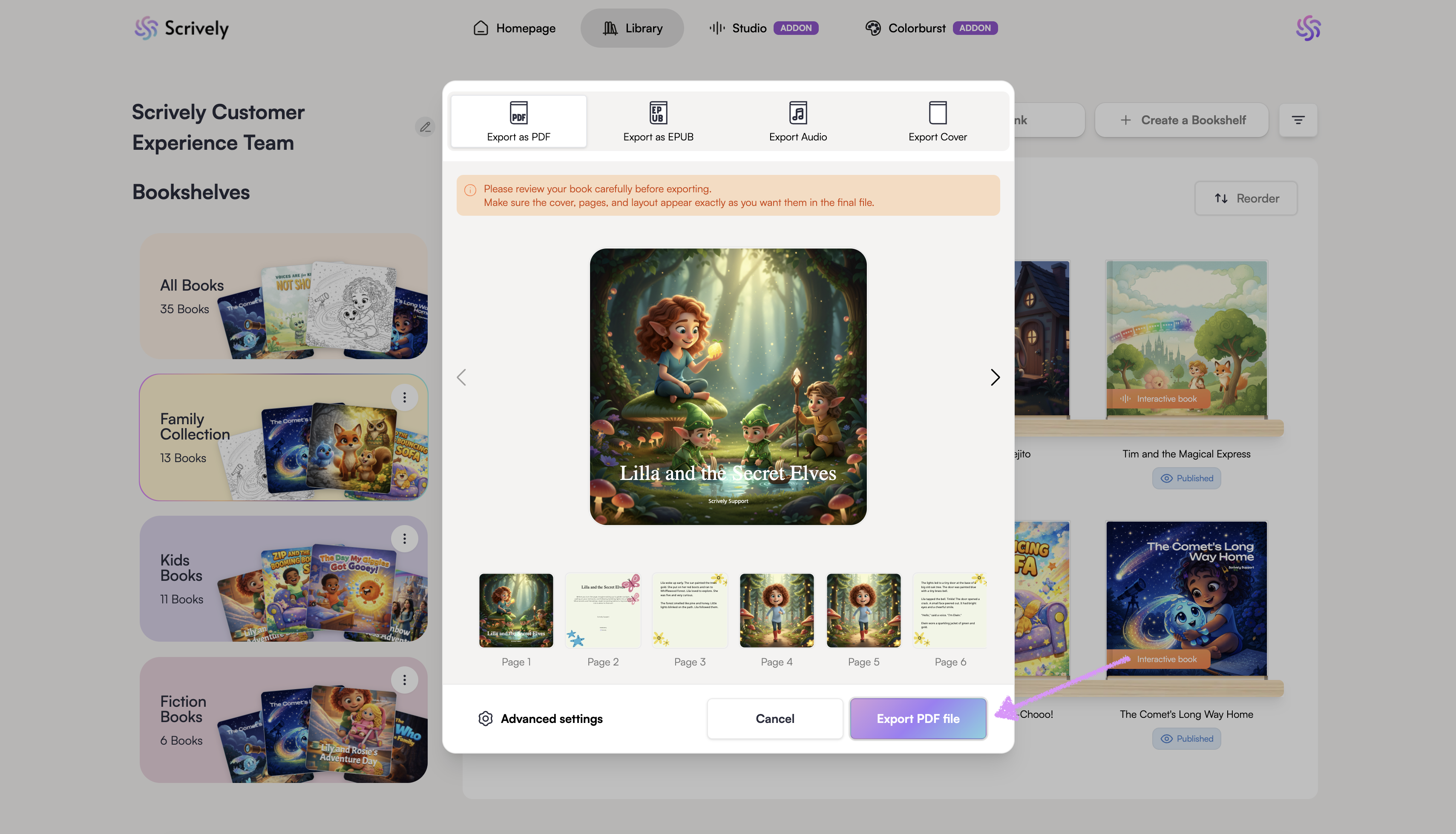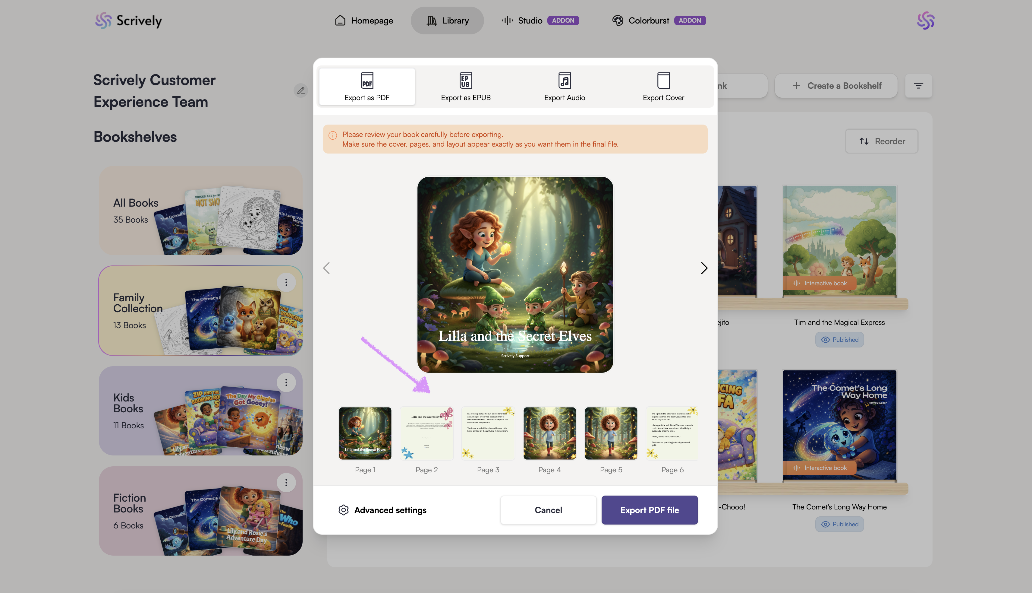 Use the left and right arrows to navigate through the pages. Review your book carefully before exporting.