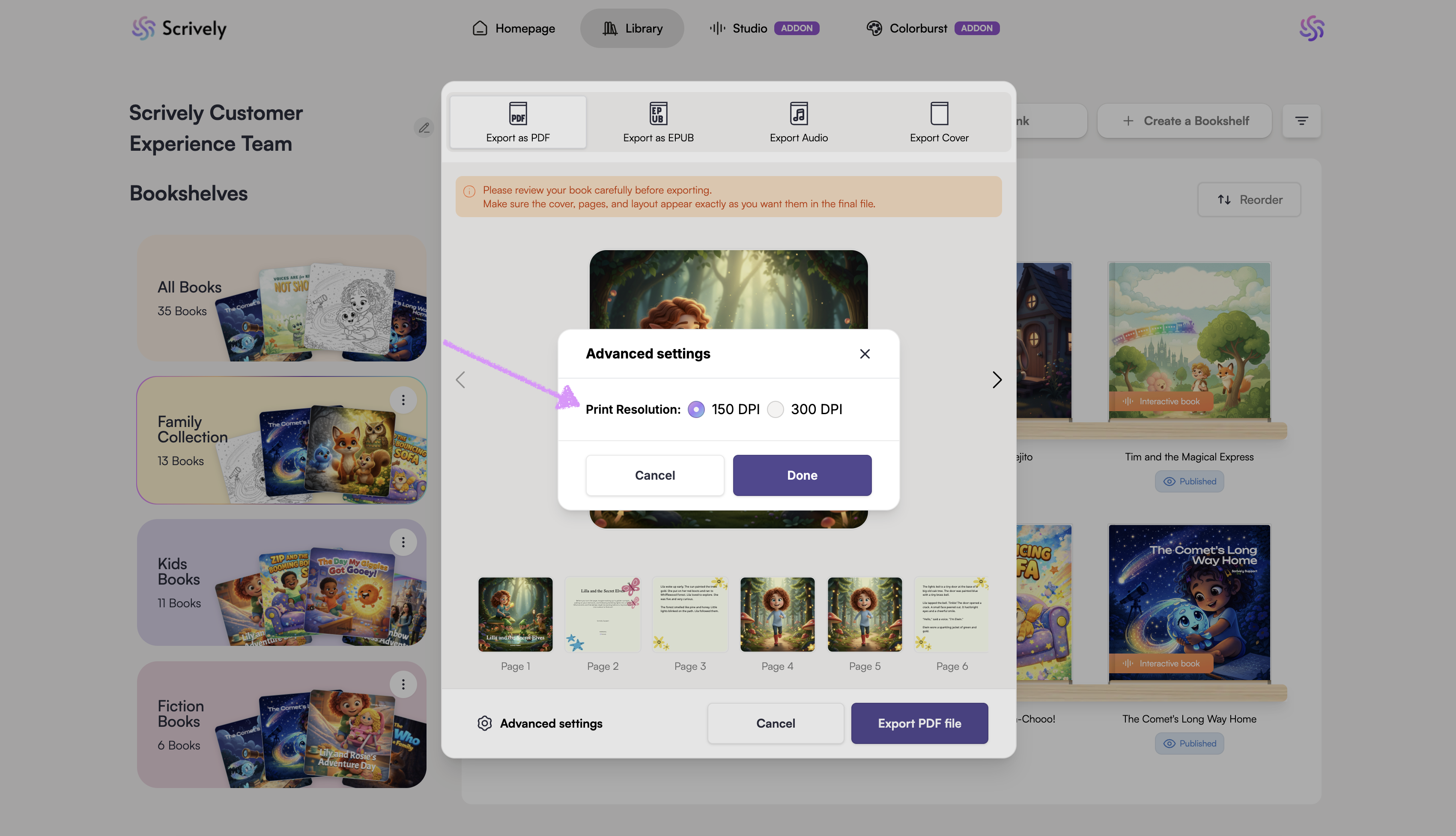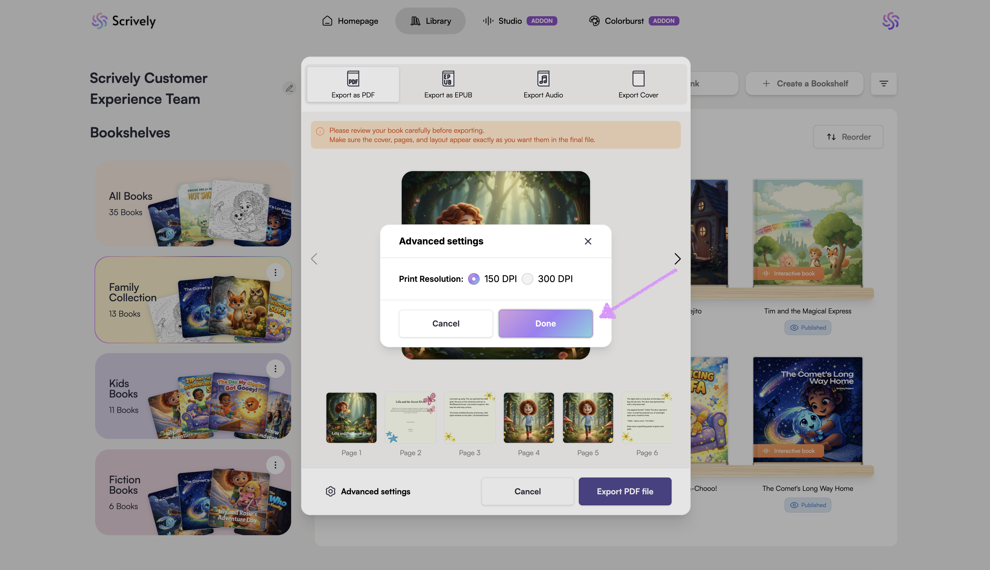 Note on DPI Settings: Once the print resolution is set to 300 DPI, it cannot be reverted. This is the resolution used for printing, so we recommend duplicating your book before changing DPI settings if you want to keep a lower-resolution version for digital use.