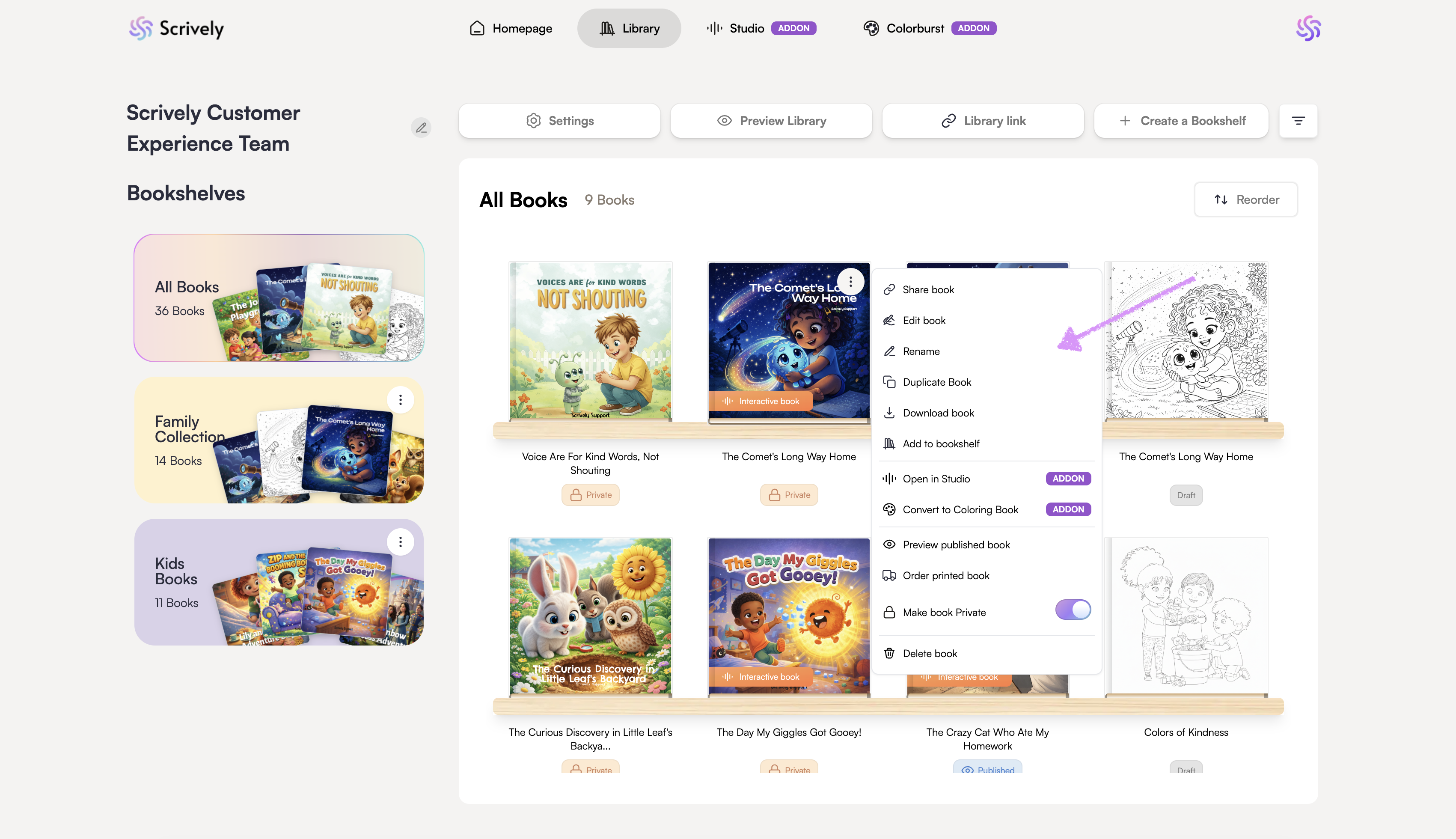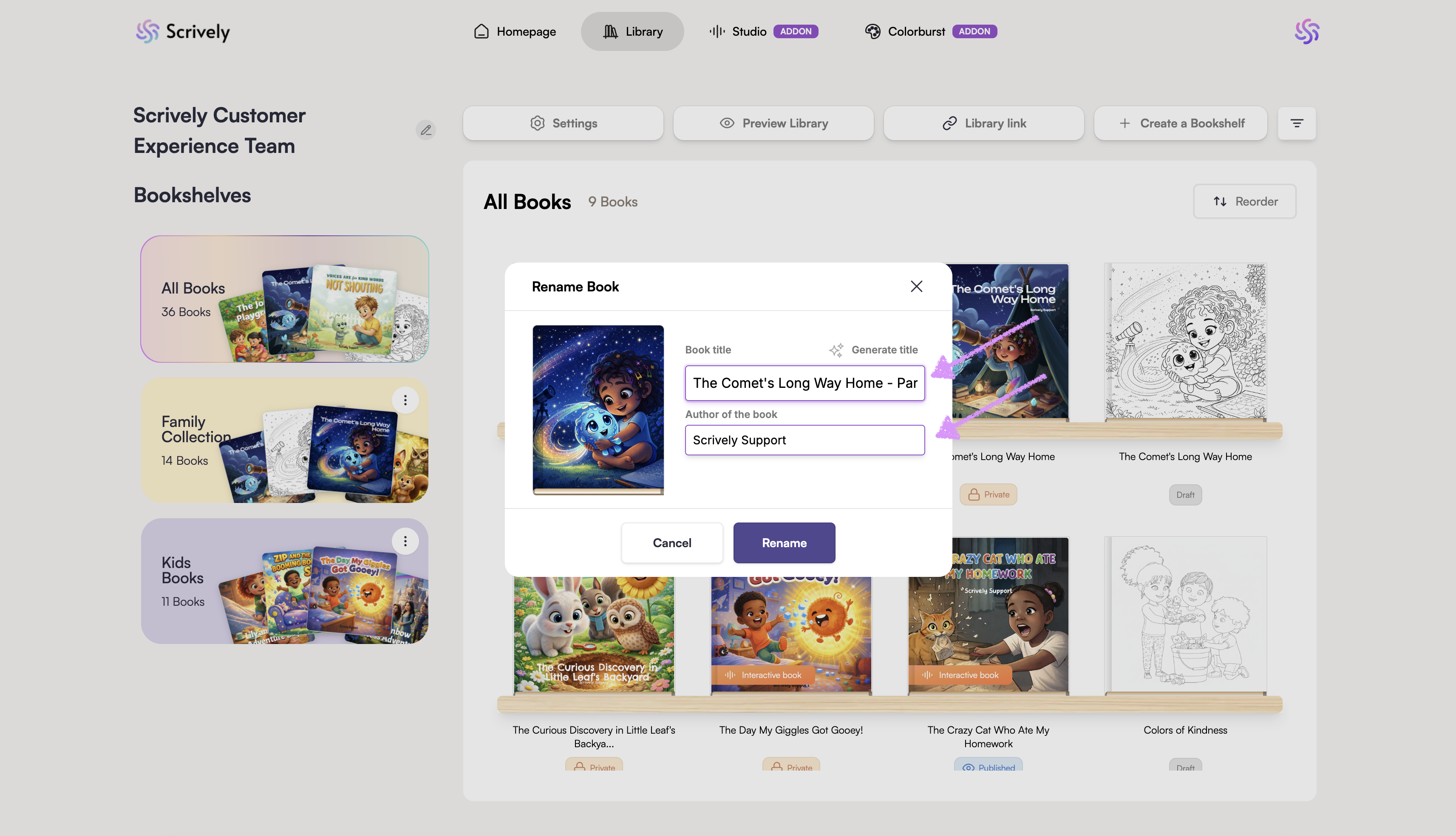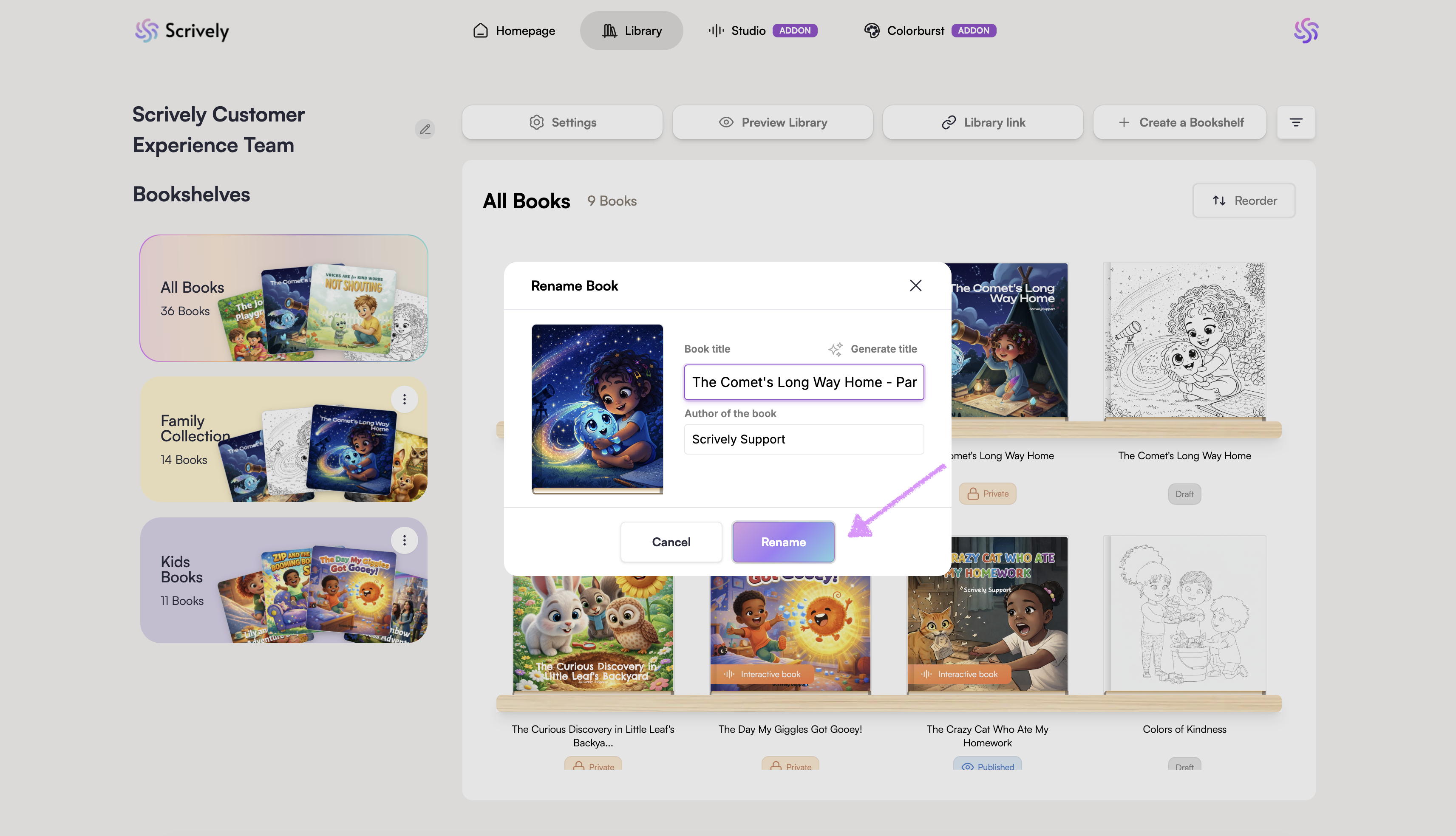 Need to give your story a fresh title or fix a typo? Scrively makes it easy to rename your book at any time. Whether you’re updating a working title or finalizing the perfect name before publishing, this guide will walk you through the simple steps to rename your book within the “My Books” section.