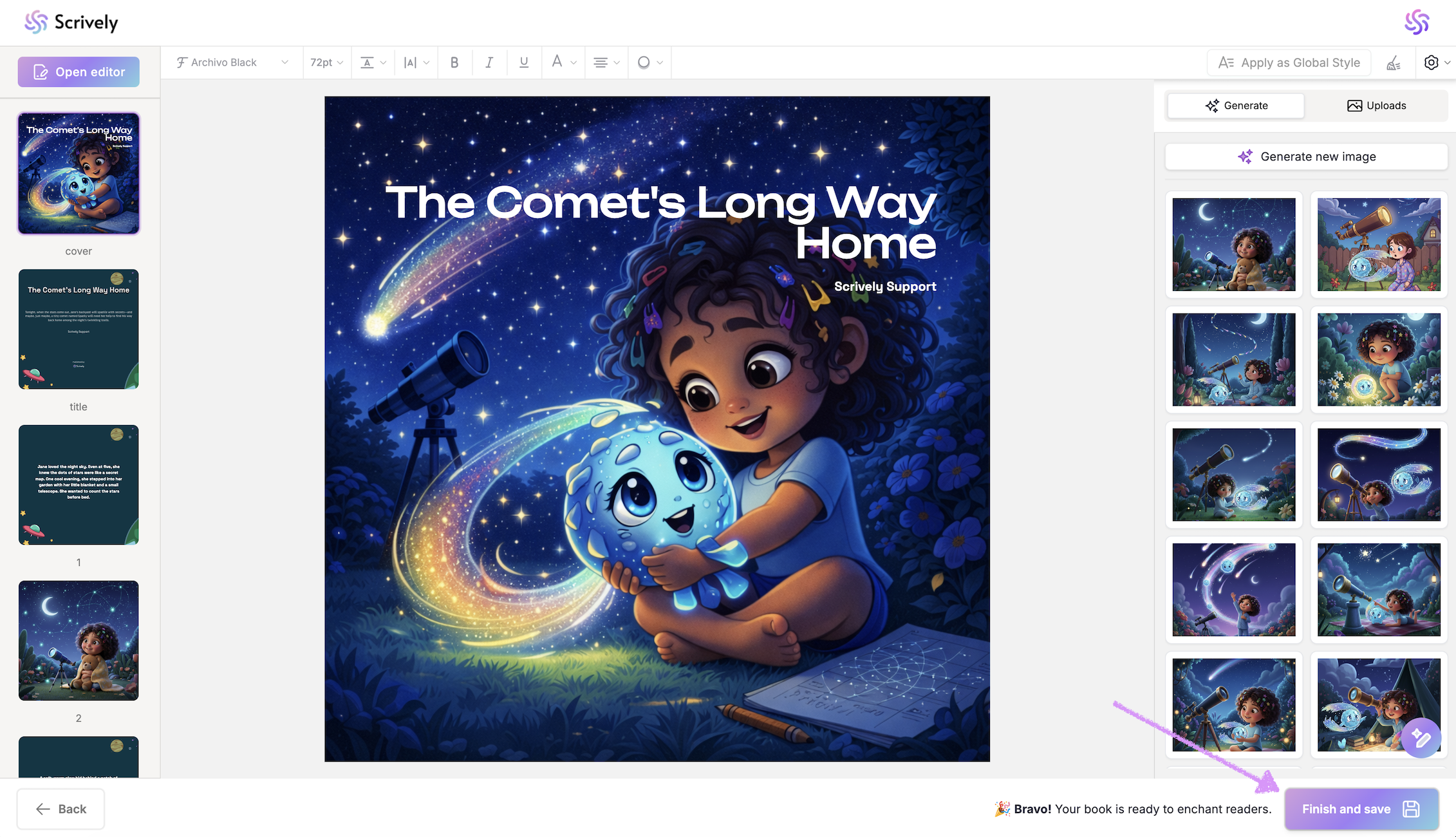 In the Designer (book layout view), once your text and images are ready, click “Finish and save” in the bottom-right corner.
