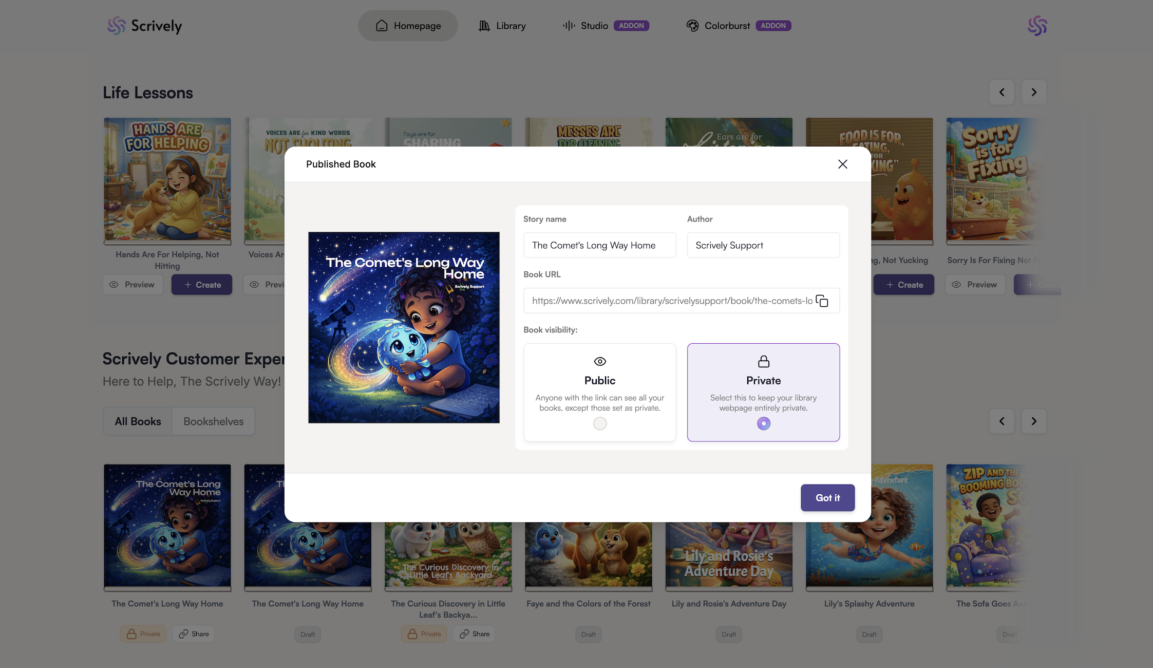 The published book modal will appear. From here, you can grab a shareable link and adjust your book’s visibility. By default, your book will stay private in your library until you choose to change it. Our guide here shares more on setting your book to public once you close out this modal.