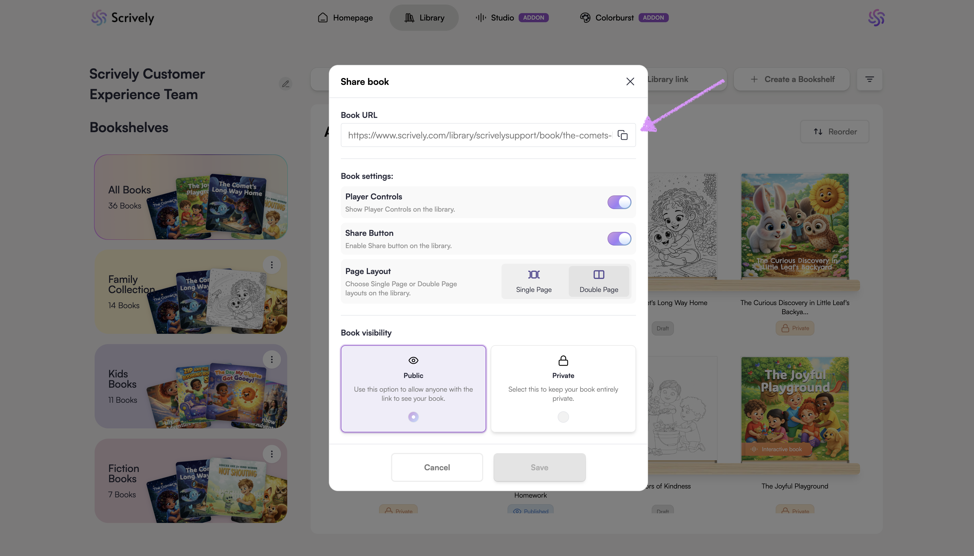 A modal will appear showing the book’s URL. You can copy the link directly to your clipboard with one click or copy it manually if you prefer.