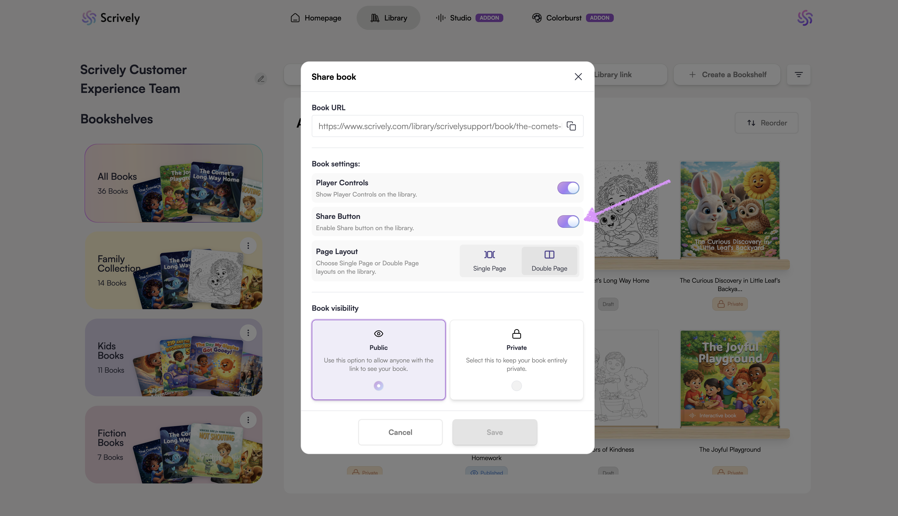 Toggle “Share Button” on or off. Turning this off prevents readers from sharing the book in your library.
