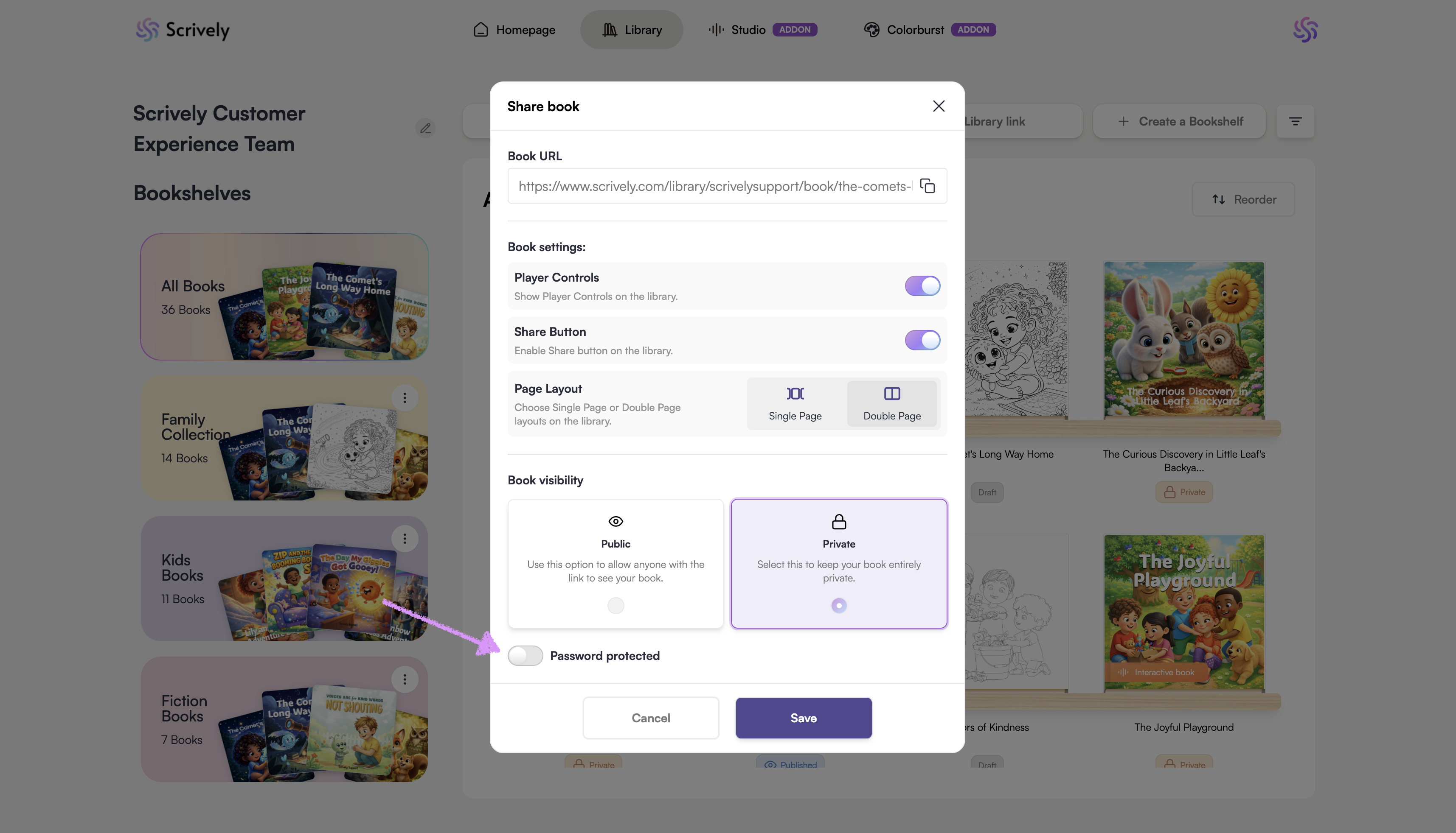 When you set the book visibility to "Private" a "Password protected" toggle will be displayed.
