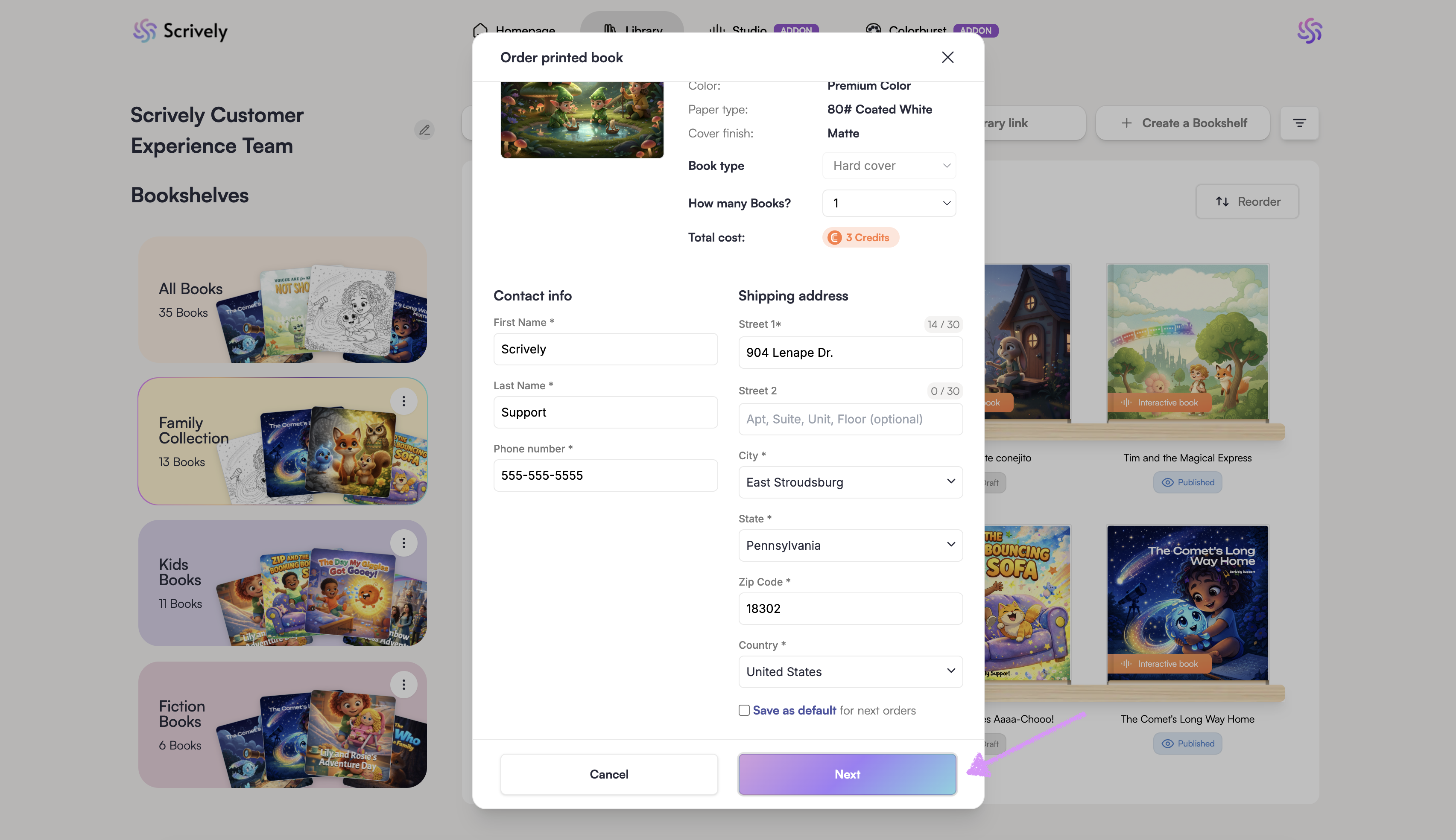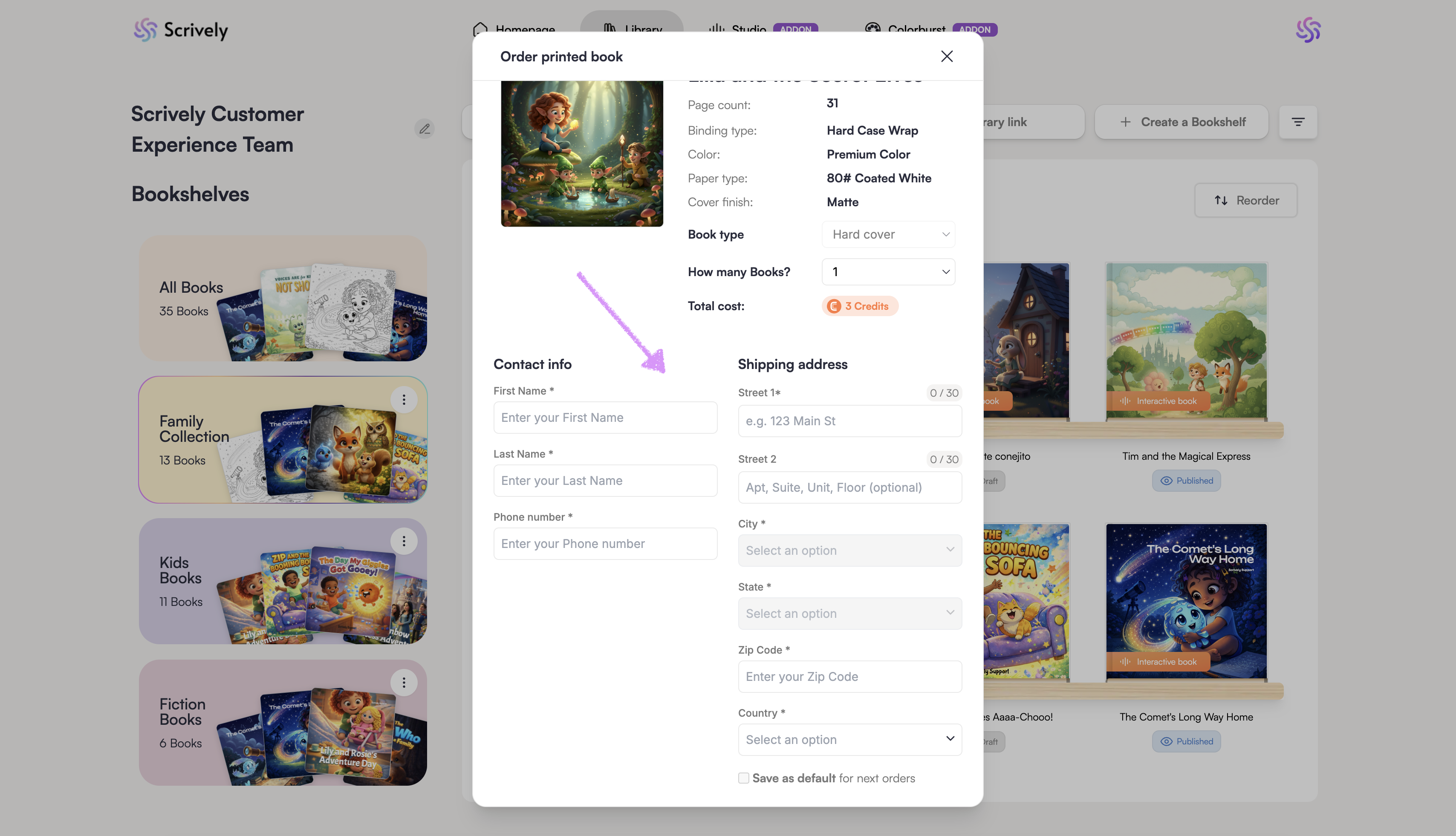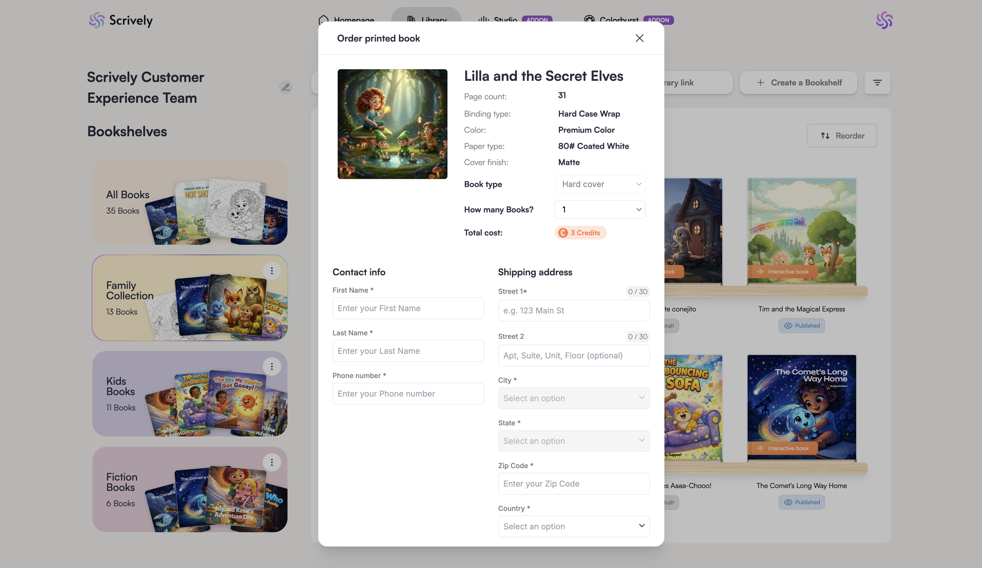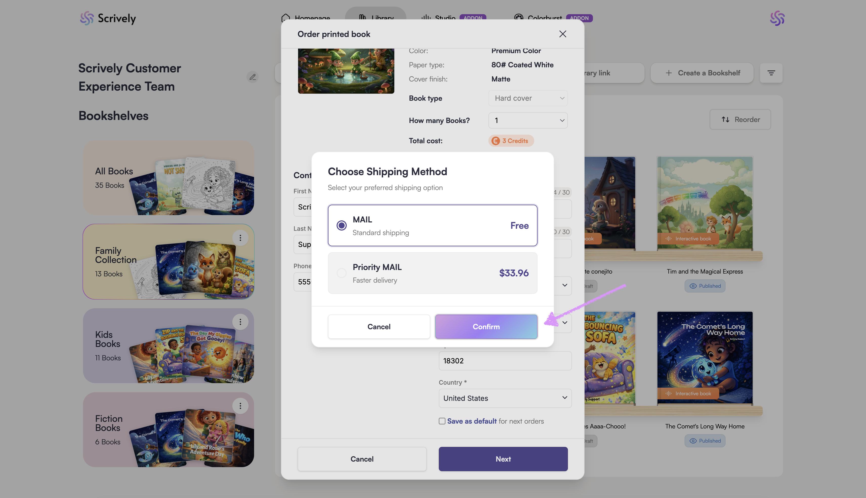 All Scrively storybooks are printed in hardcover. Coloring books are available in paperback. Confirm the number of books you’d like to order. Remember, you’re entitled to one free hardcover copy. Additional copies will require the purchase and use of extra credits which you can learn more about in our guide here.