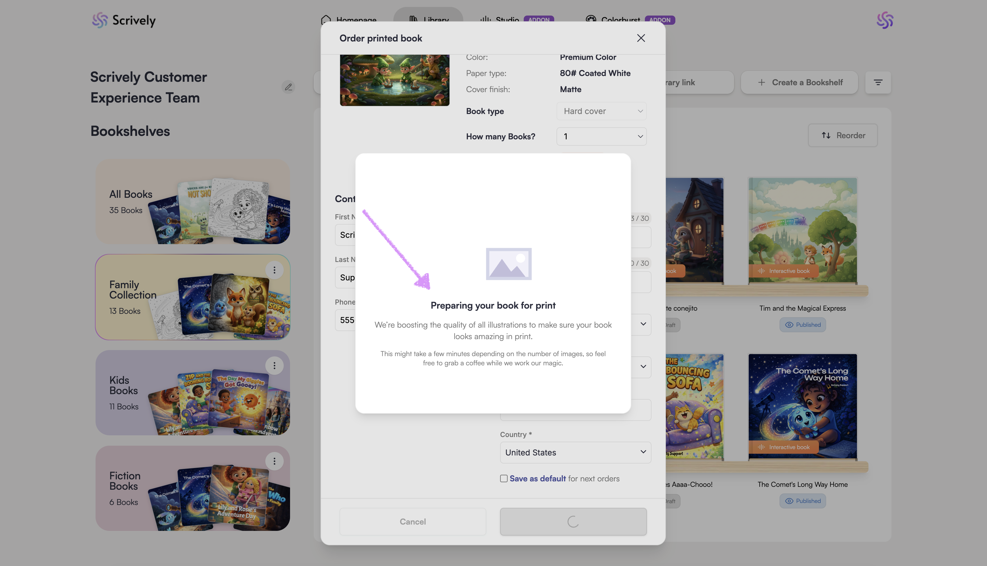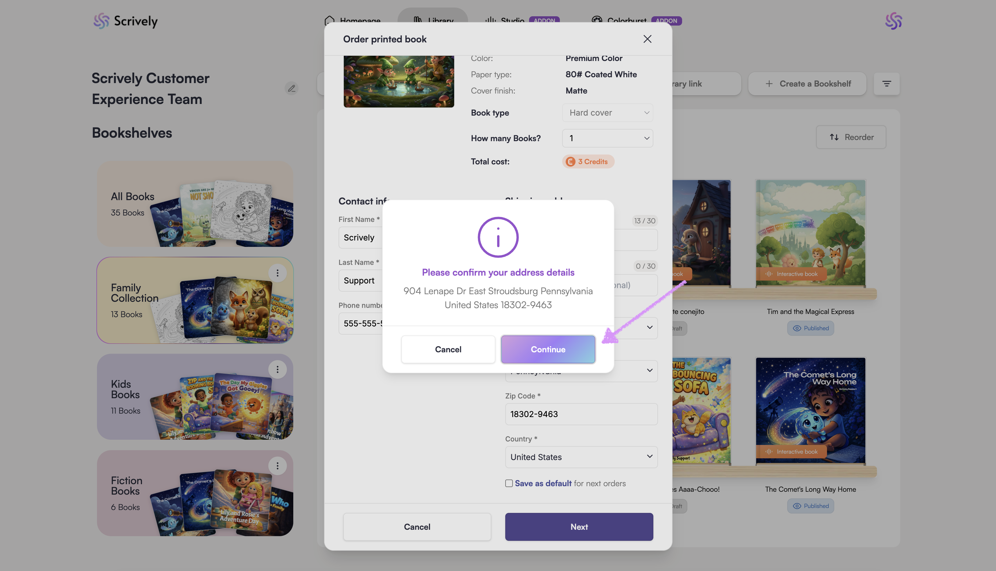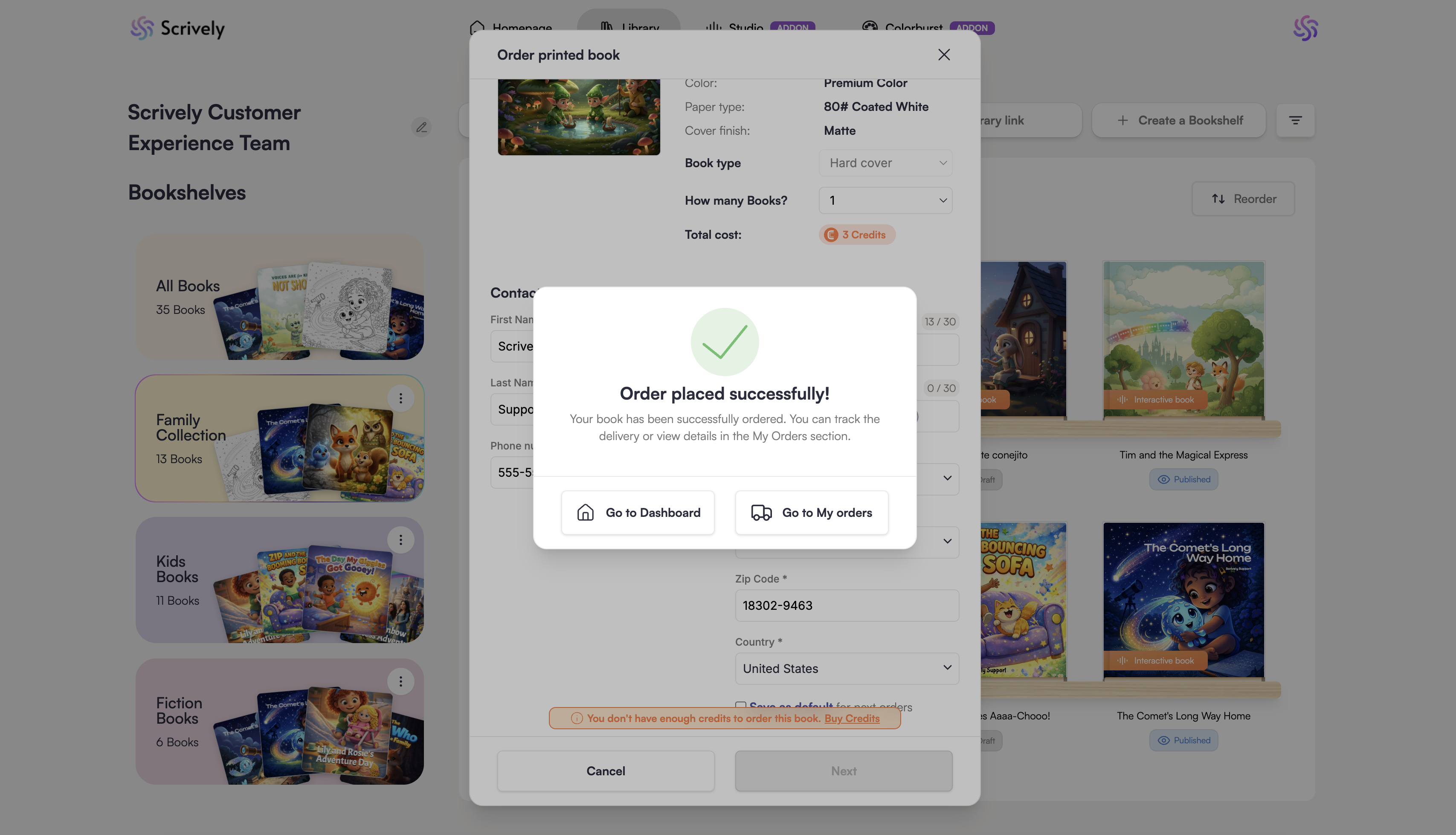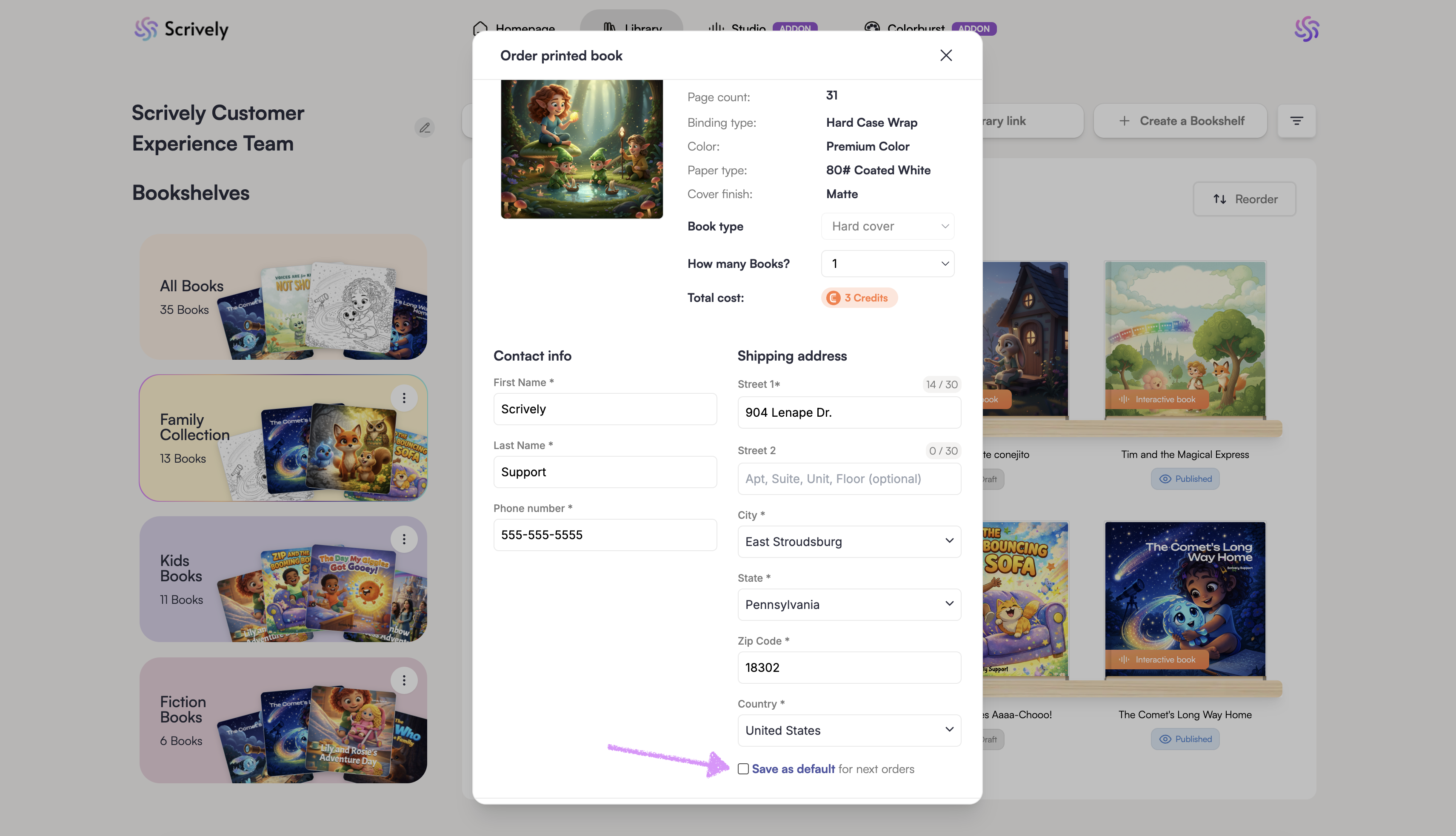 All Scrively storybooks are printed in hardcover. Coloring books are available in paperback. Confirm the number of books you’d like to order. Remember, you’re entitled to one free hardcover copy. Additional copies will require the purchase and use of extra credits which you can learn more about in our guide here.