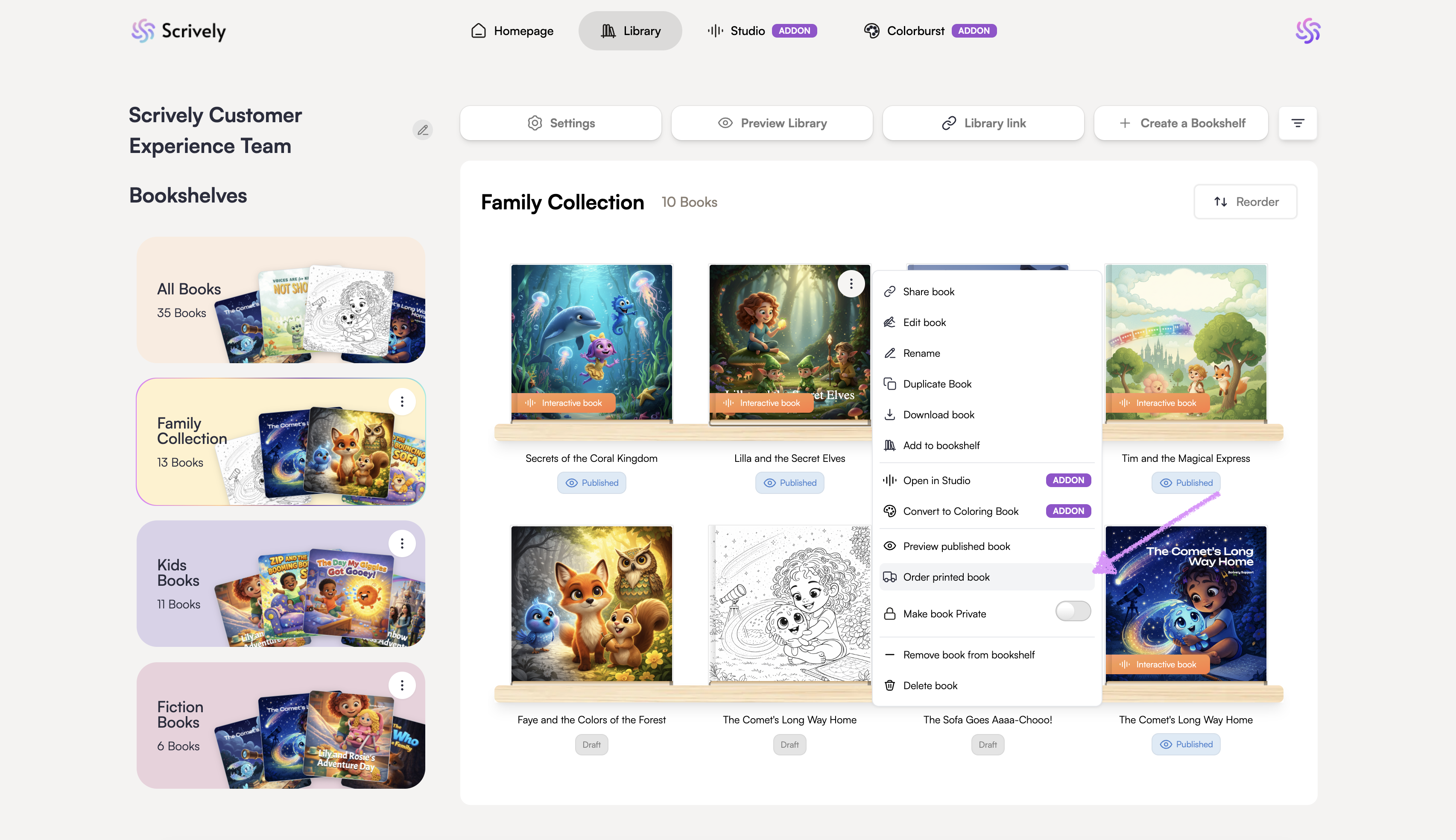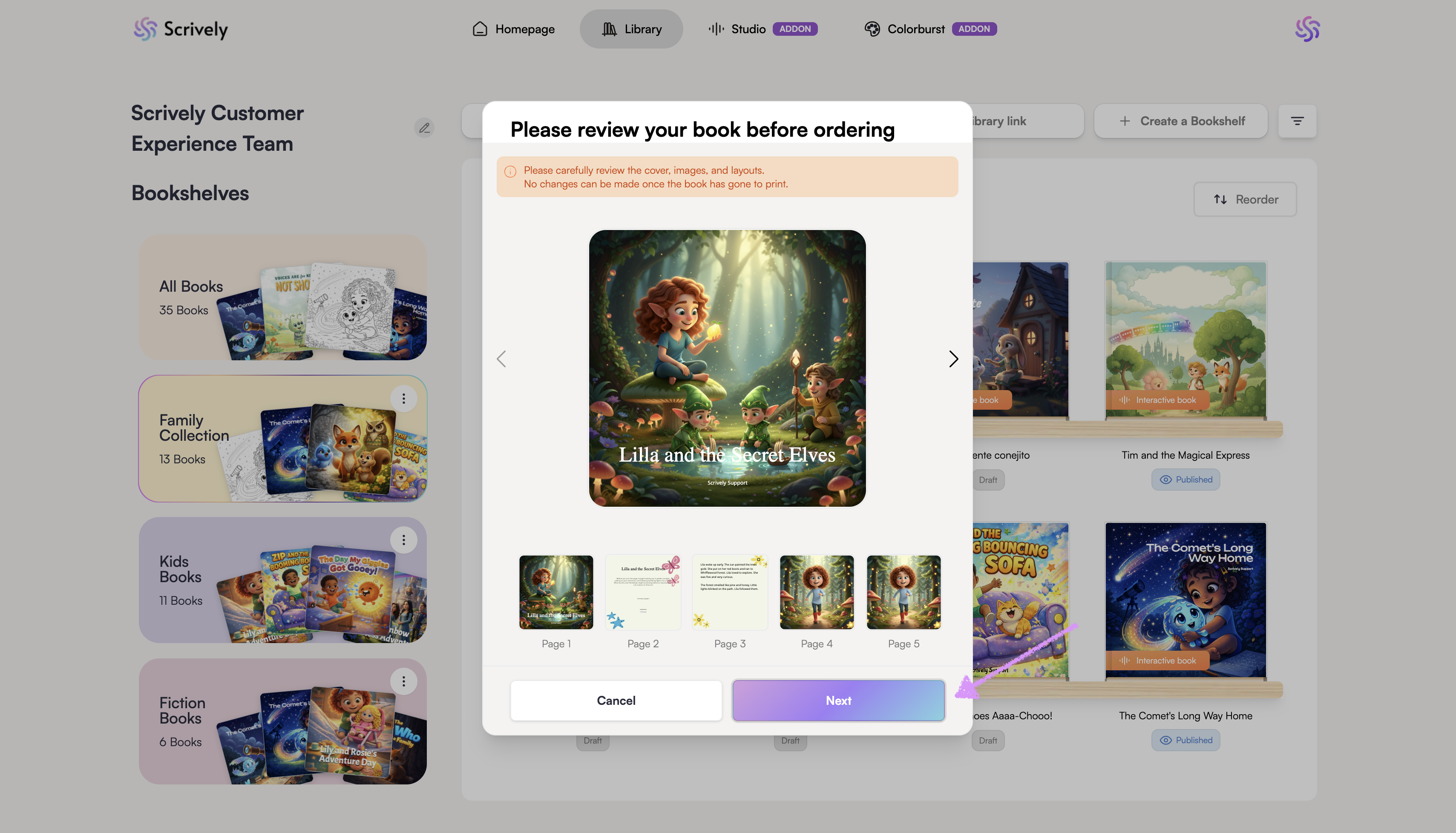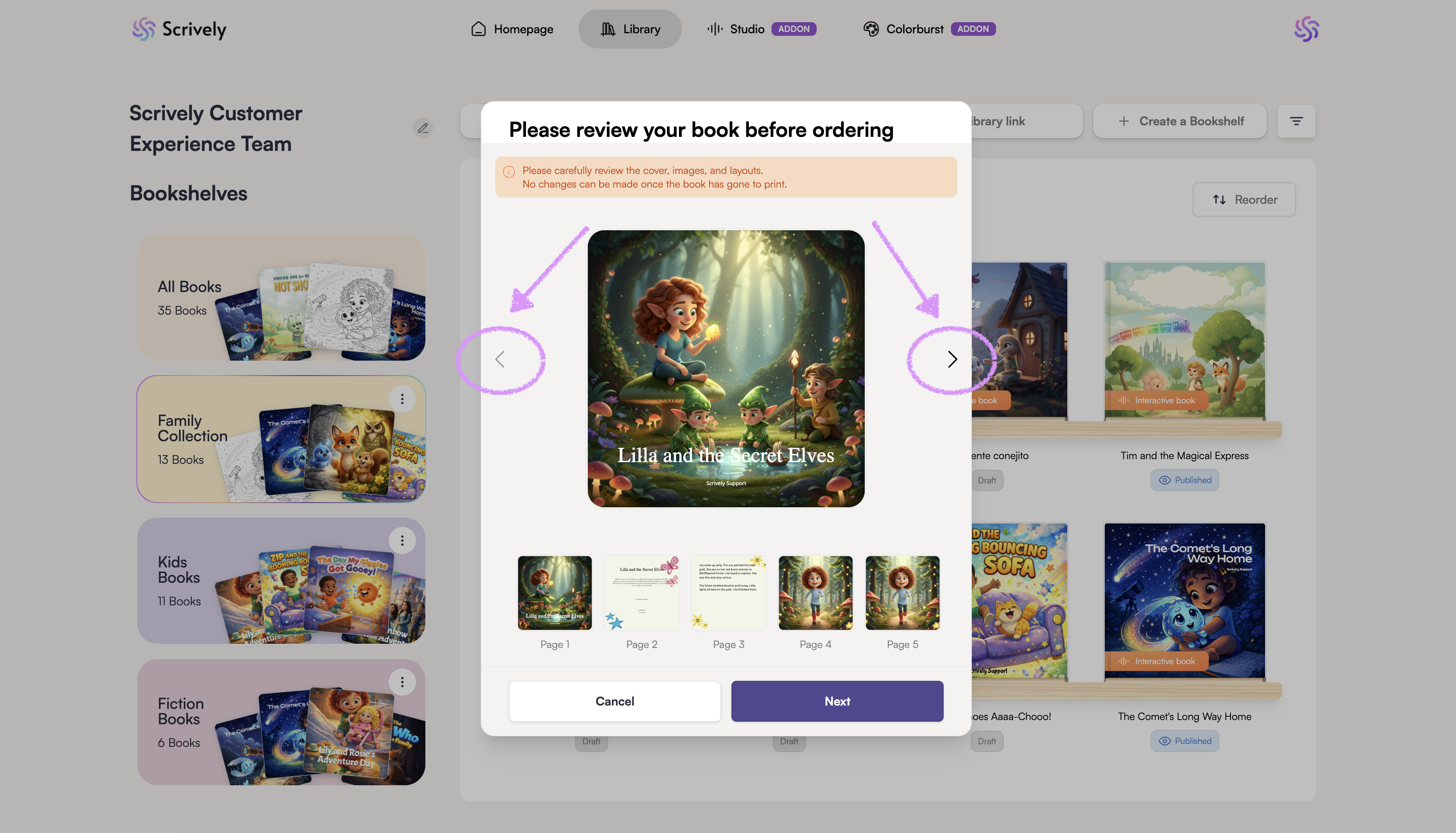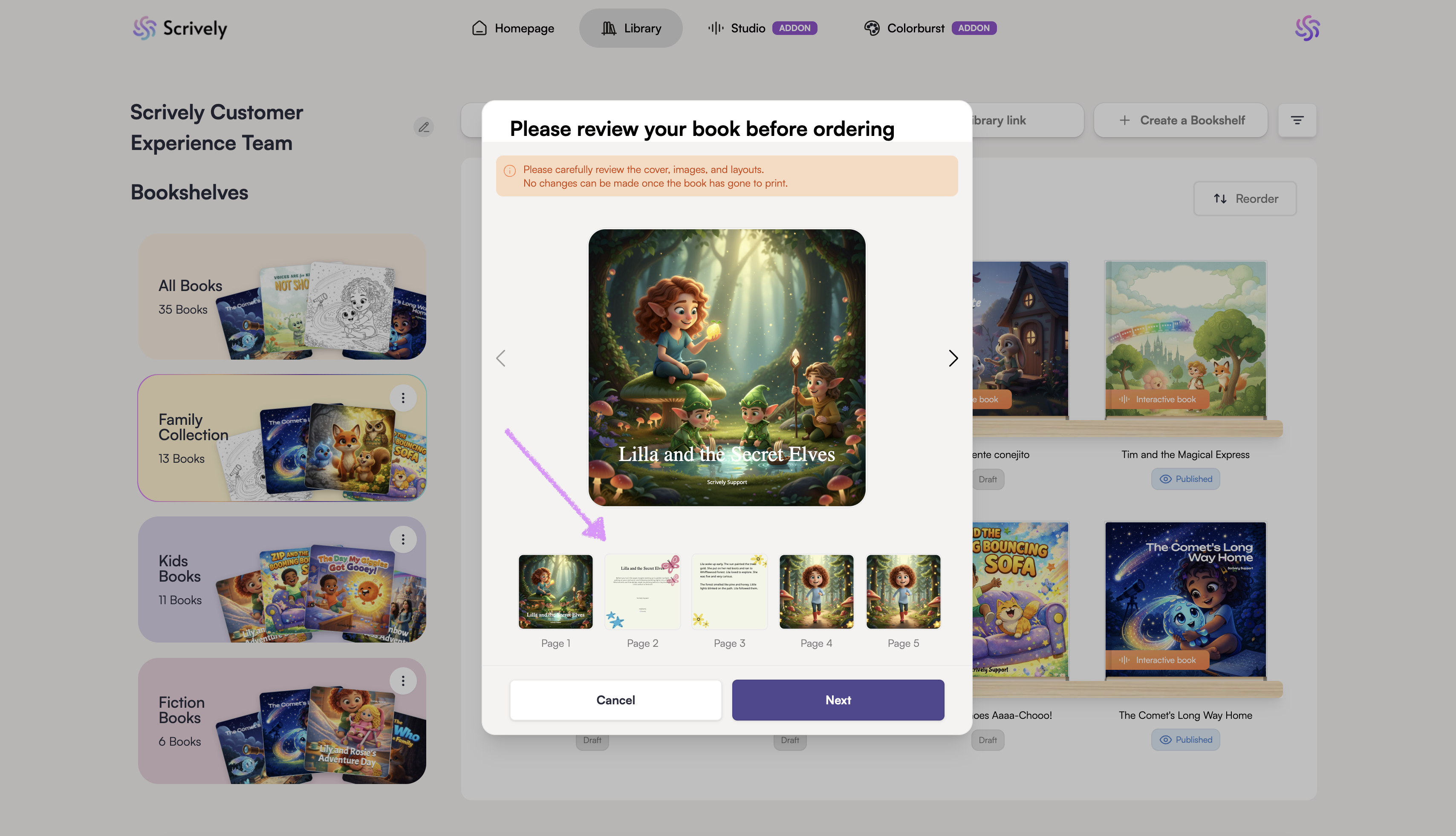All Scrively storybooks are printed in hardcover. Coloring books are available in paperback. Confirm the number of books you’d like to order. Remember, you’re entitled to one free hardcover copy. Additional copies will require the purchase and use of extra credits which you can learn more about in our guide here.