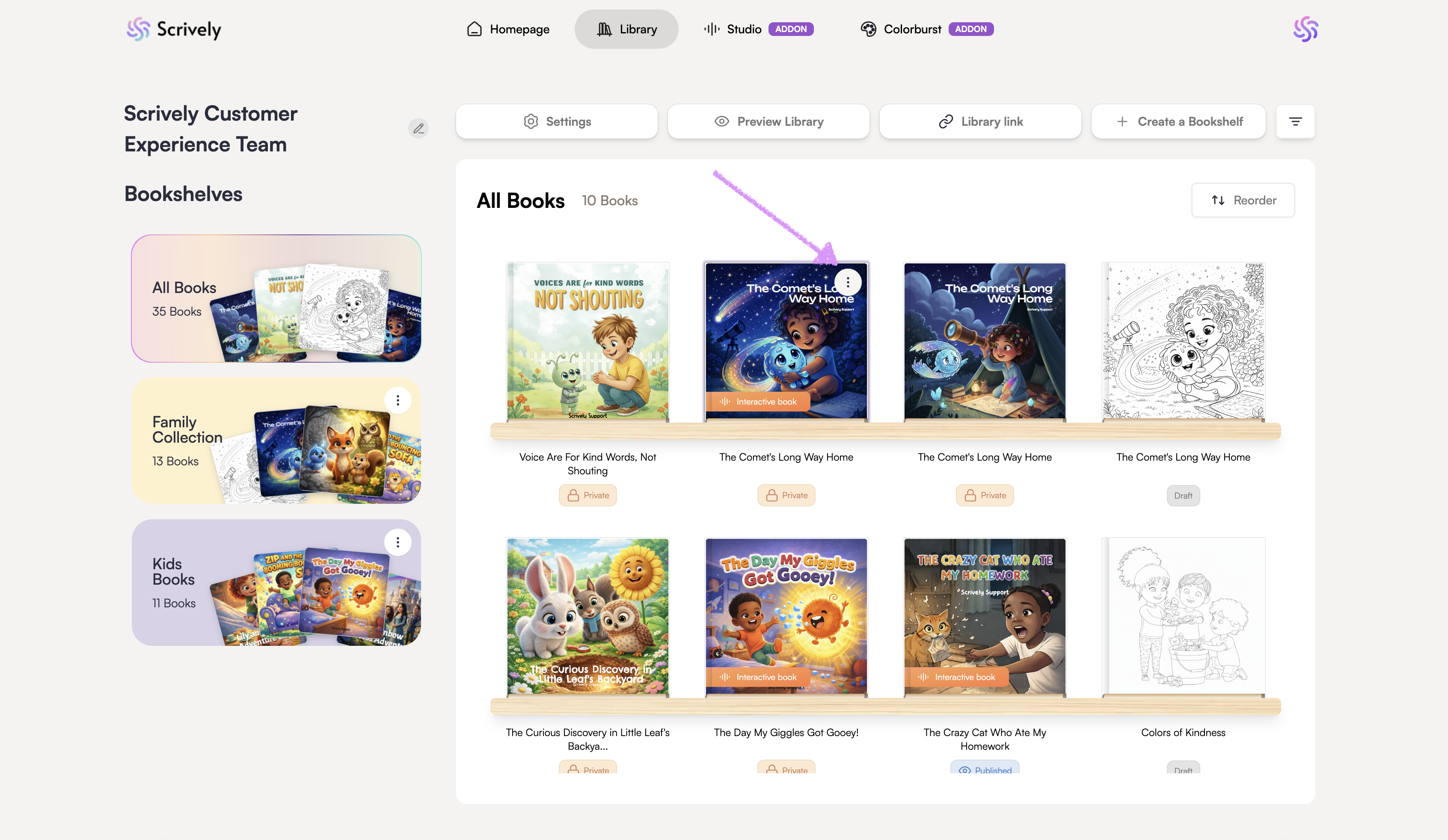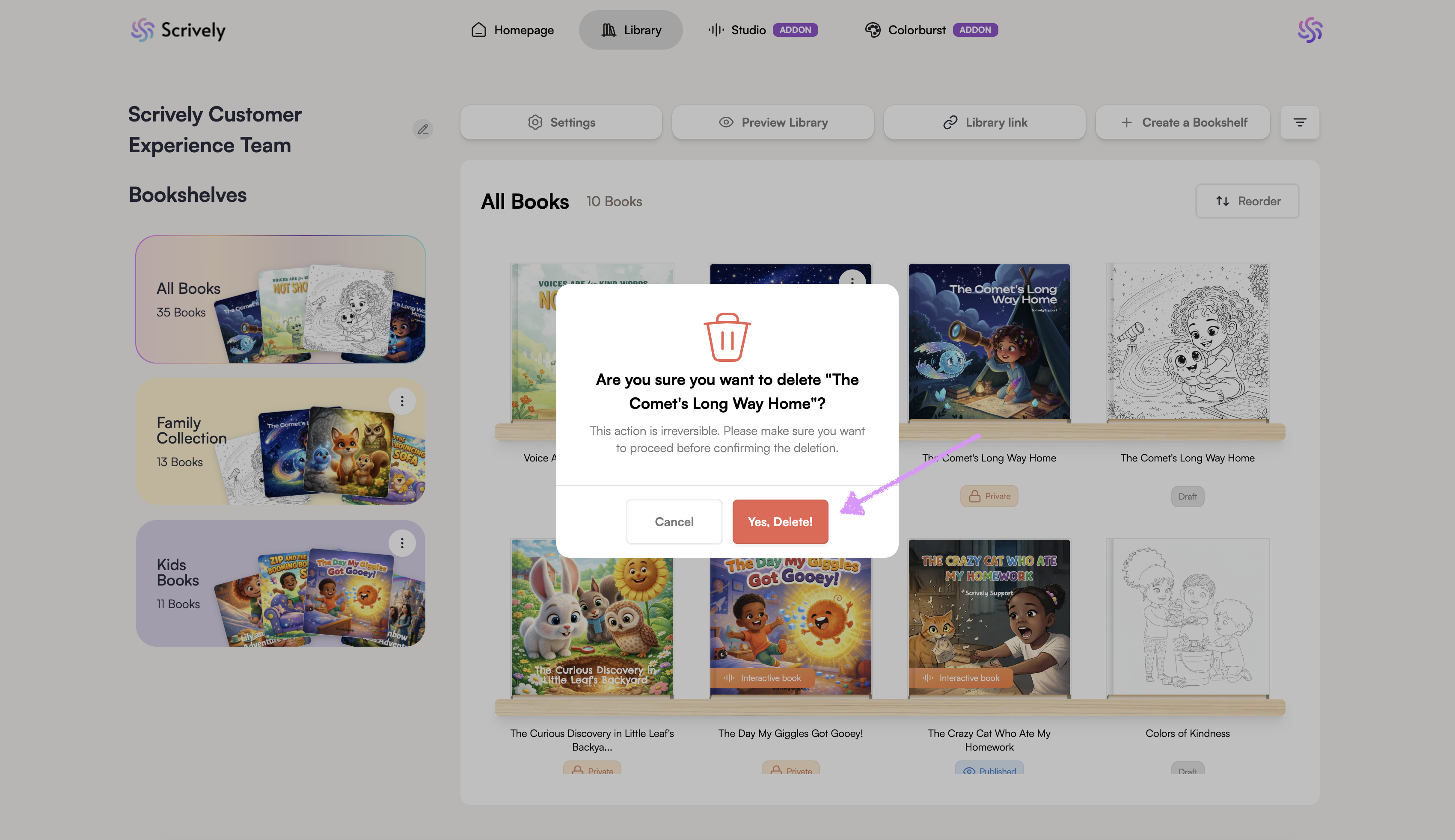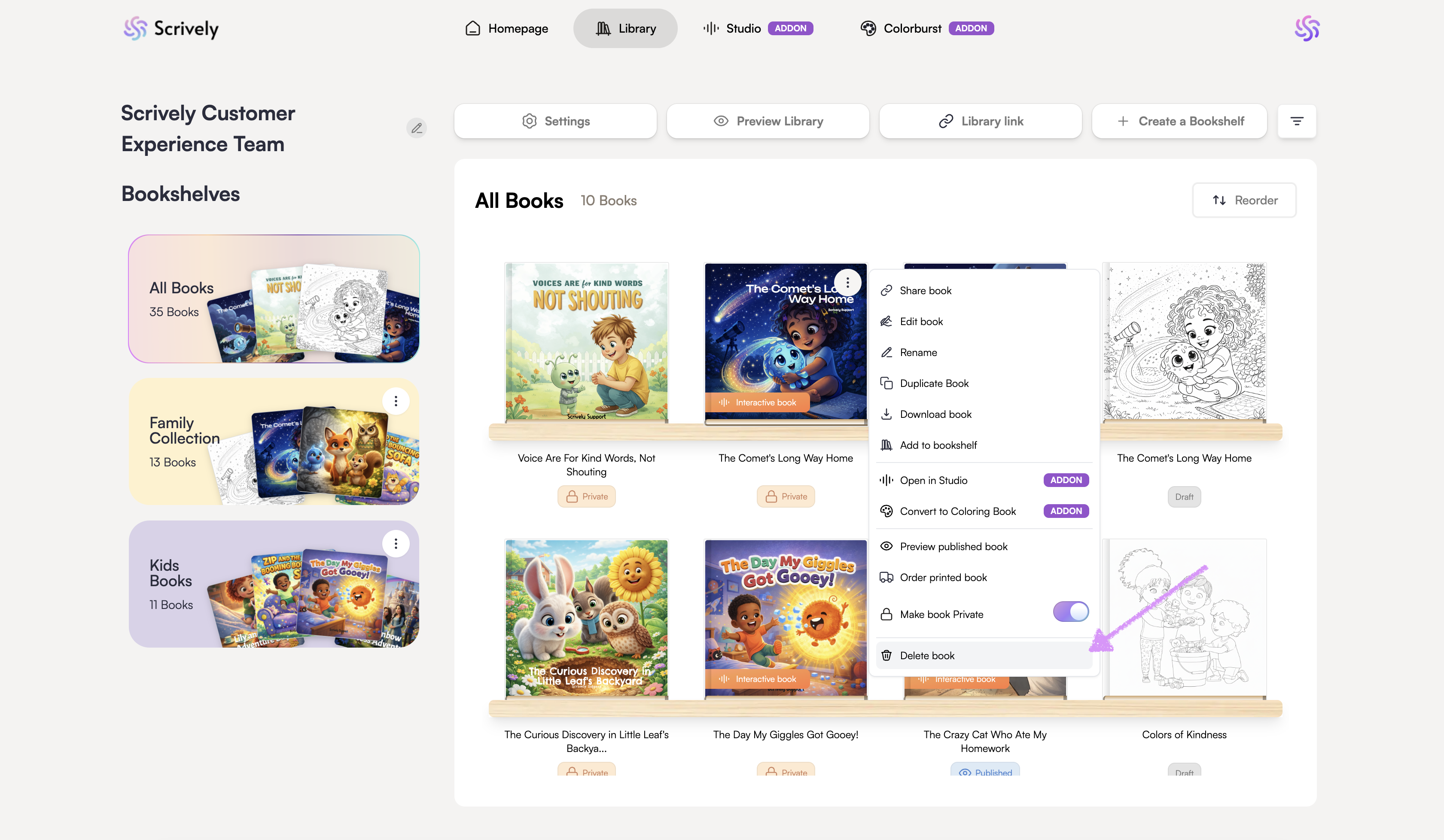 Need to clean up your library? Scrively makes it easy to delete books you no longer need, whether you’re removing old drafts or clearing out unused titles.