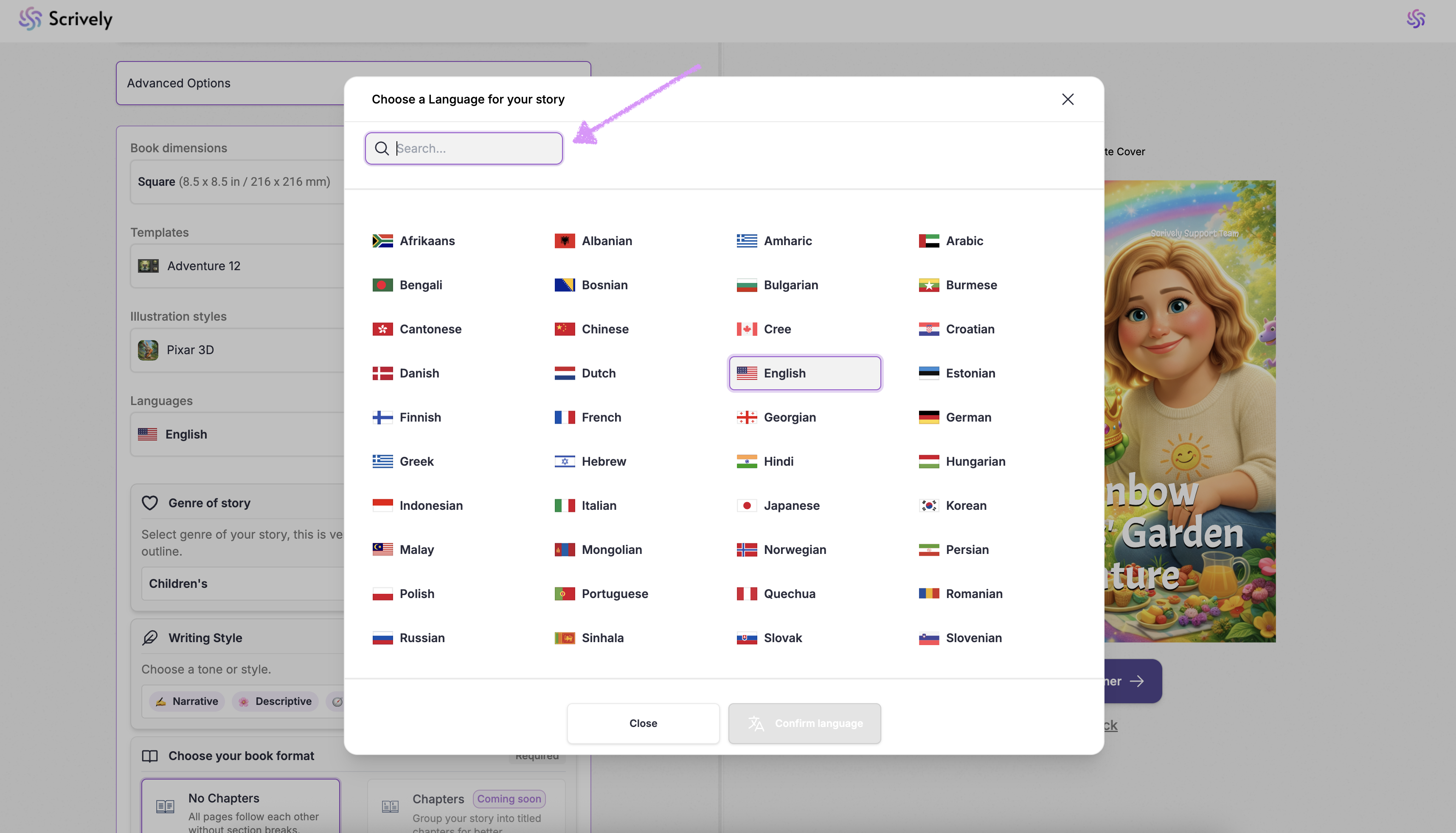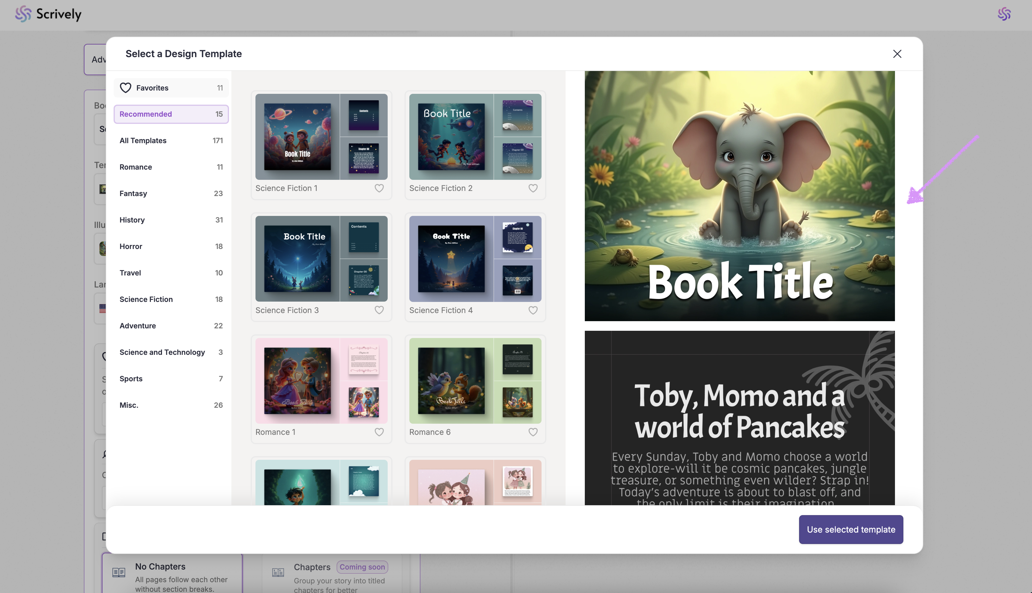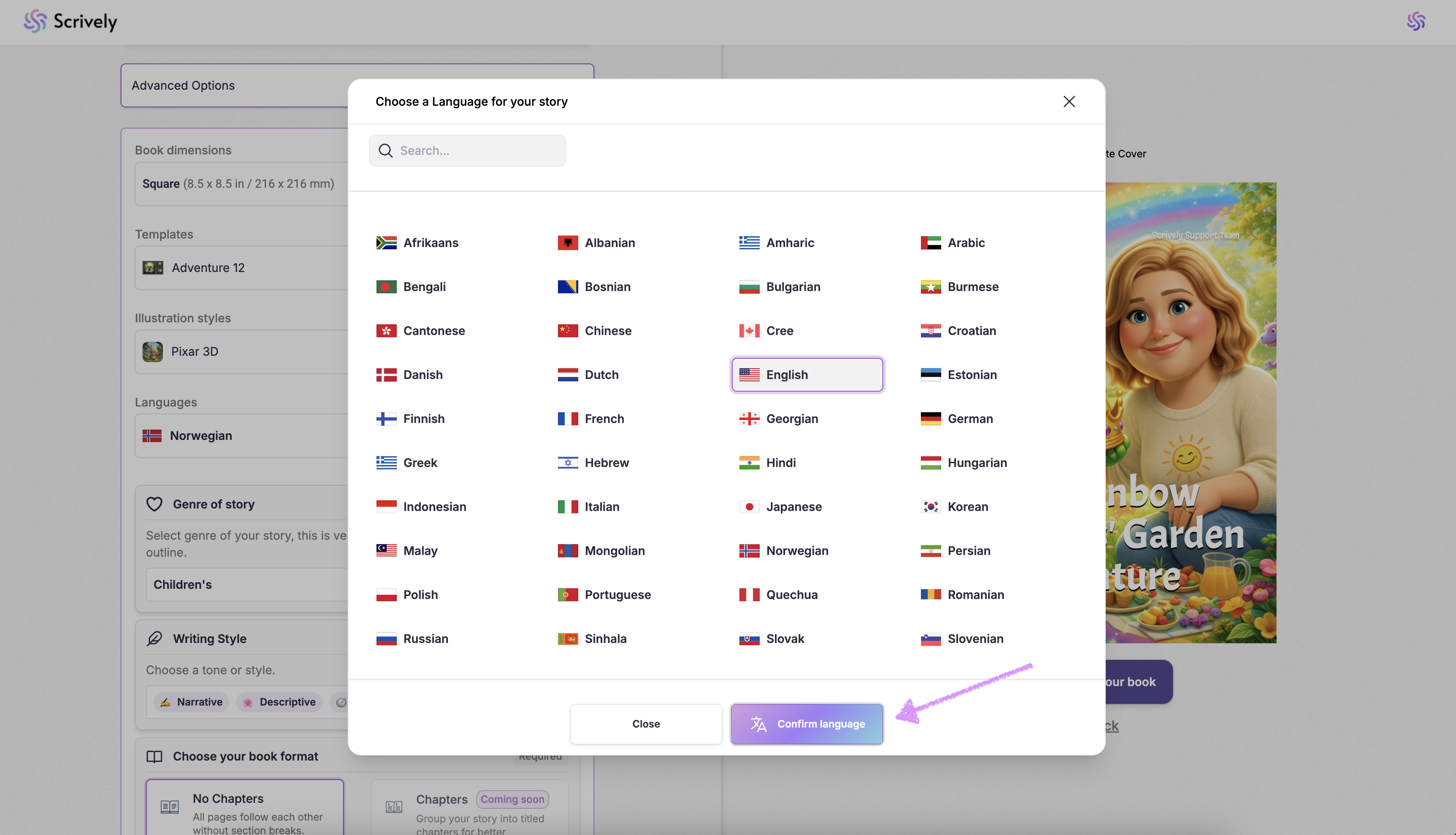 Scrively makes it easy with ready-made templates designed to kickstart your story. You can choose your book’s dimensions, illustration style, language, and template to set the structure, tone, and pacing, whether you’re creating a children’s book, a sci-fi adventure, or a historical drama.
