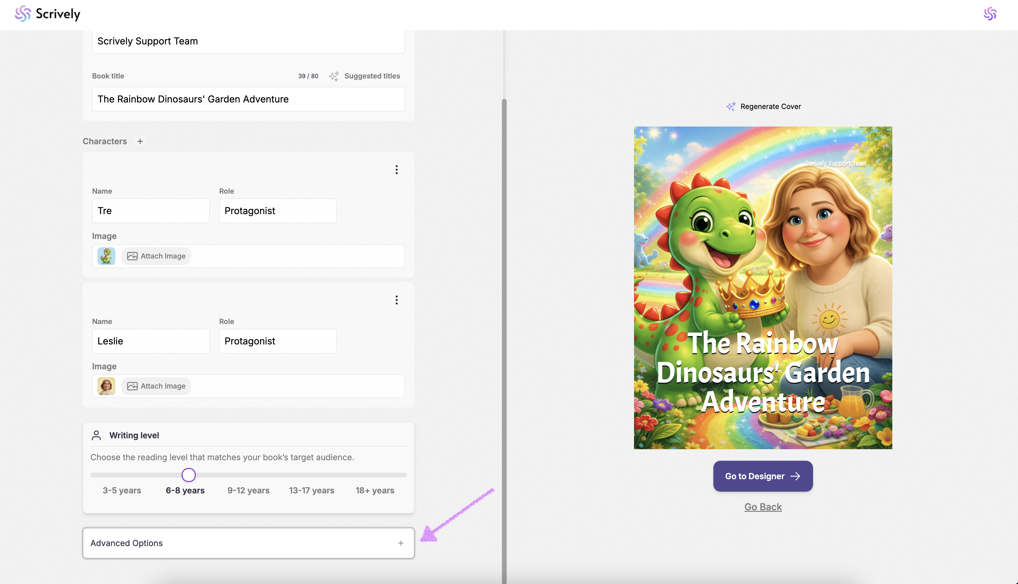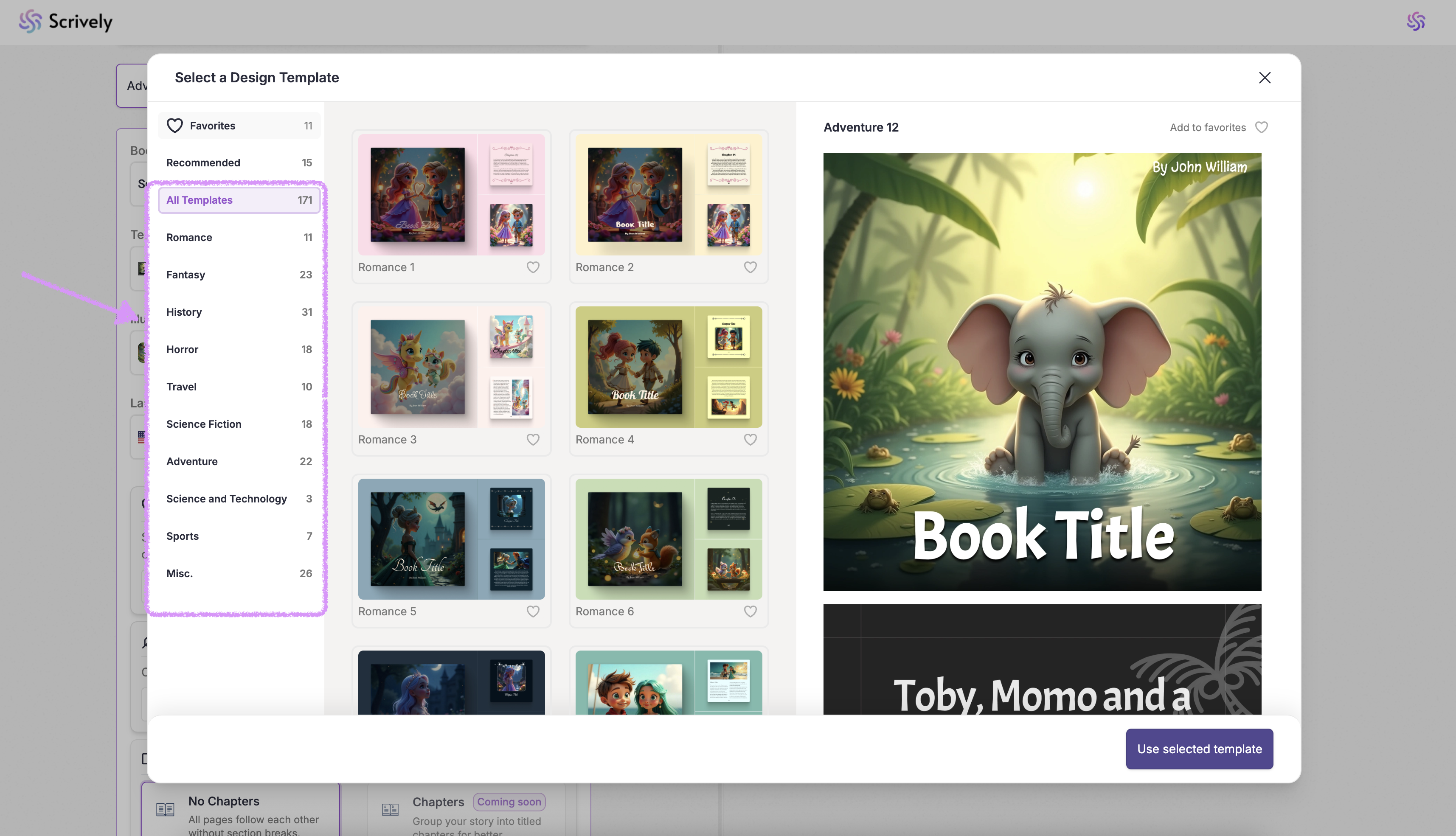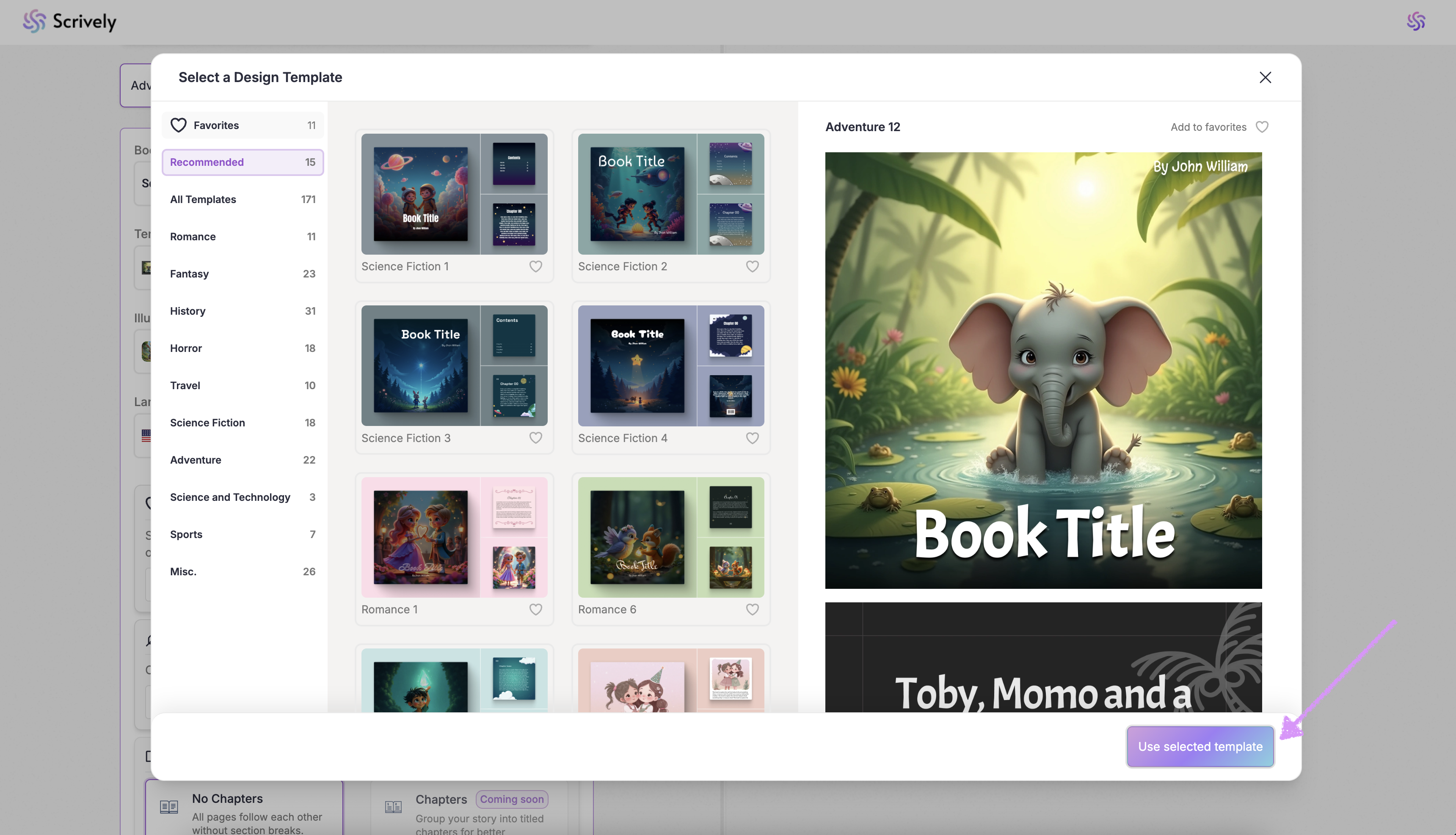 Scrively makes it easy with ready-made templates designed to kickstart your story. You can choose your book’s dimensions, illustration style, language, and template to set the structure, tone, and pacing, whether you’re creating a children’s book, a sci-fi adventure, or a historical drama.