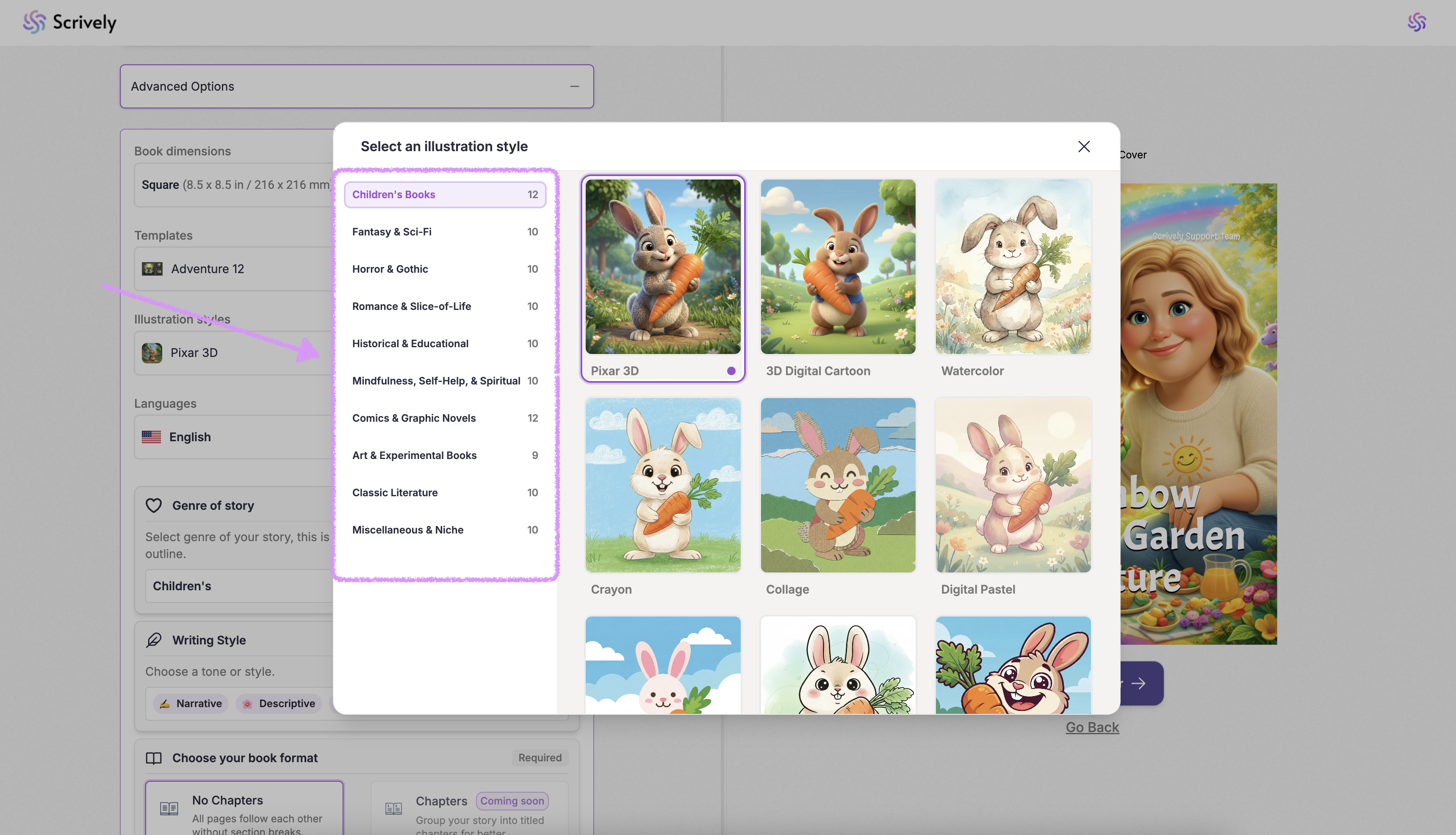 Browse through the available illustration styles and choose the one that best fits your story.