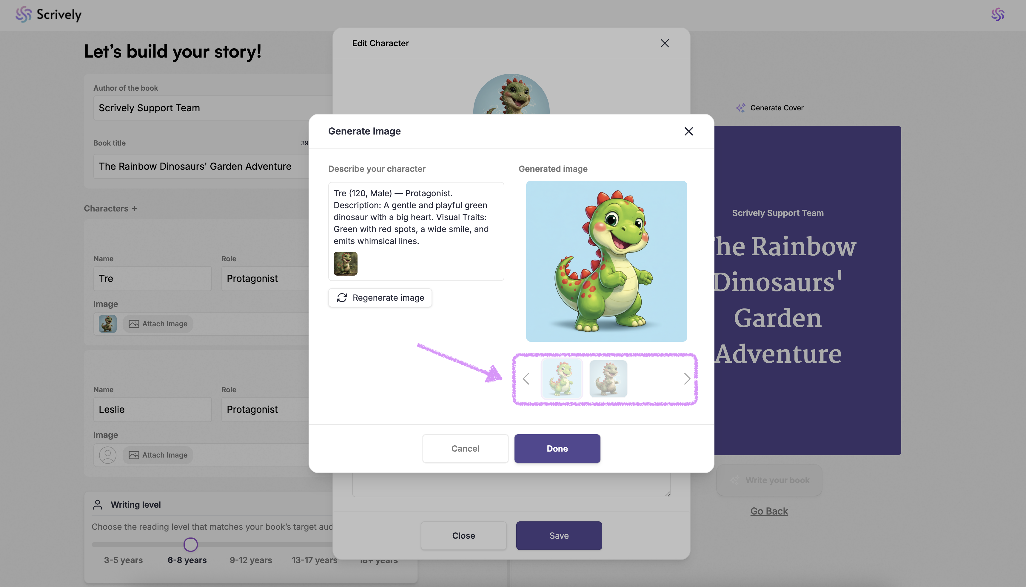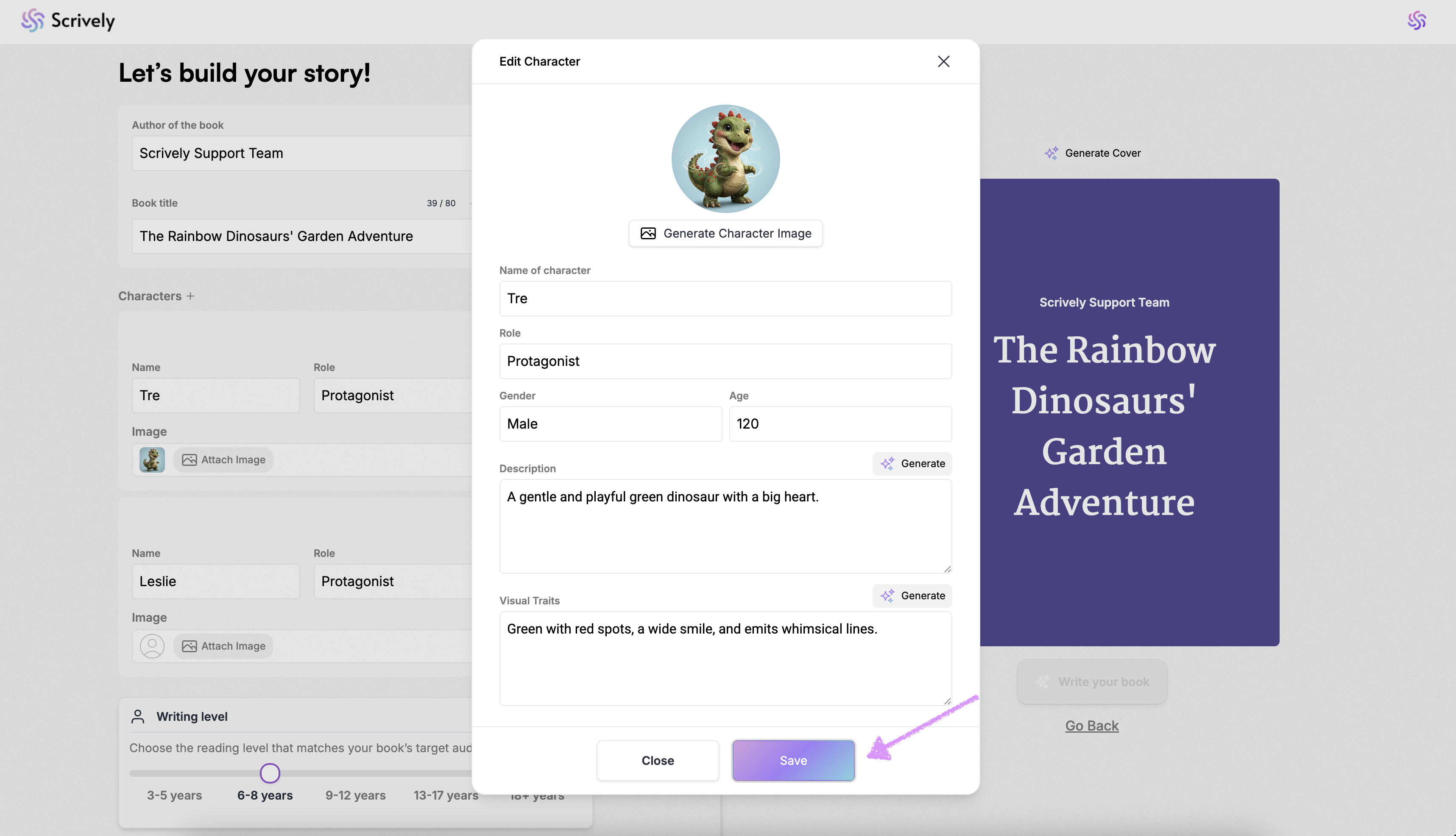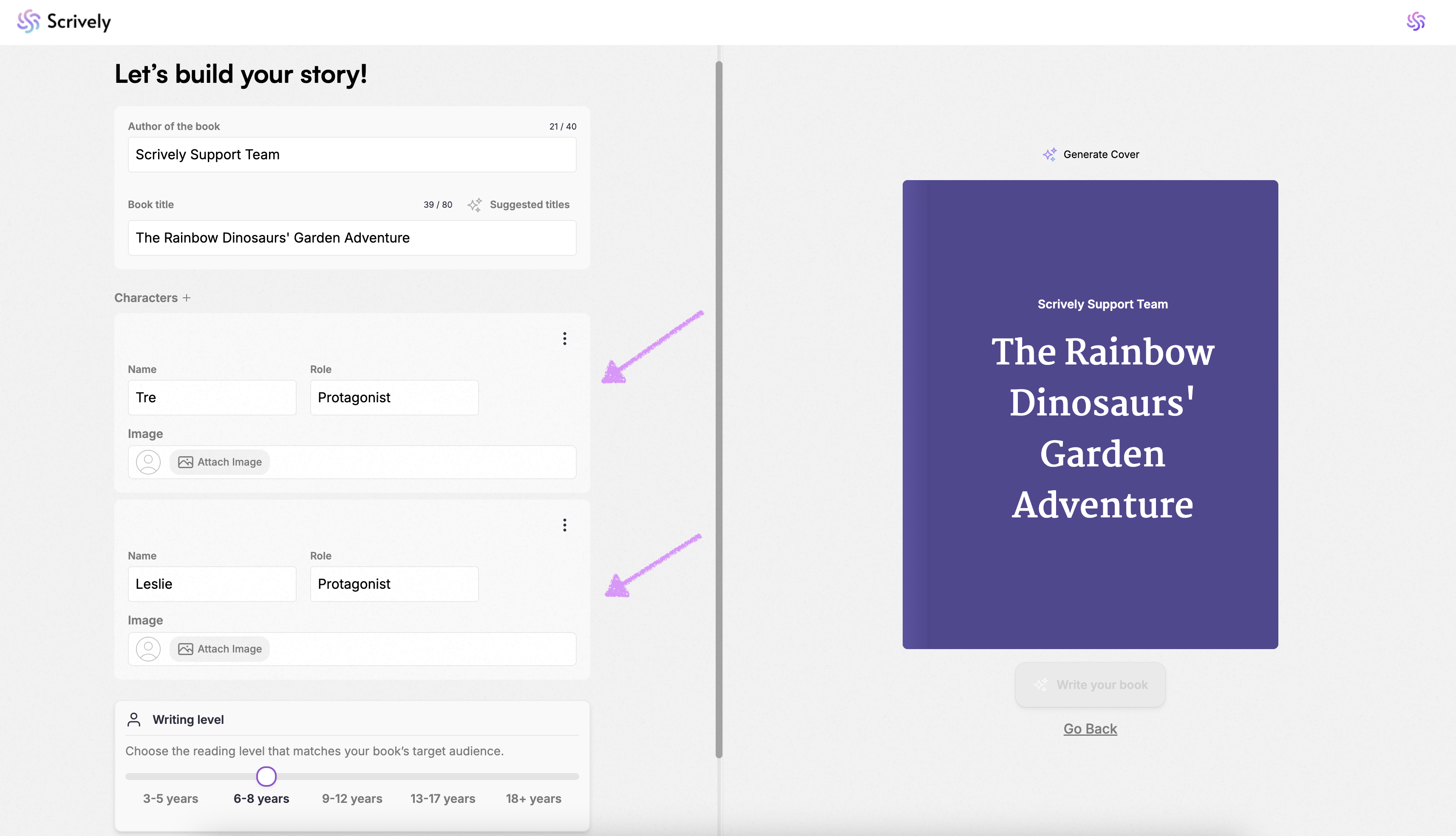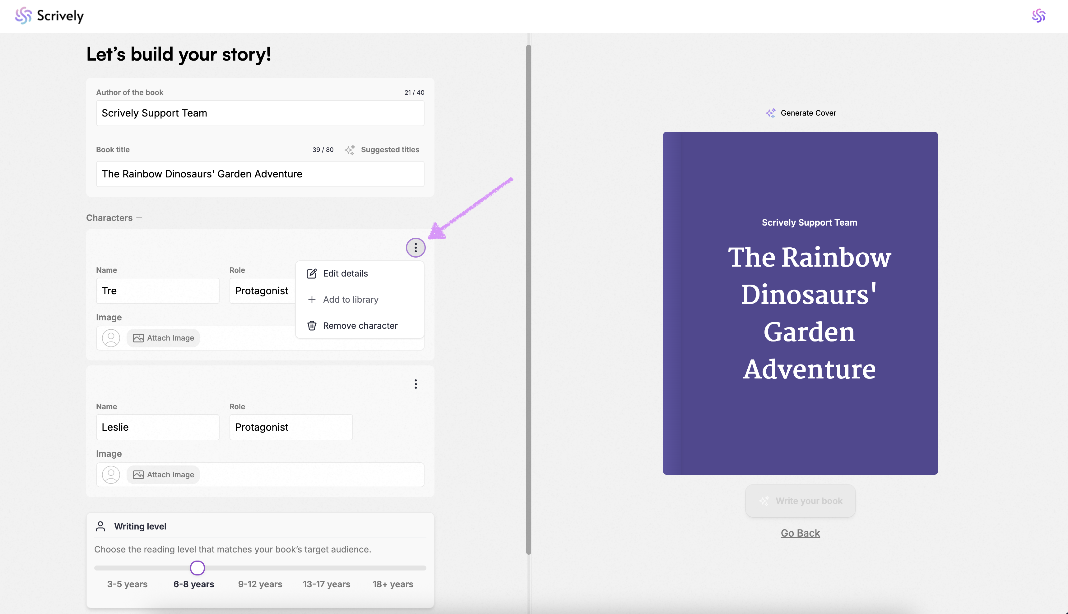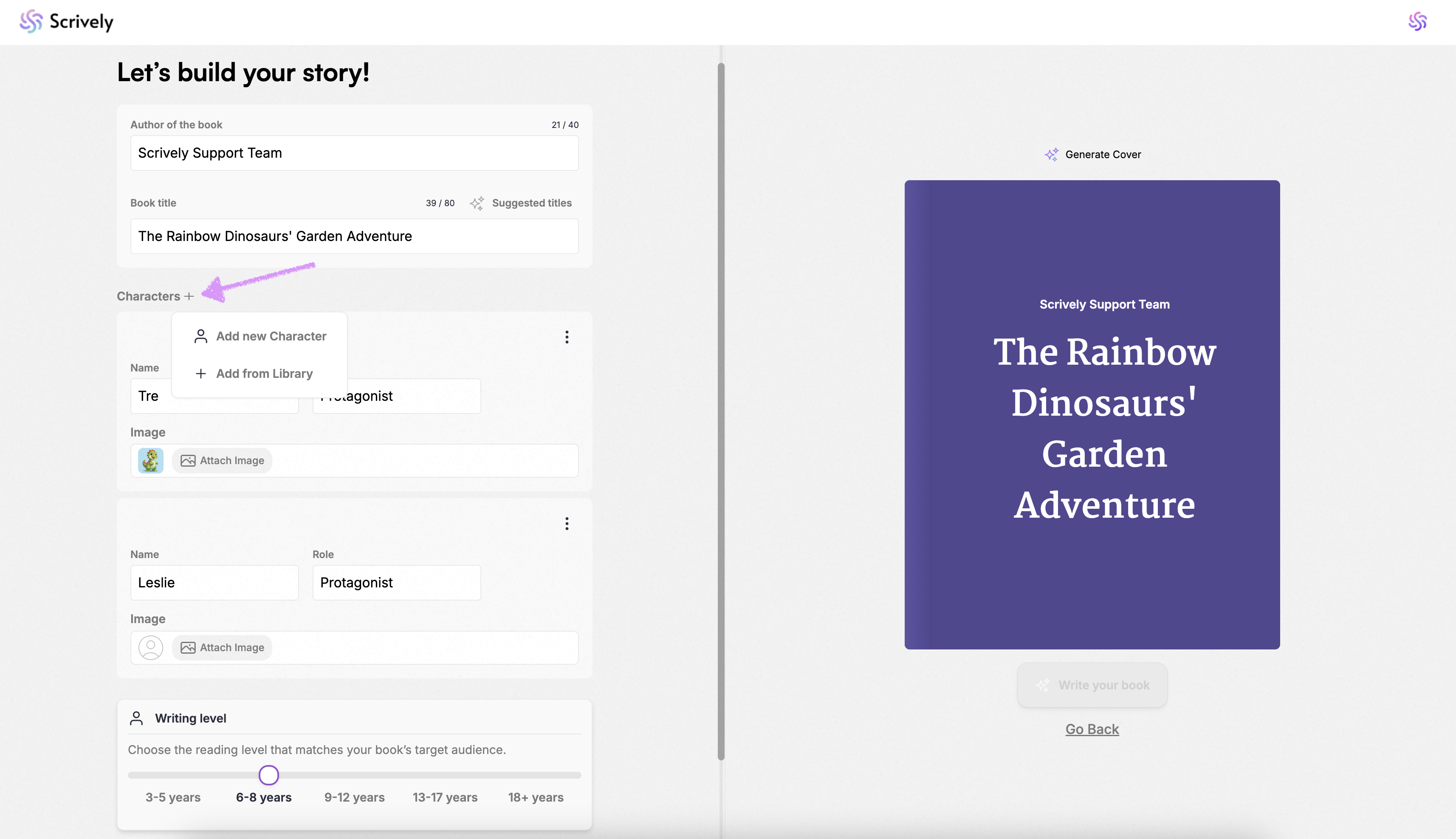 Scrively will generate character suggestions tailored to your storybook details, helping you bring your story to life with relevant and engaging personalities.