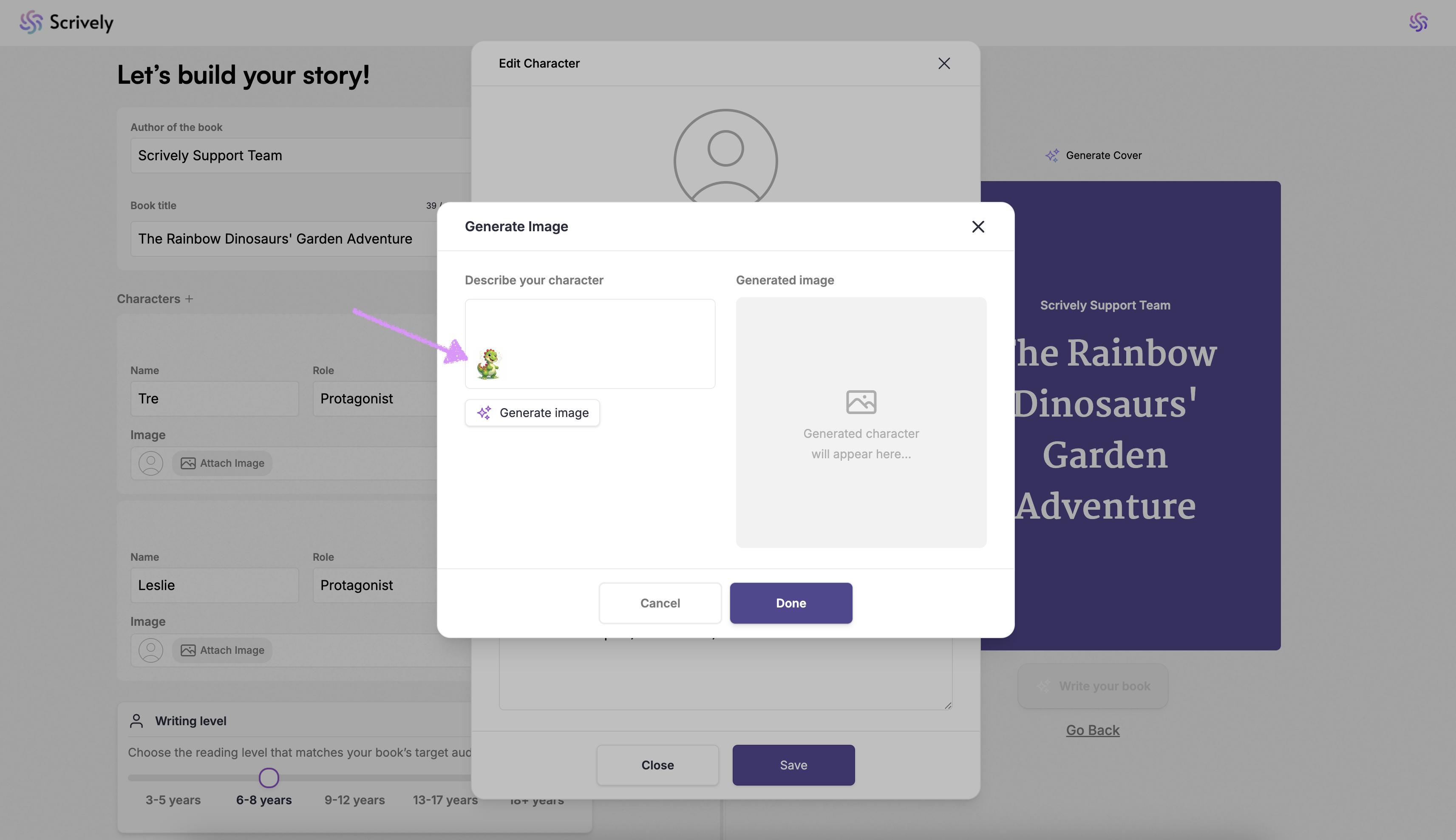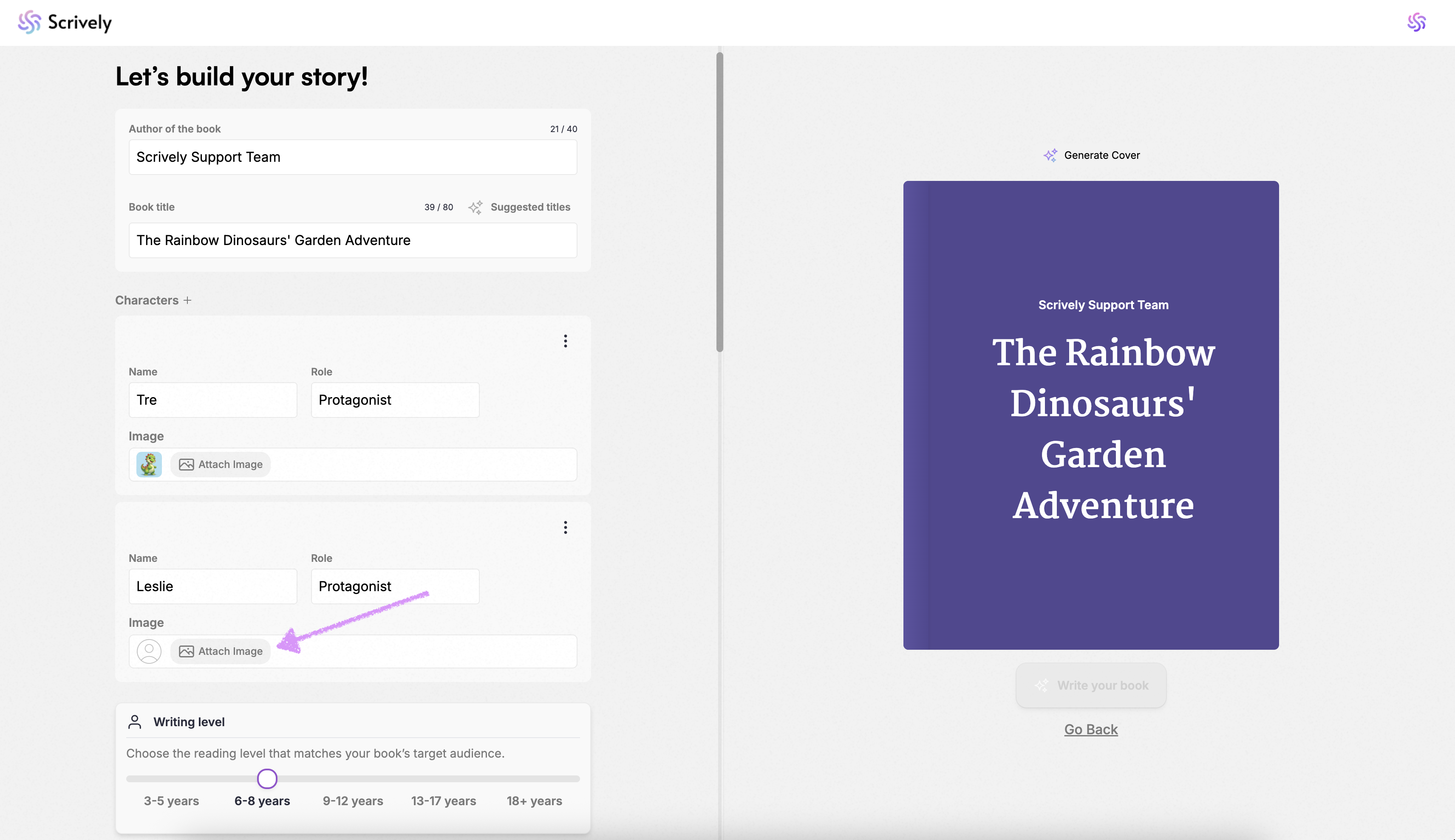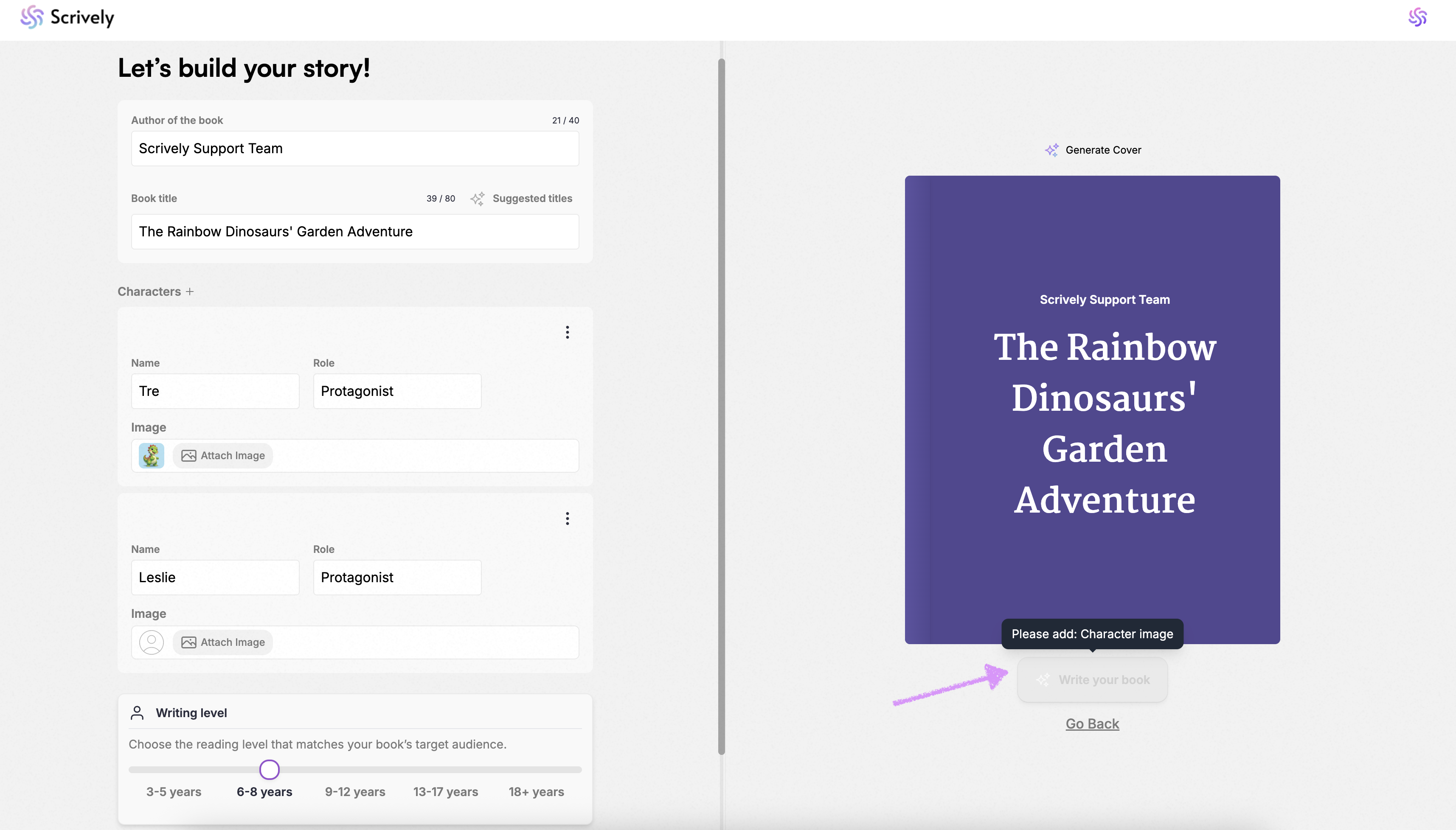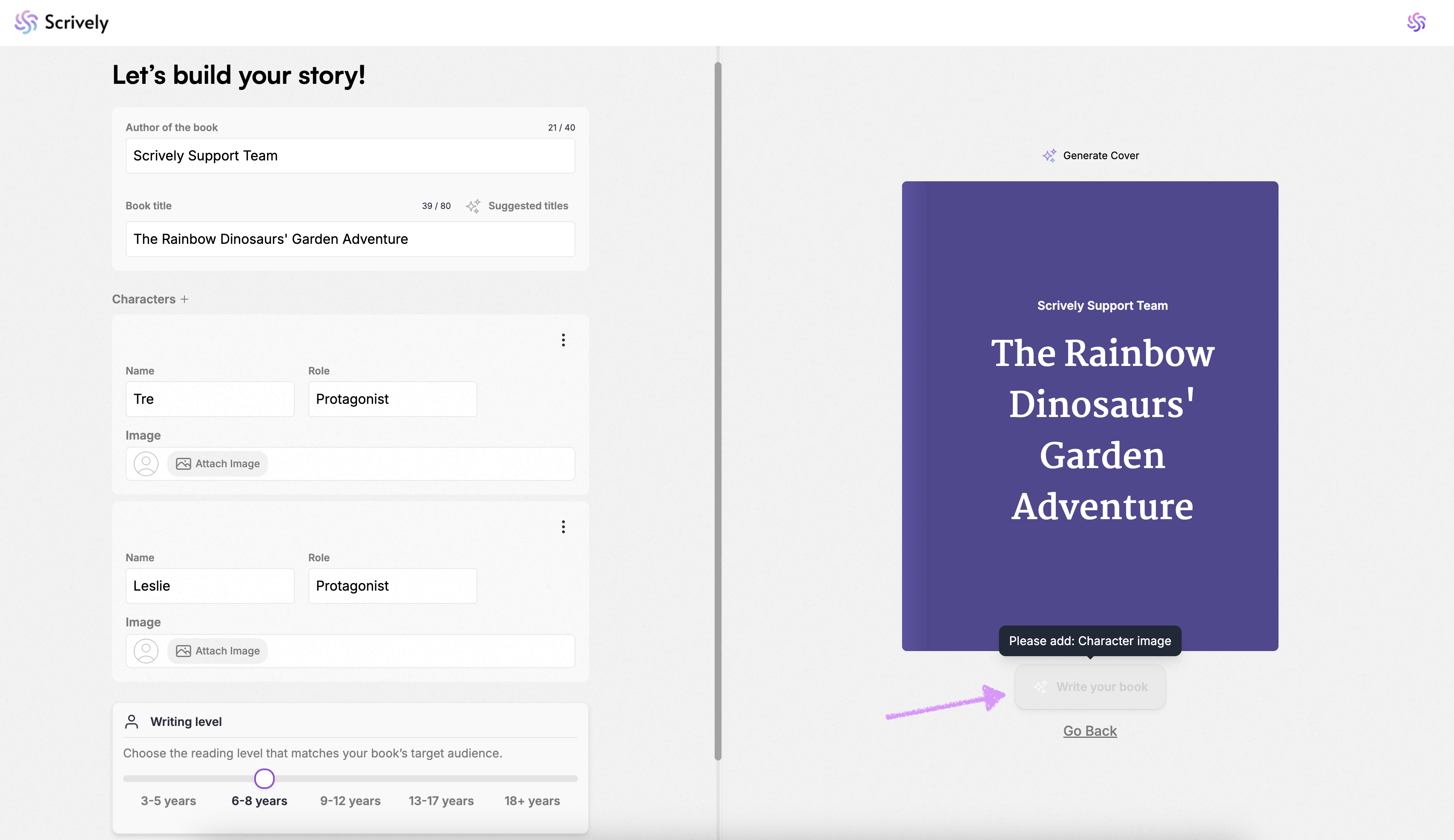 To ensure accurate and high-quality illustrations in your storybook, each character should have an associated image. If a character doesn’t have an image, you will not be able to proceed with writing the book.