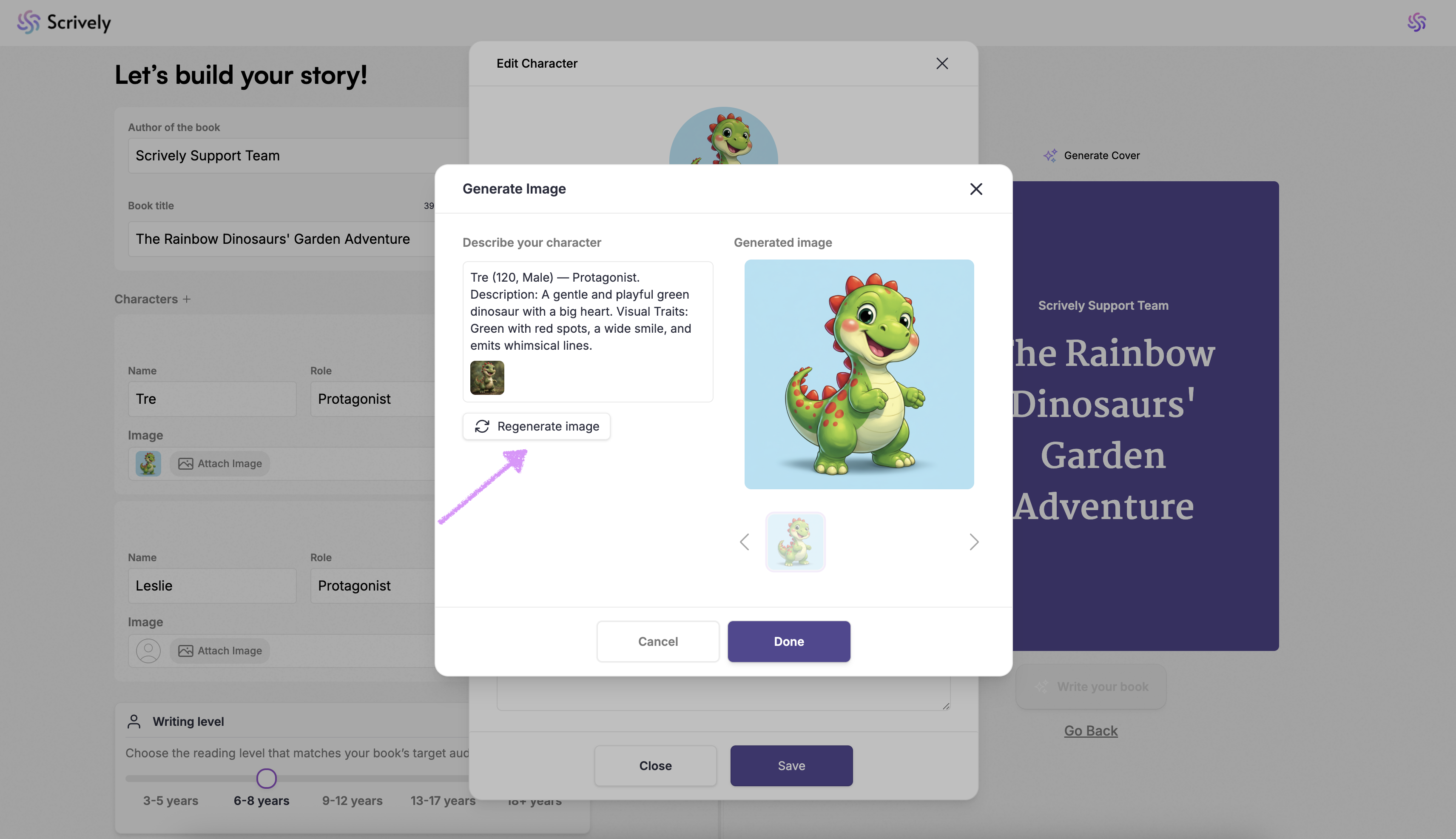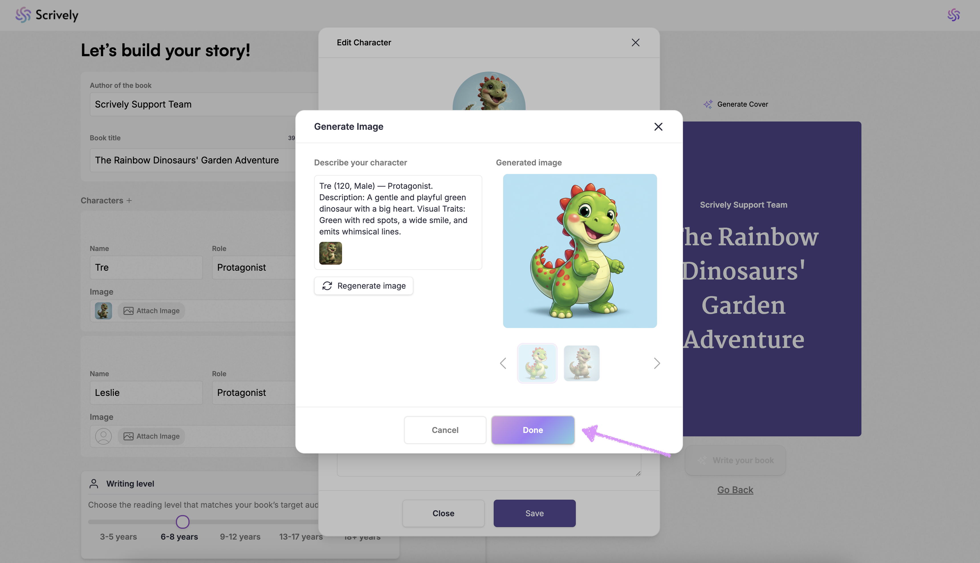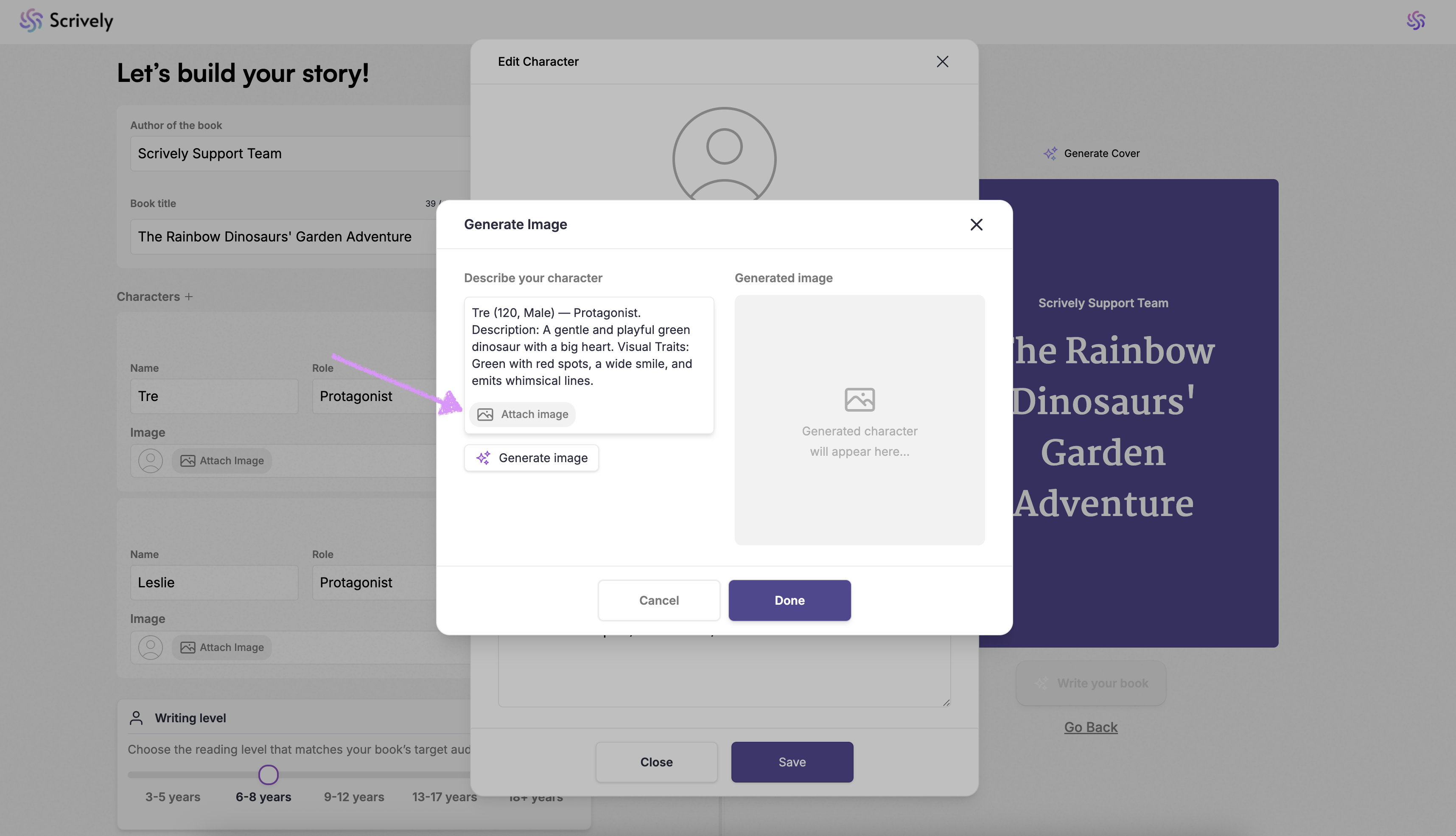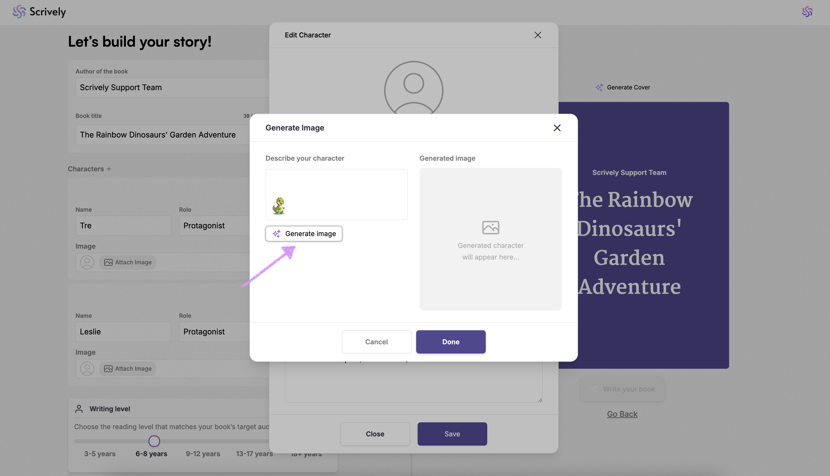 To ensure accurate and high-quality illustrations in your storybook, each character should have an associated image. If a character doesn’t have an image, you will not be able to proceed with writing the book.