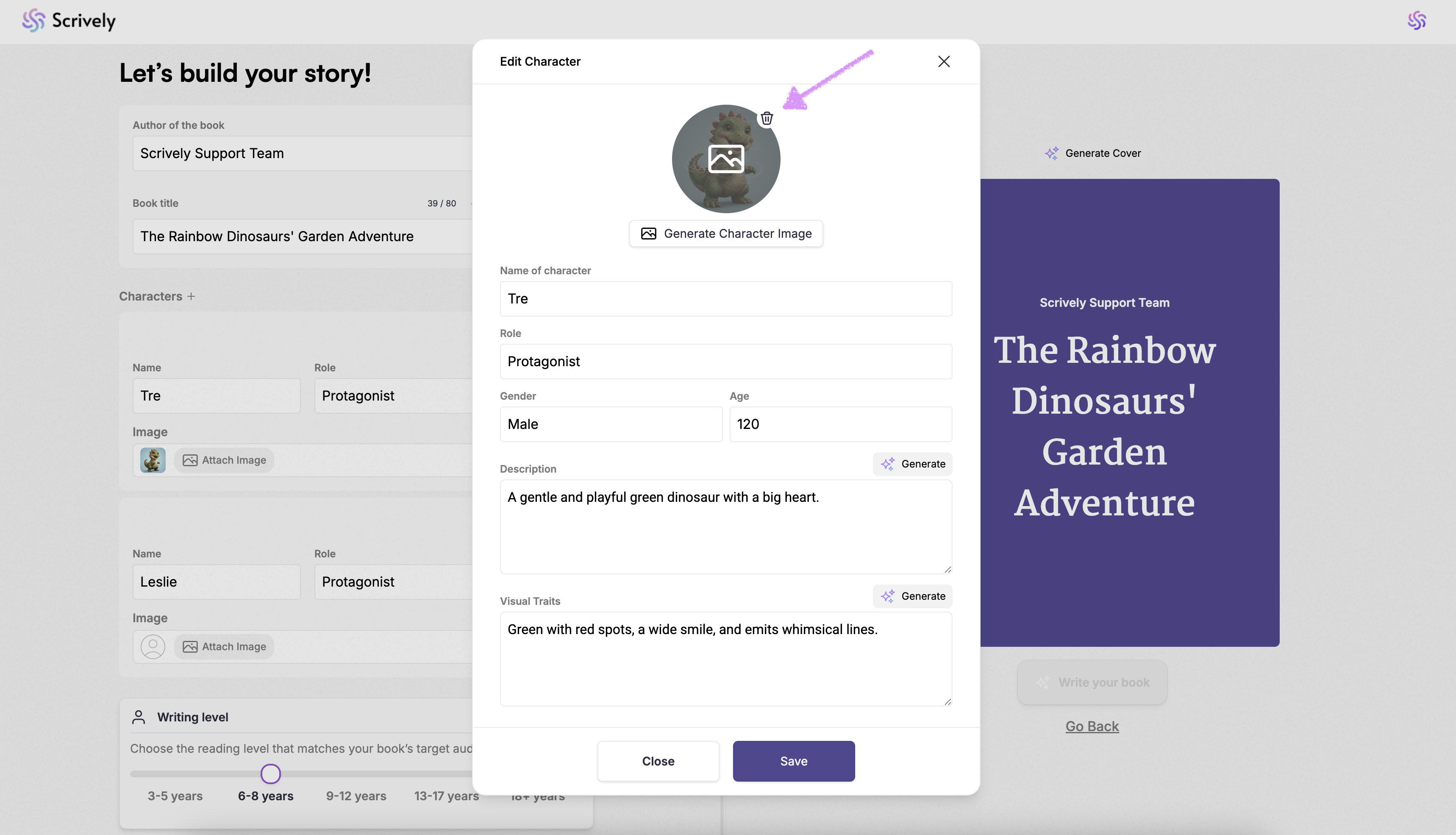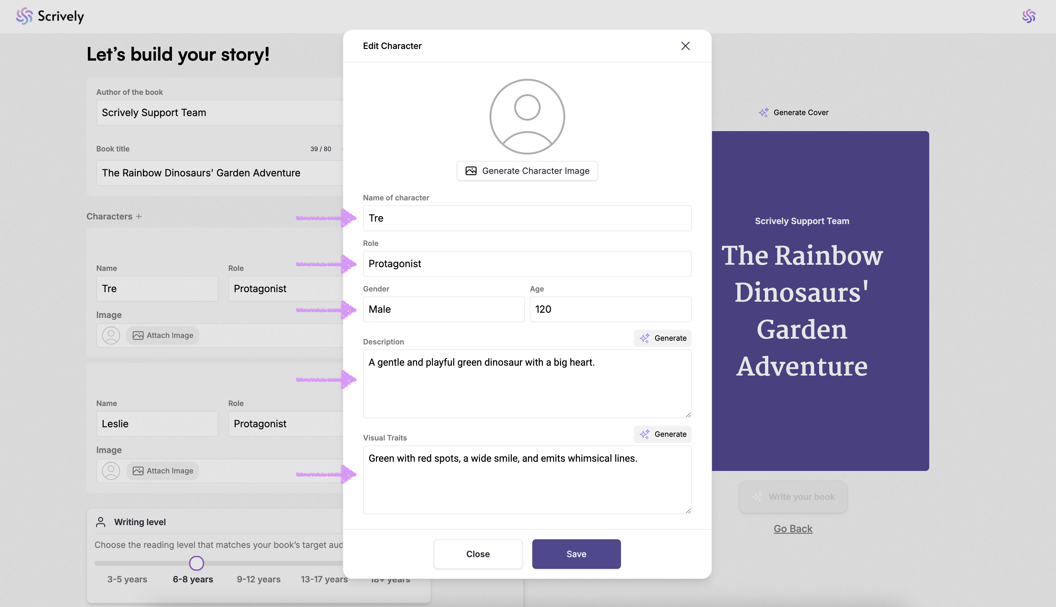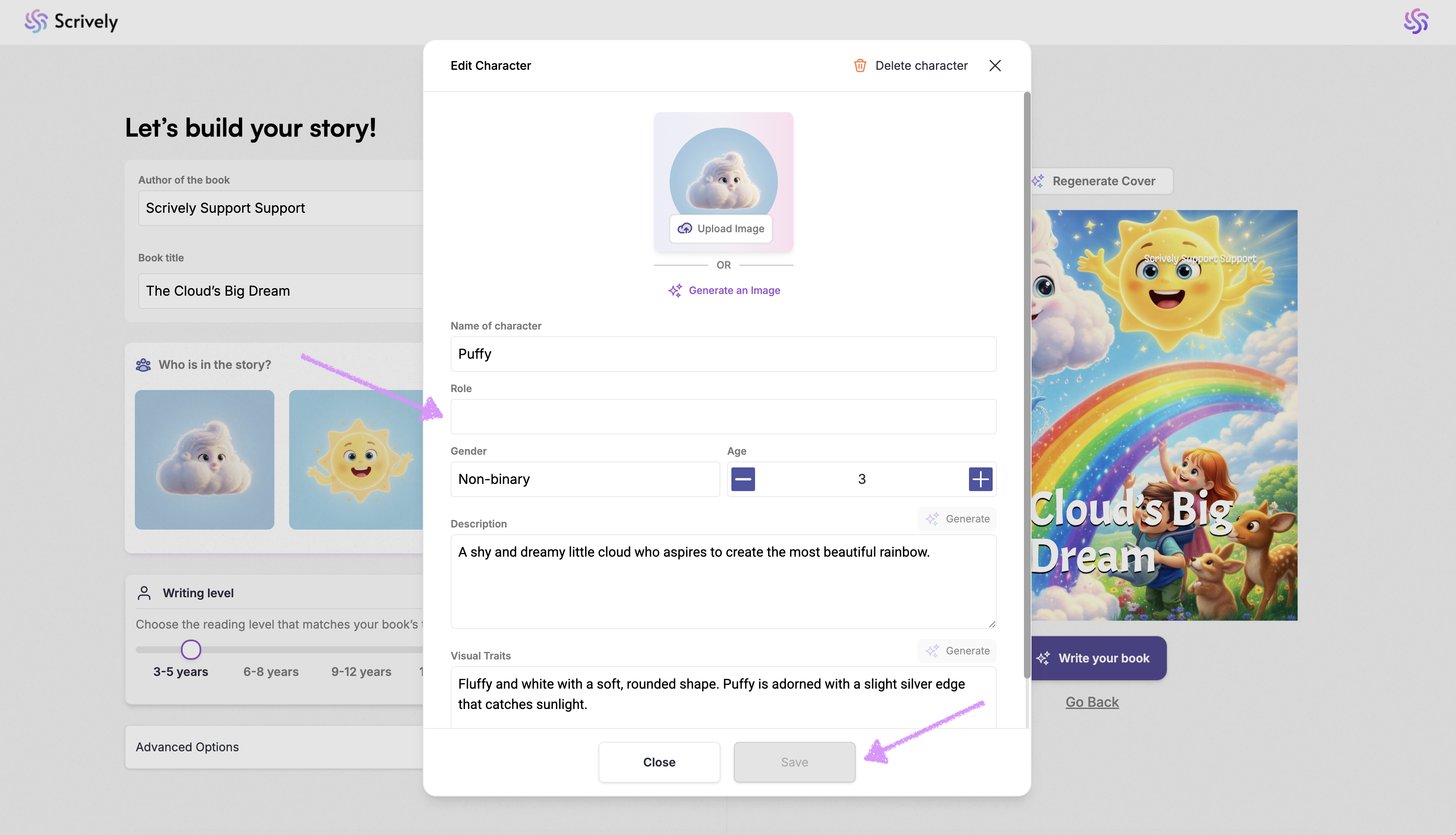 When you navigate to “Edit Details,” the character’s information will be prefilled based on your storybook details. You can customize your character by editing details such as their name, role, gender, age, description and add visual traits to shape their personality and relevance to your story.