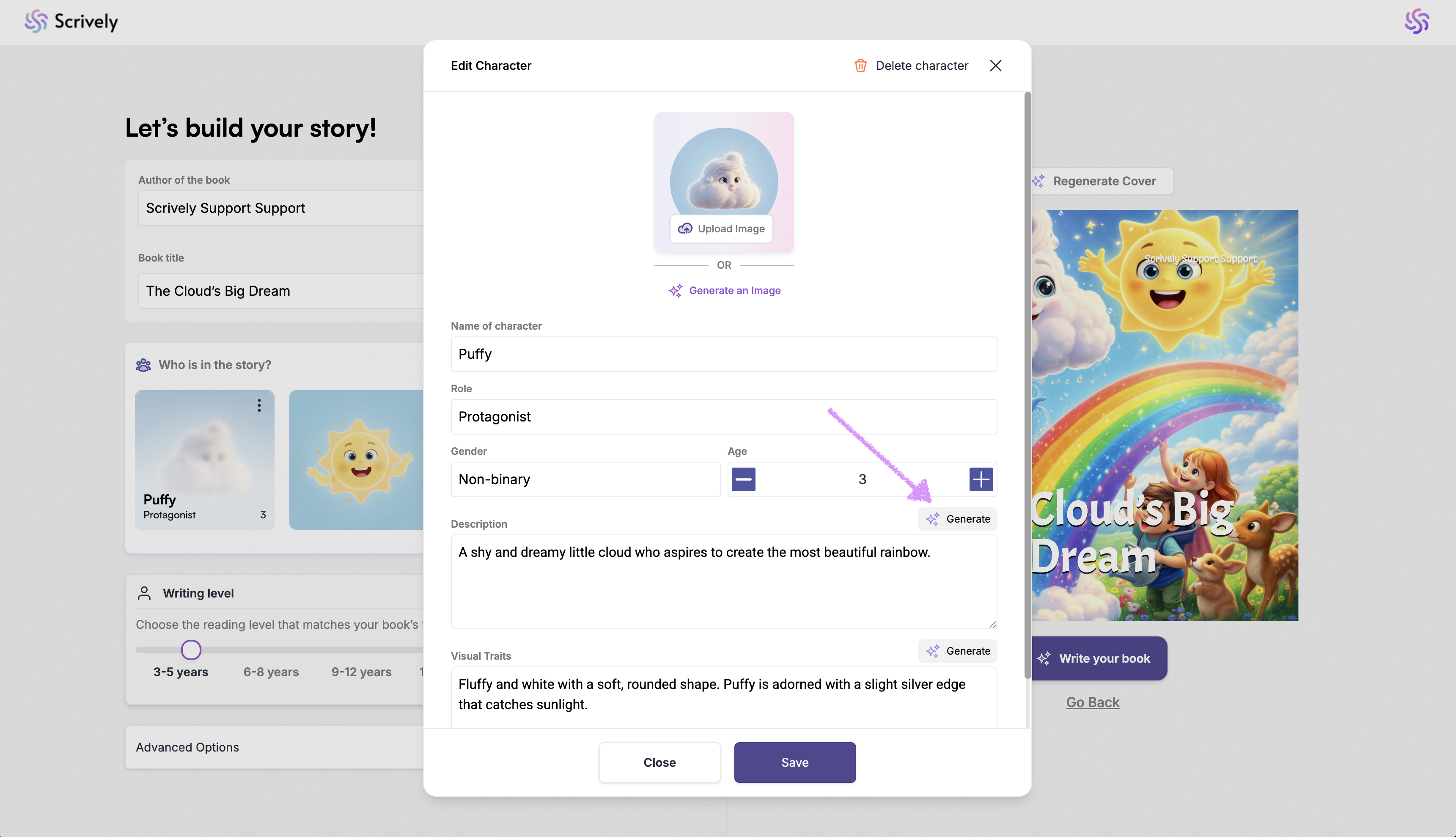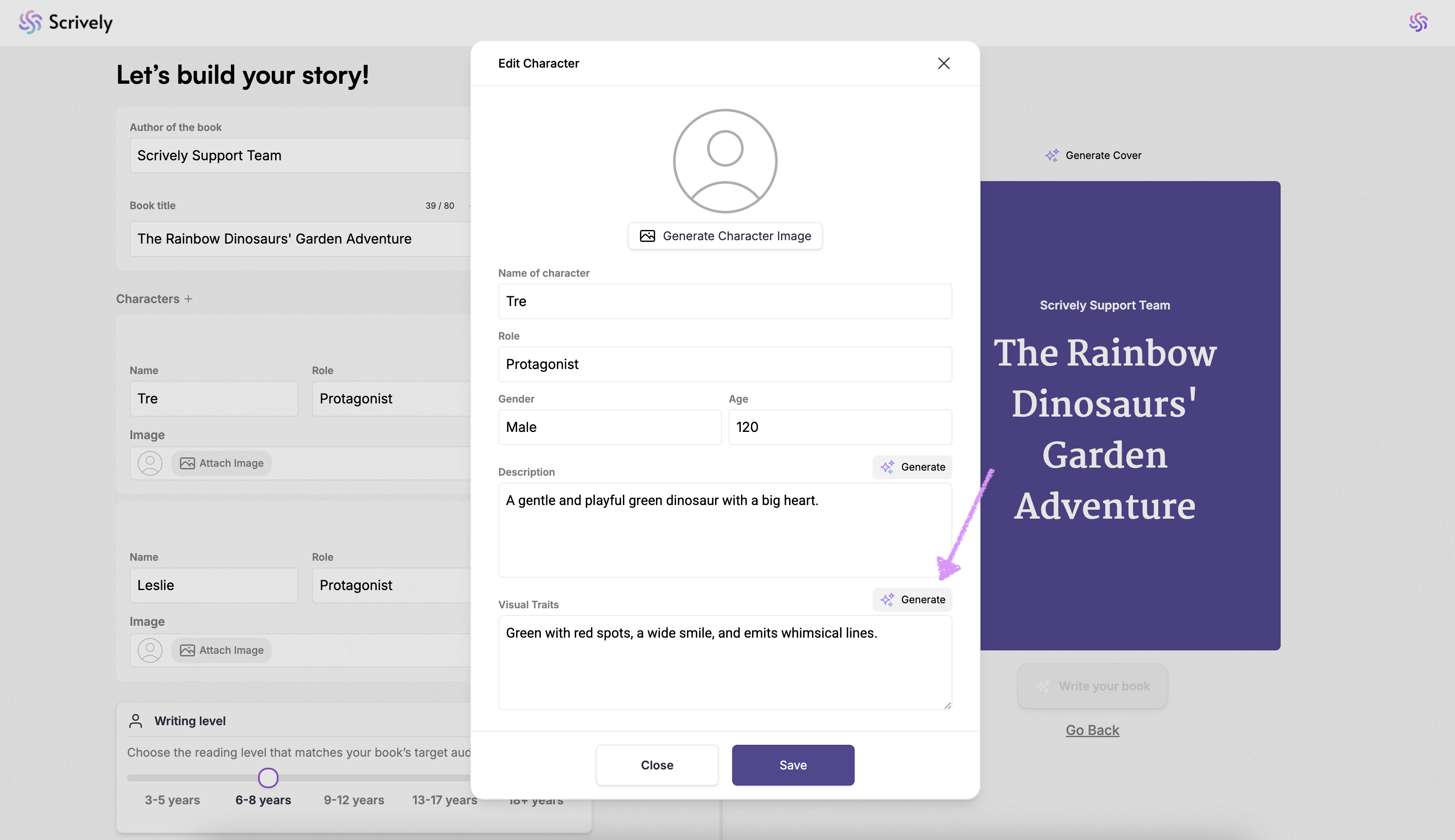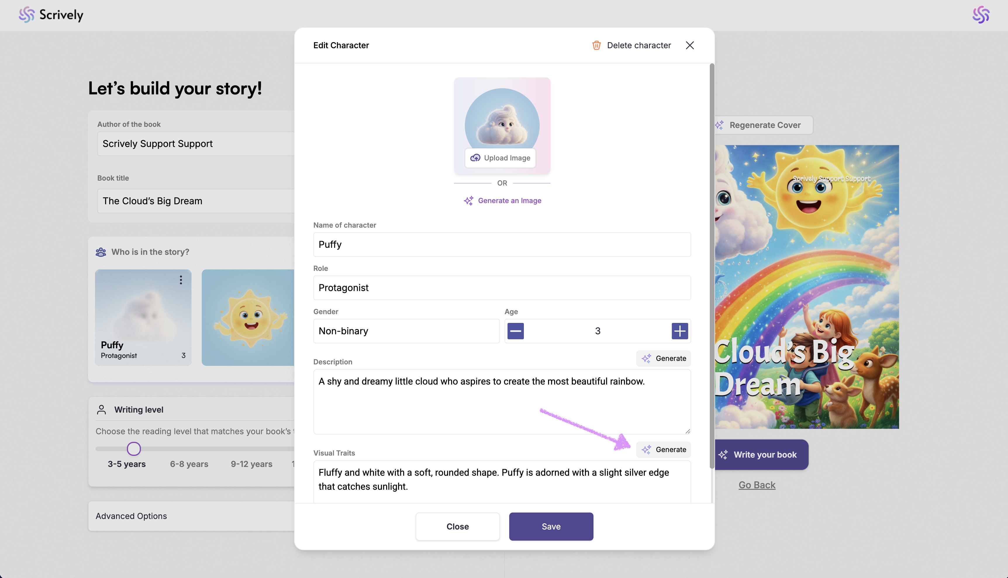 Need help with your character’s visual traits? Use the “Generate” option, and Scrively will create the visual traits for you!