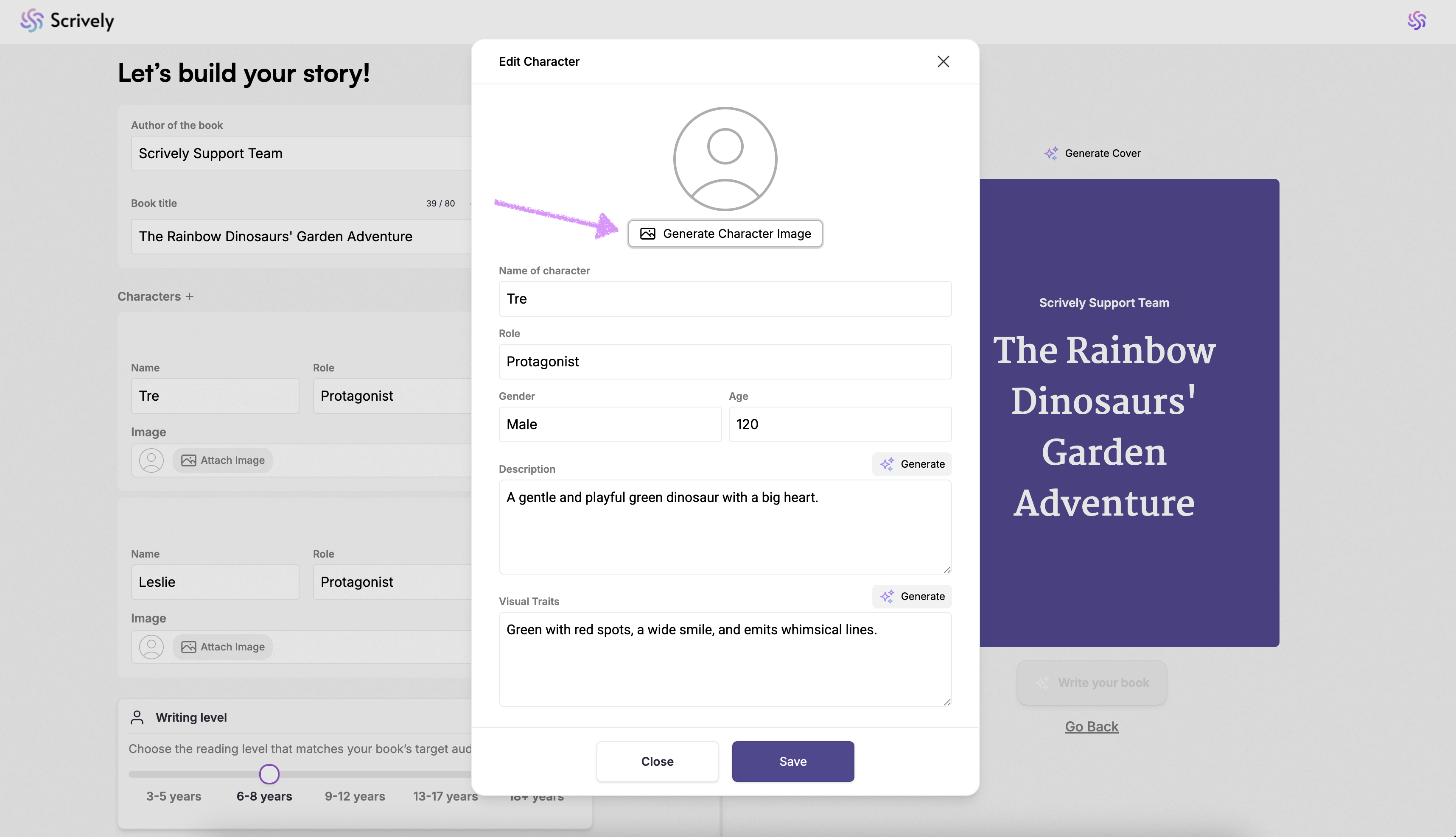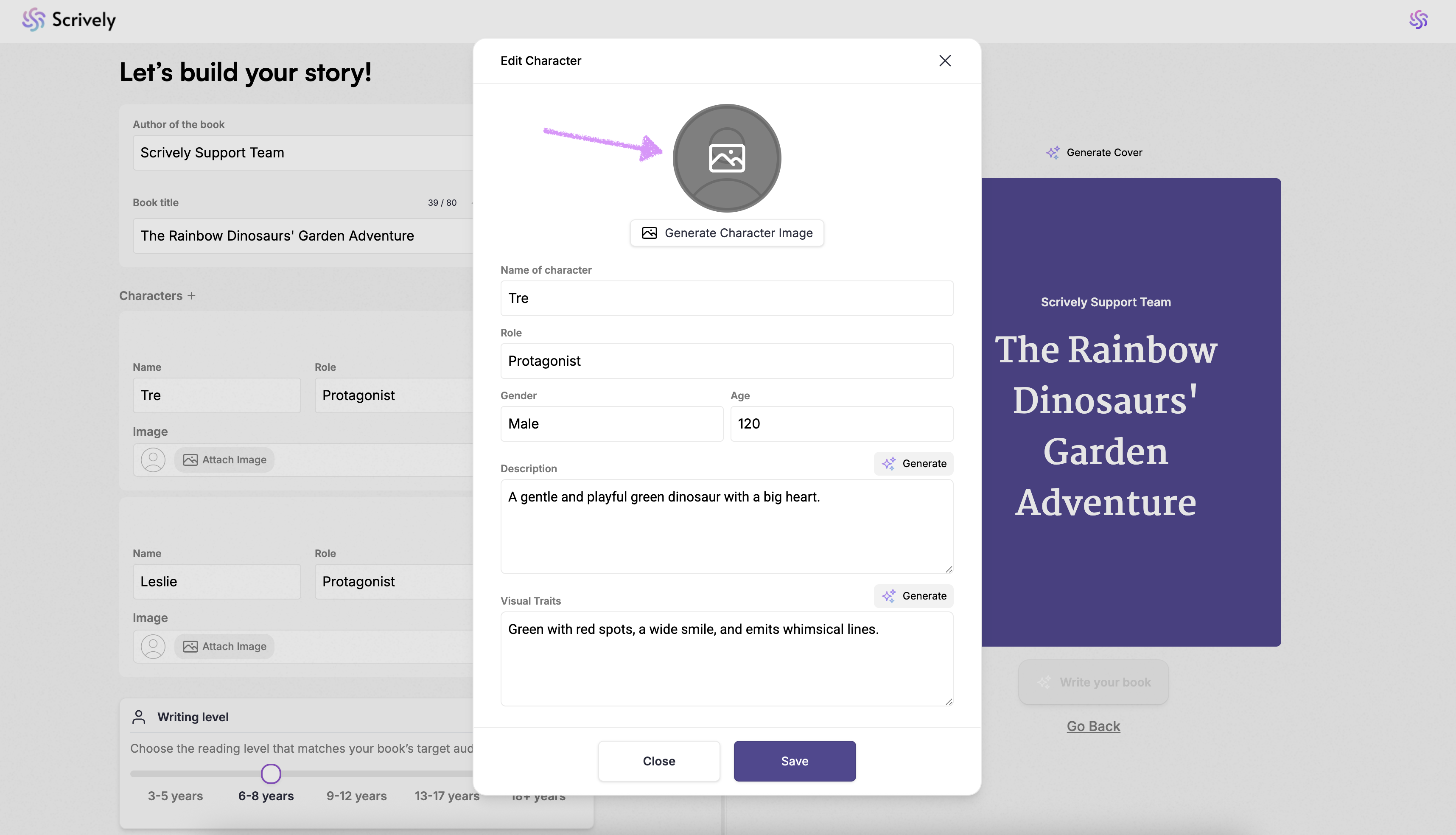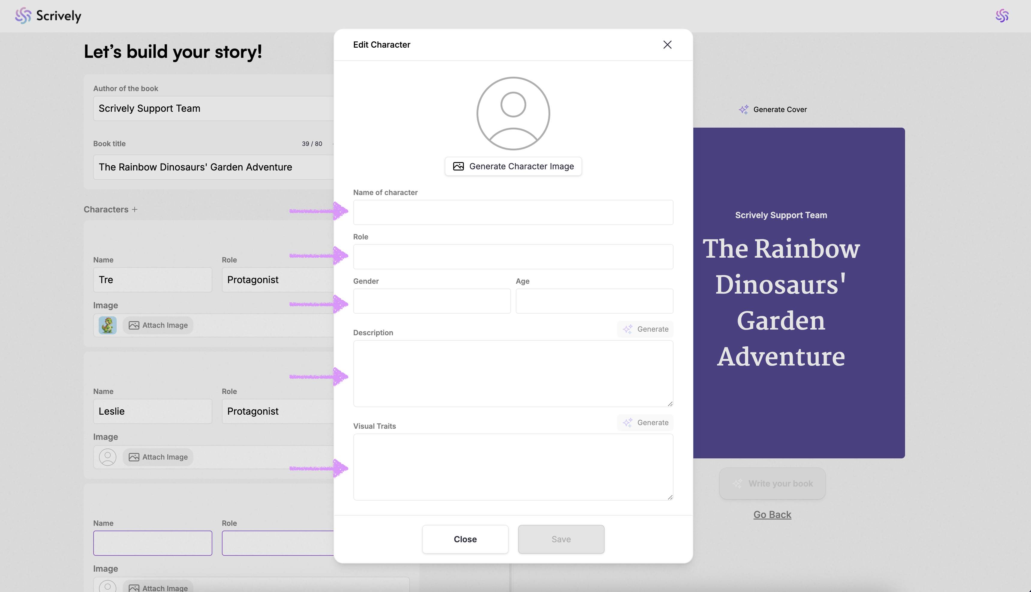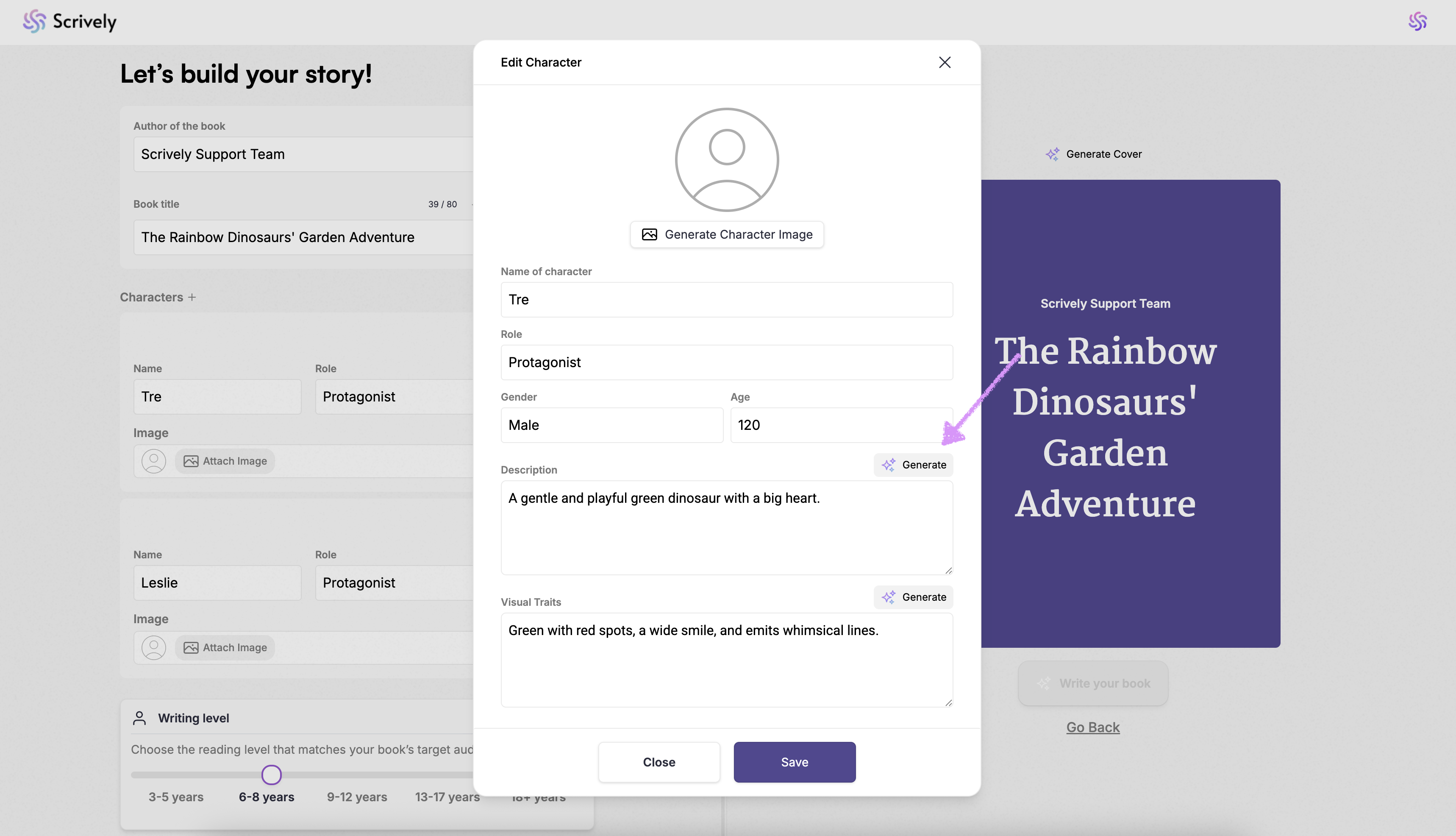 Need help with your character’s visual traits? Use the “Generate” option, and Scrively will create the visual traits for you!
