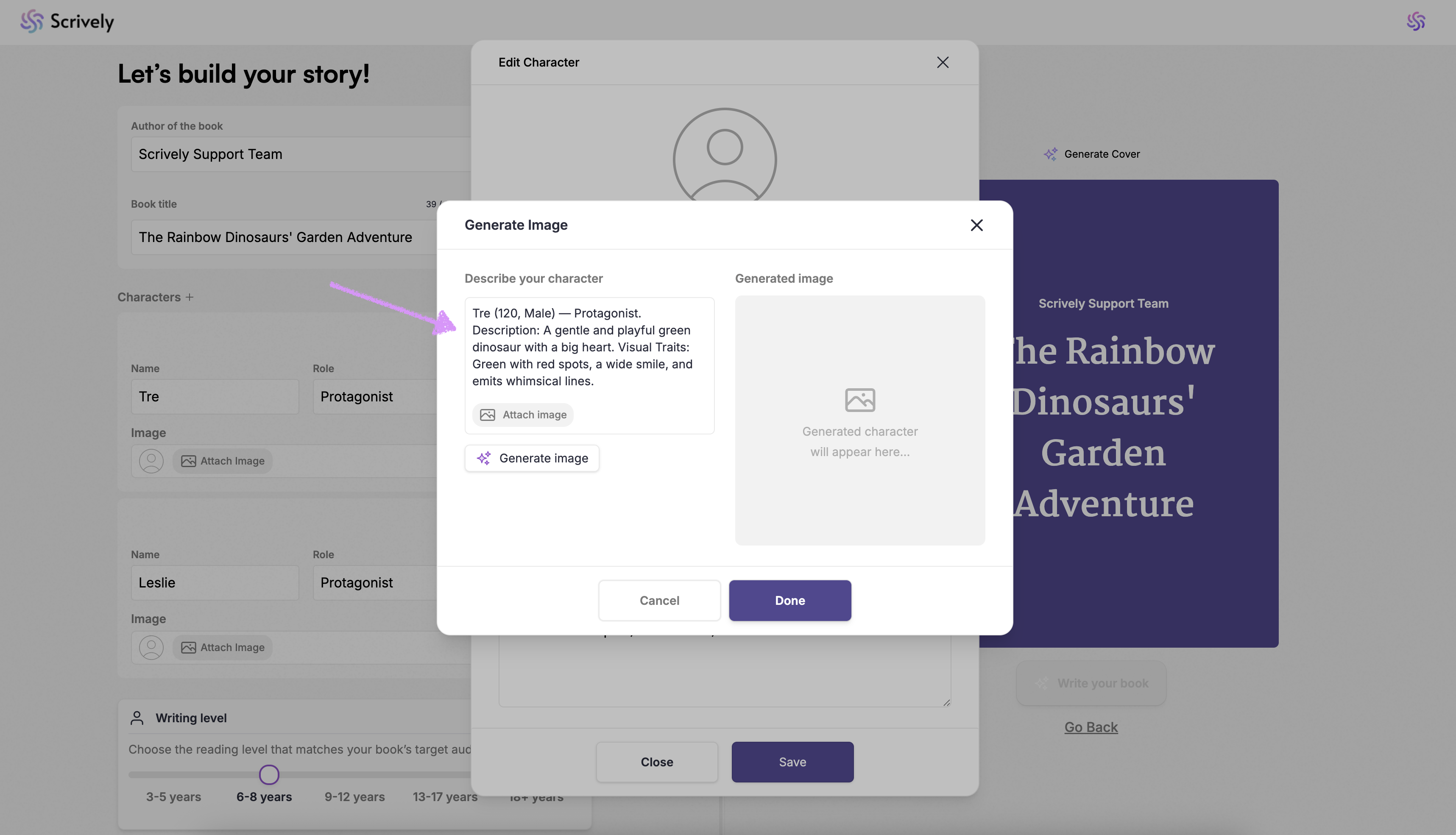 Need help with your character’s description? Use the “Generate” option, and Scrively will create a character description for you!