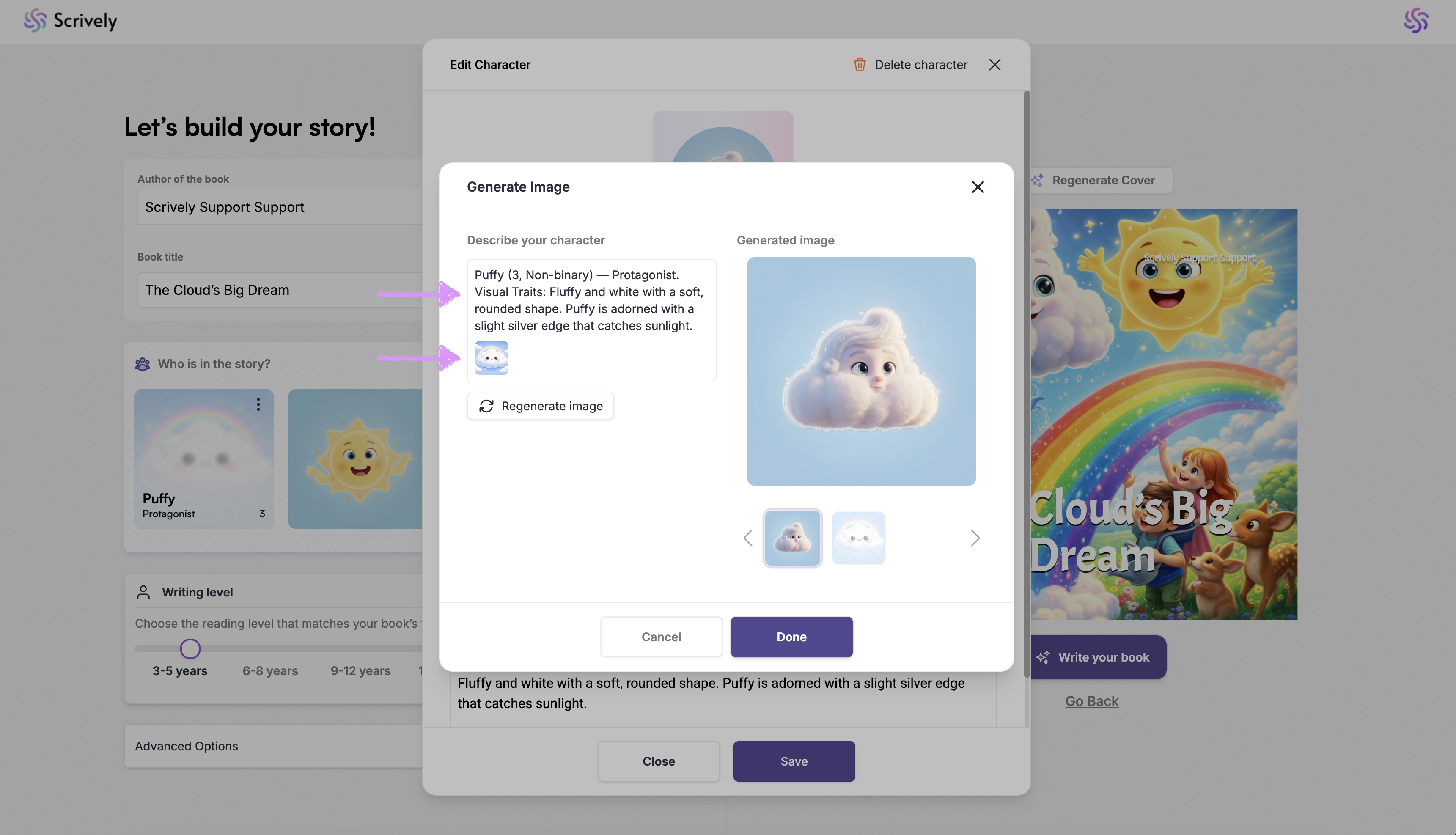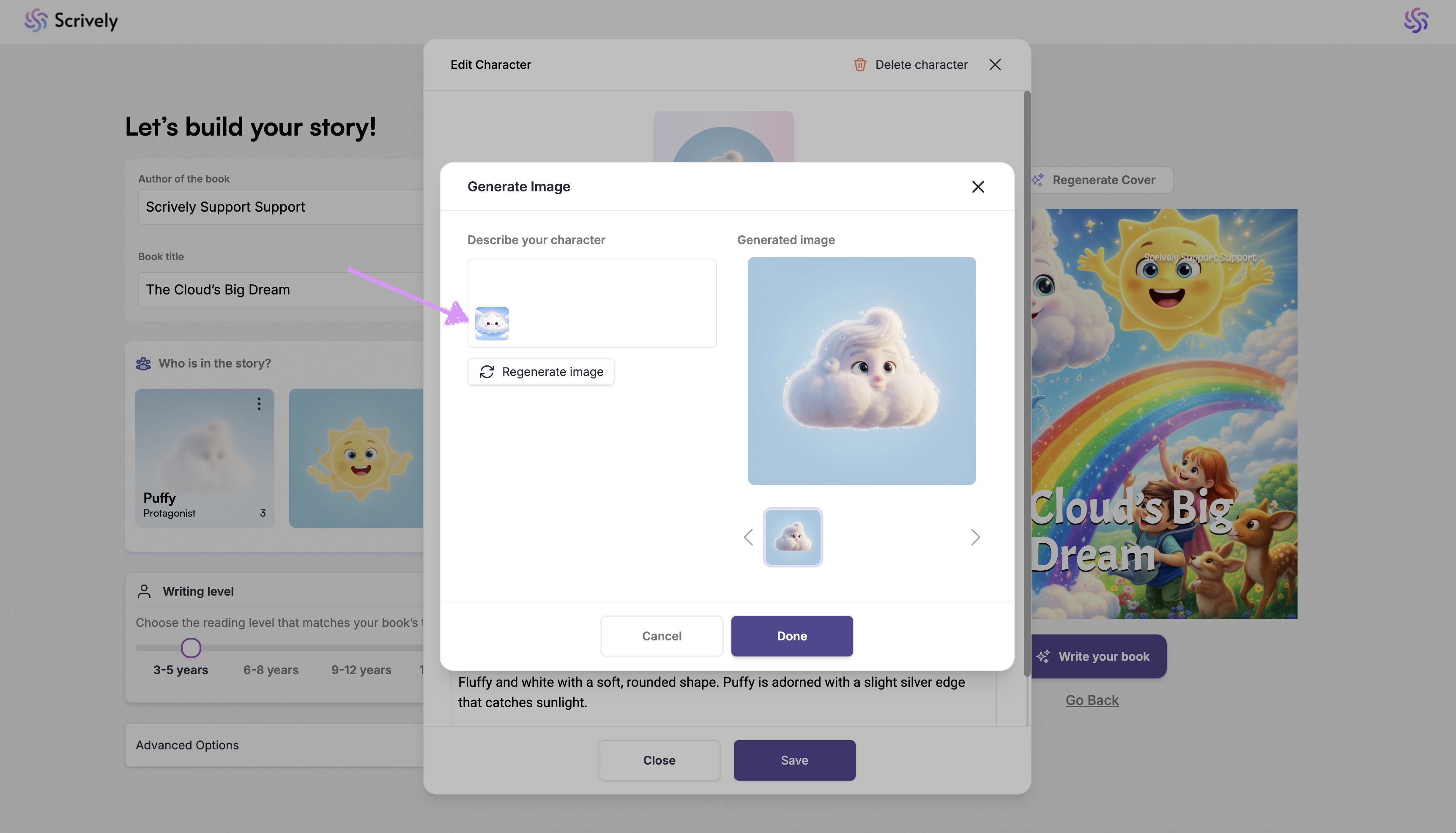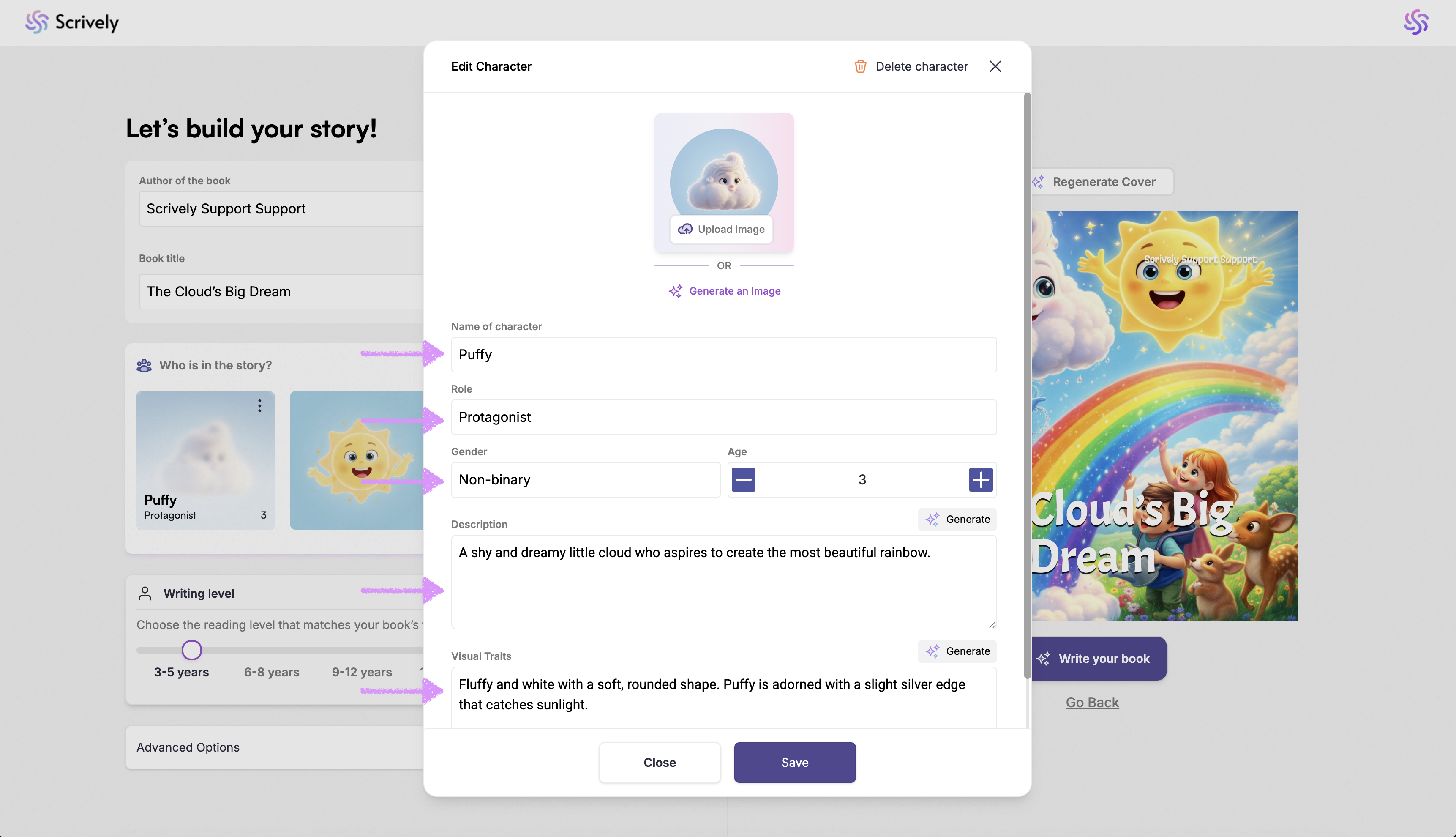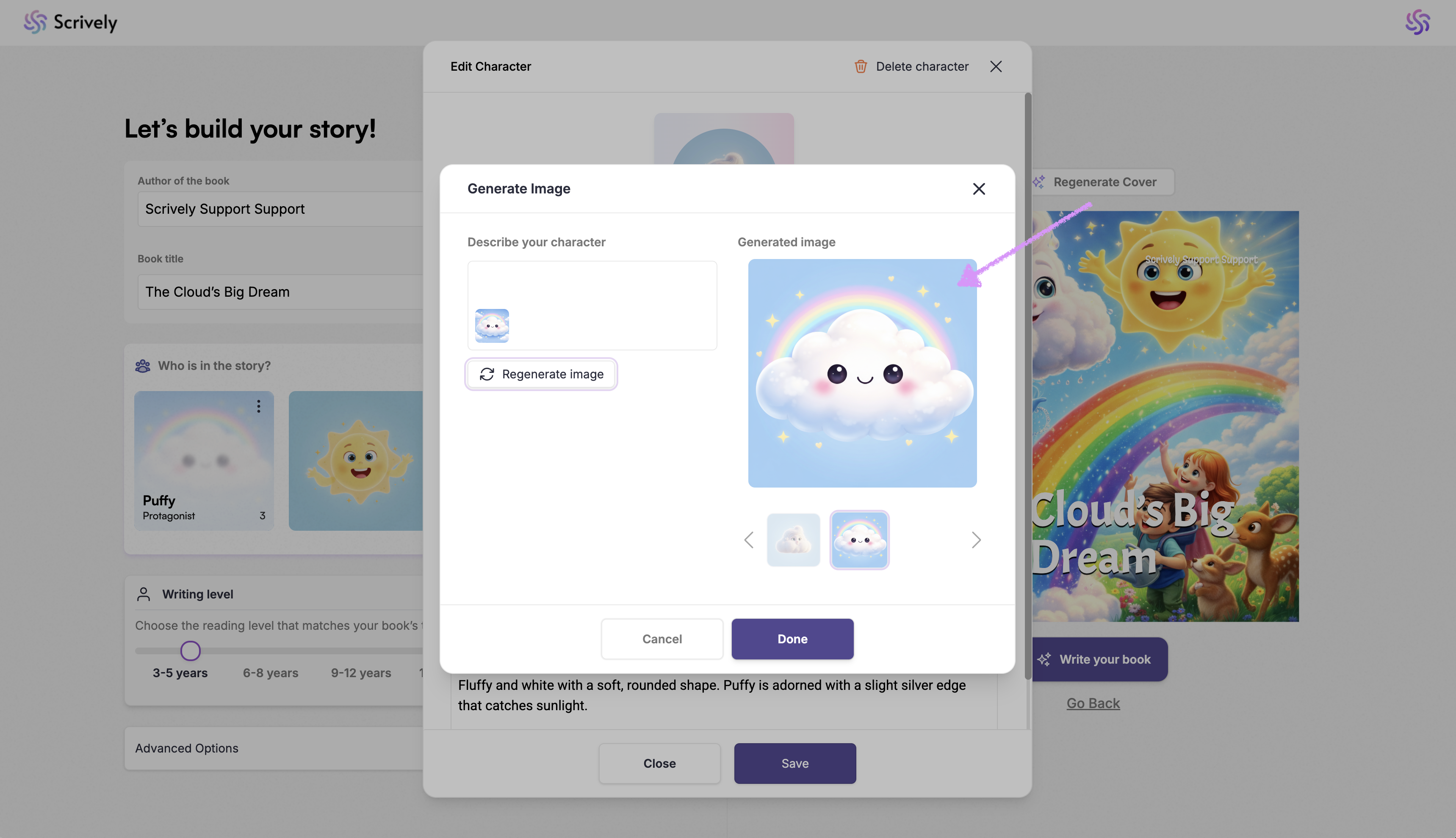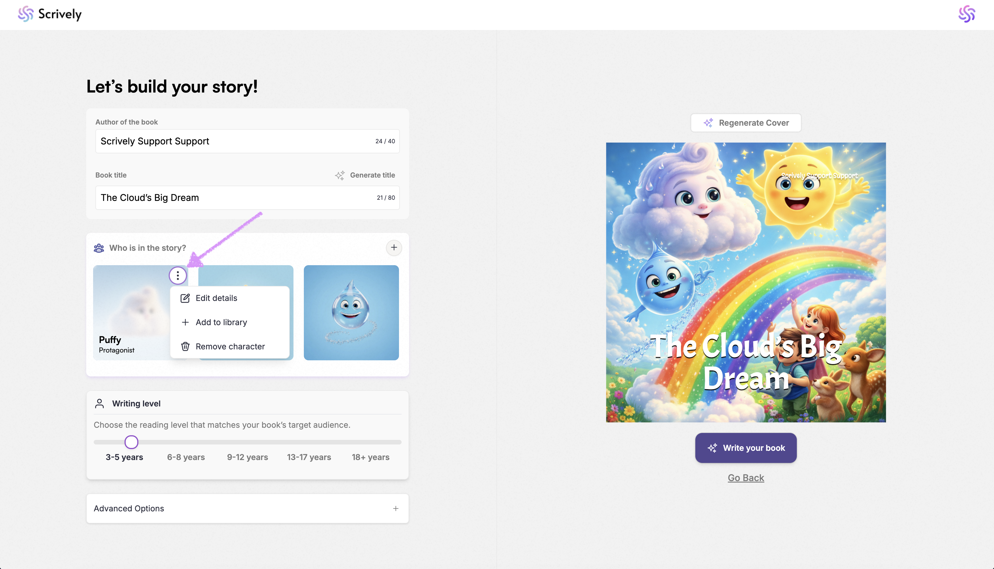Scrively generates character suggestions tailored to your storybook details, including character images, helping you bring your story to life with relevant and engaging personalities.