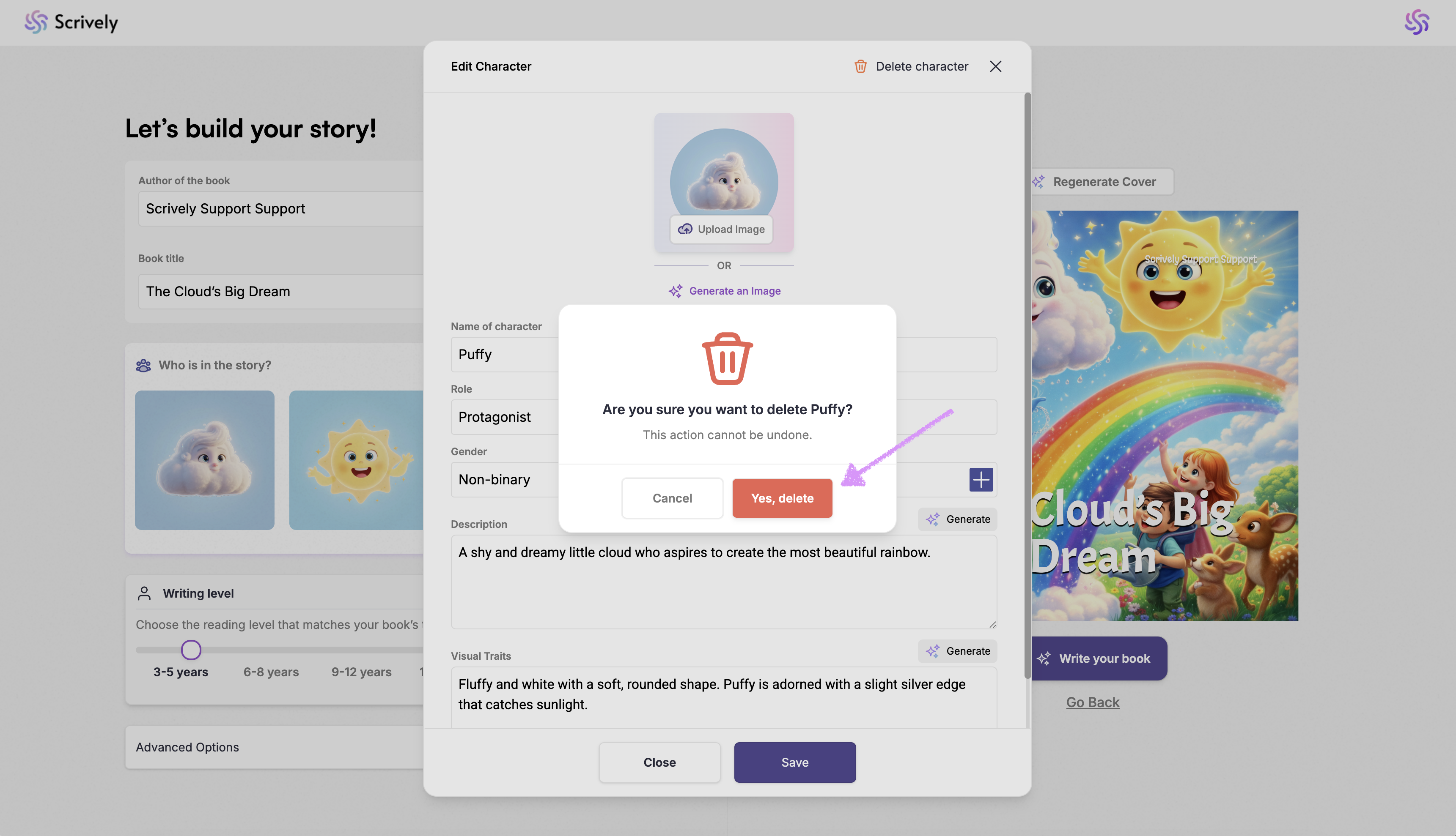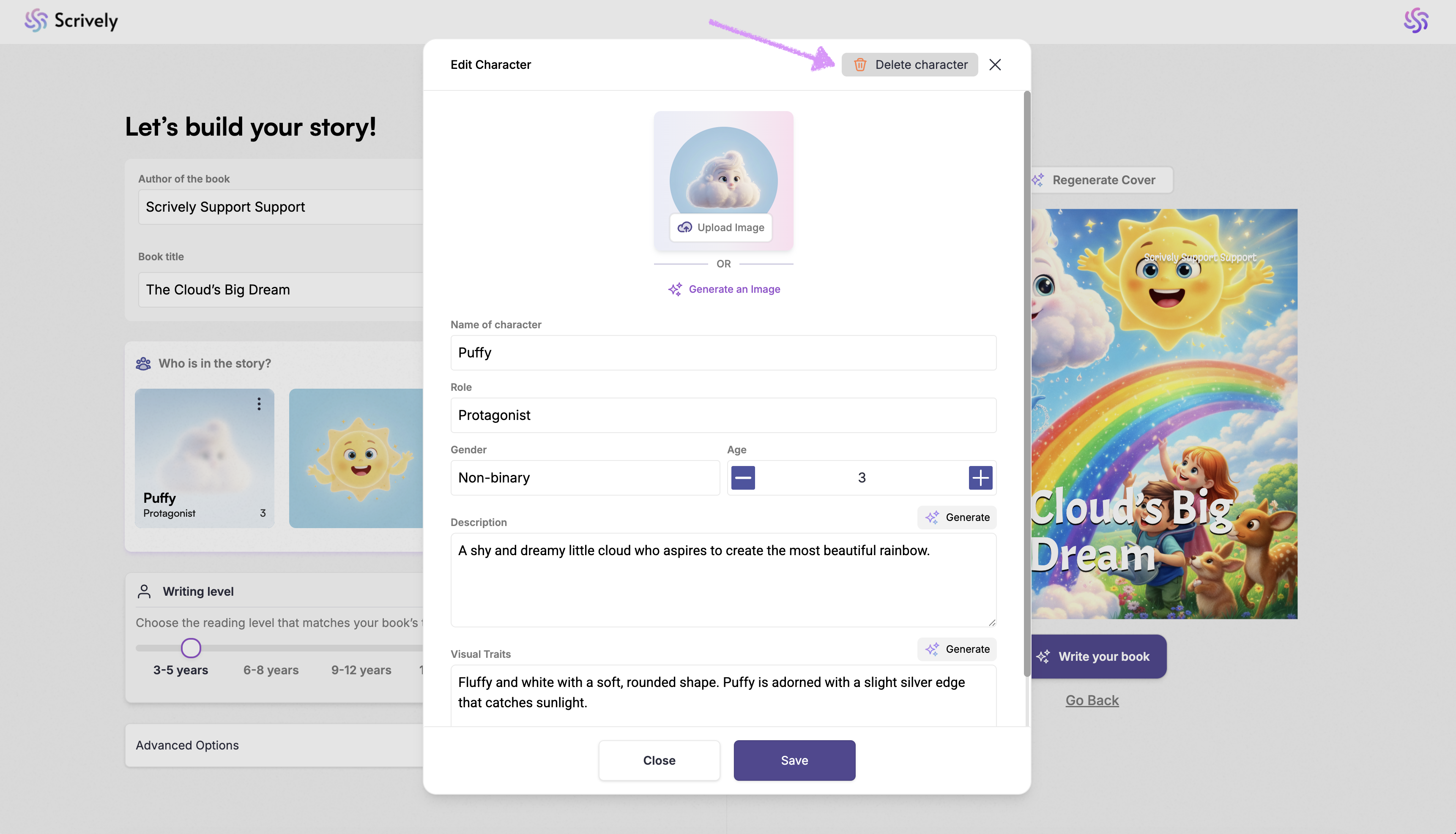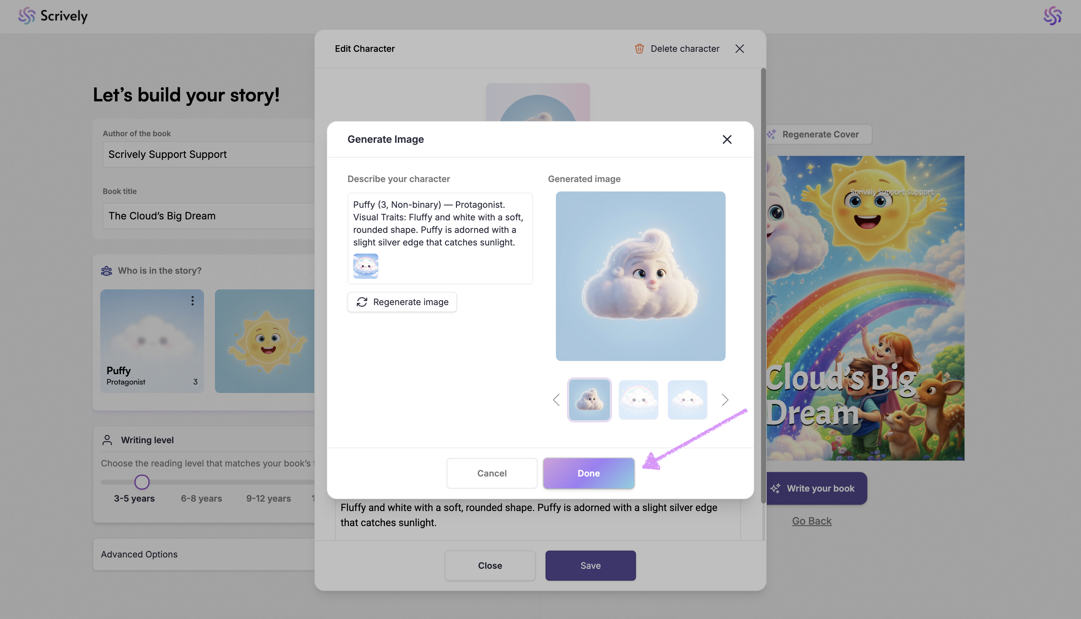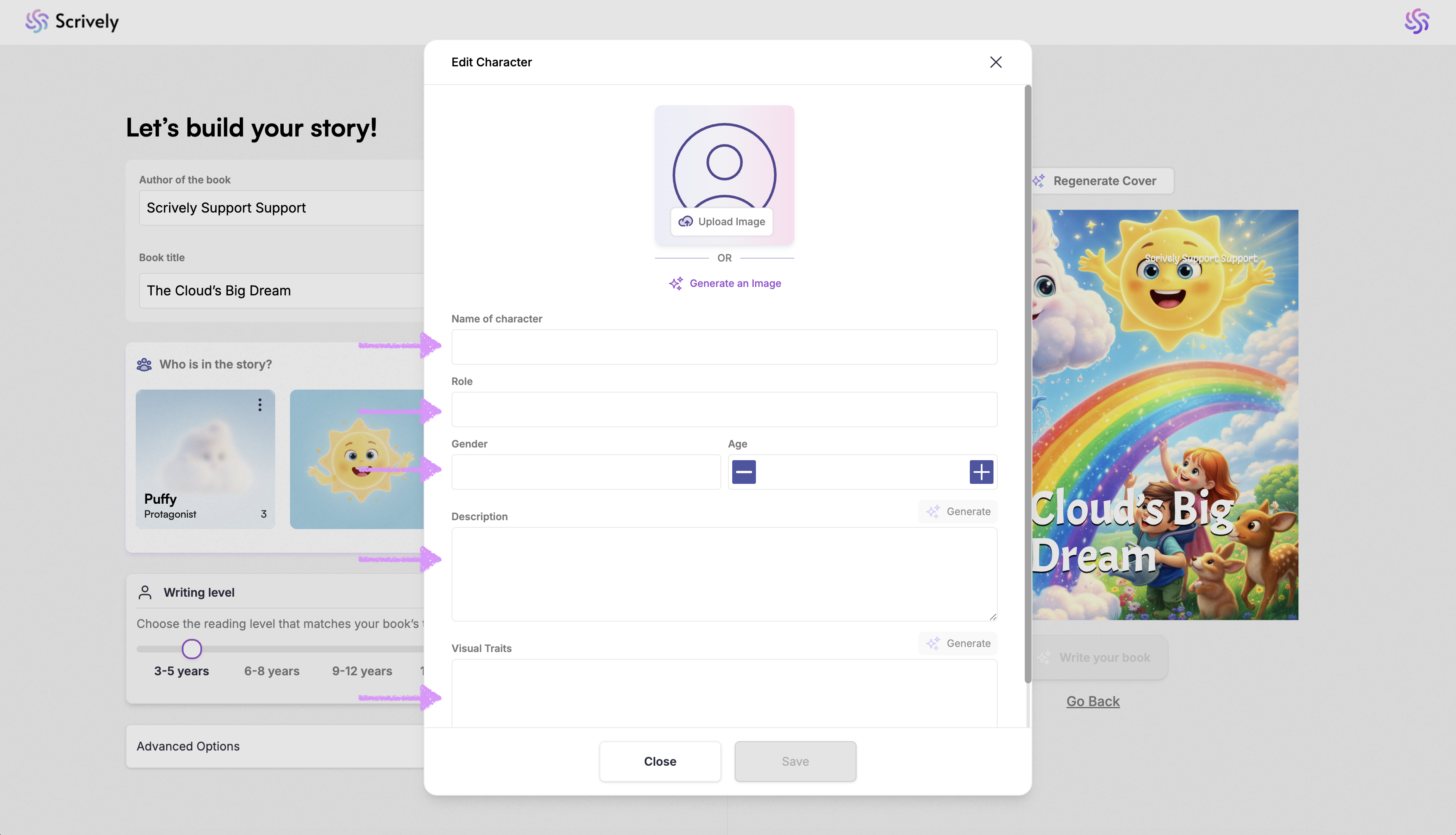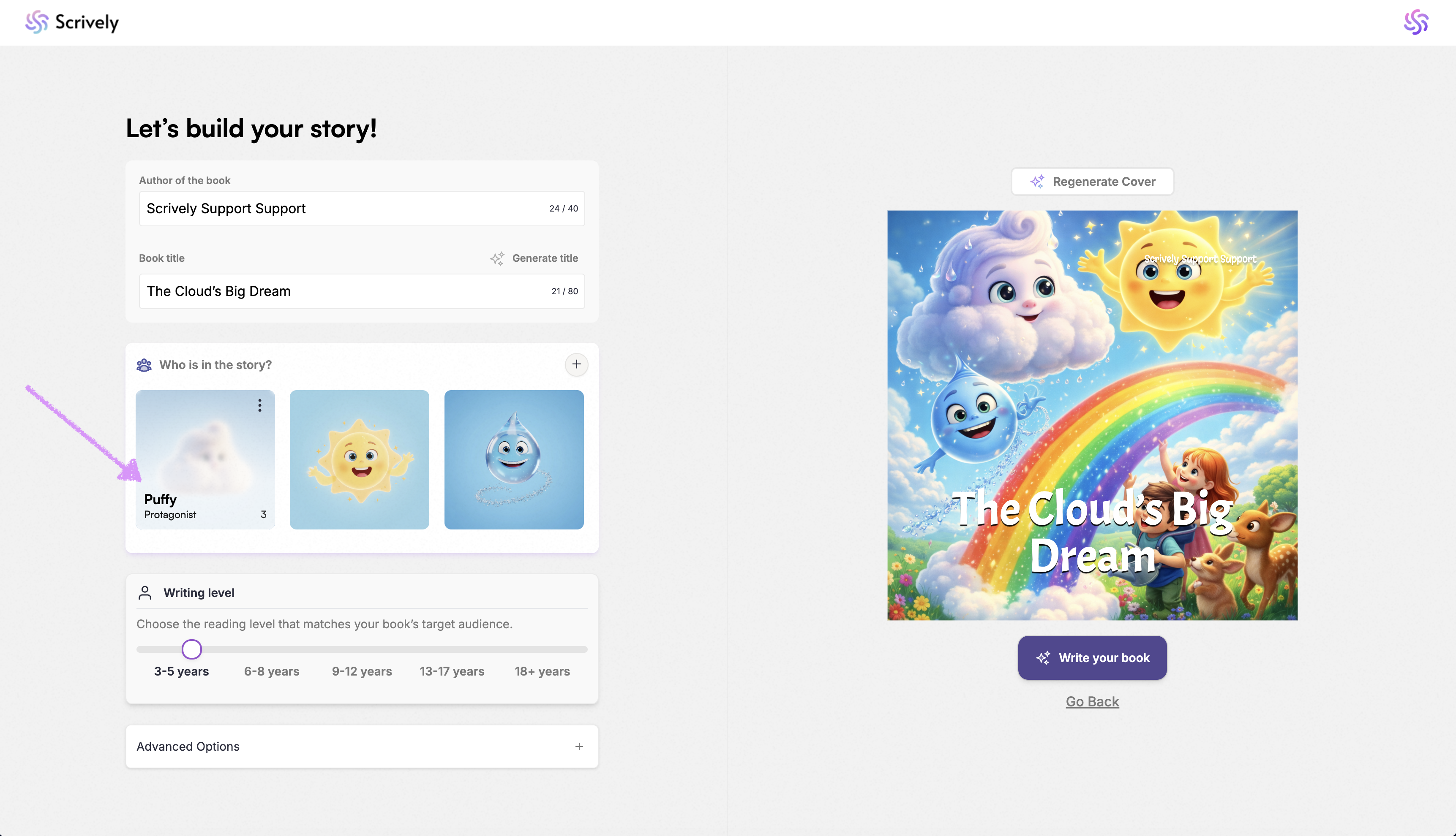 Scrively generates character suggestions tailored to your storybook details, including character images, helping you bring your story to life with relevant and engaging personalities.
