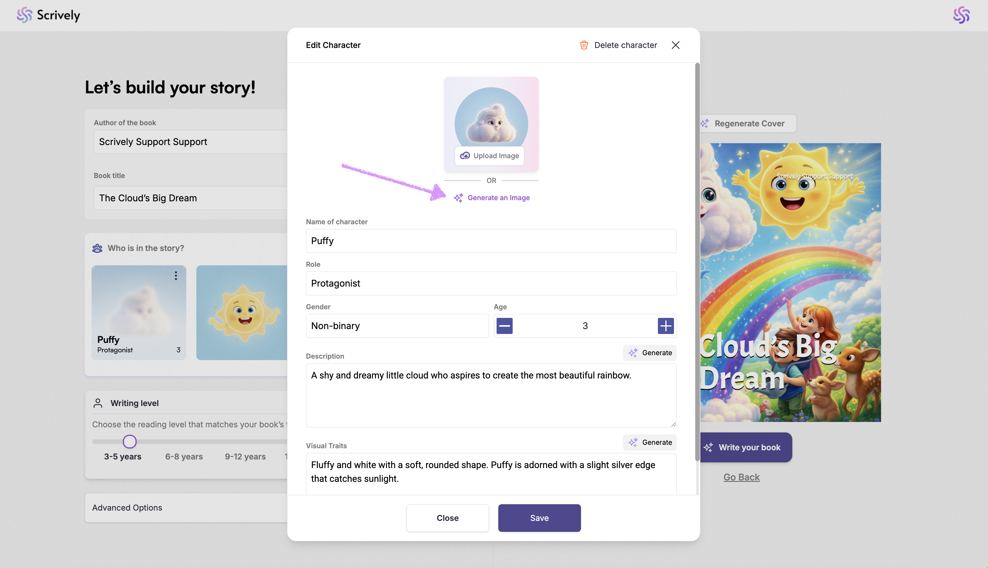 Alternatively, click on "Generate an image" to have Scrively create a character image for you.