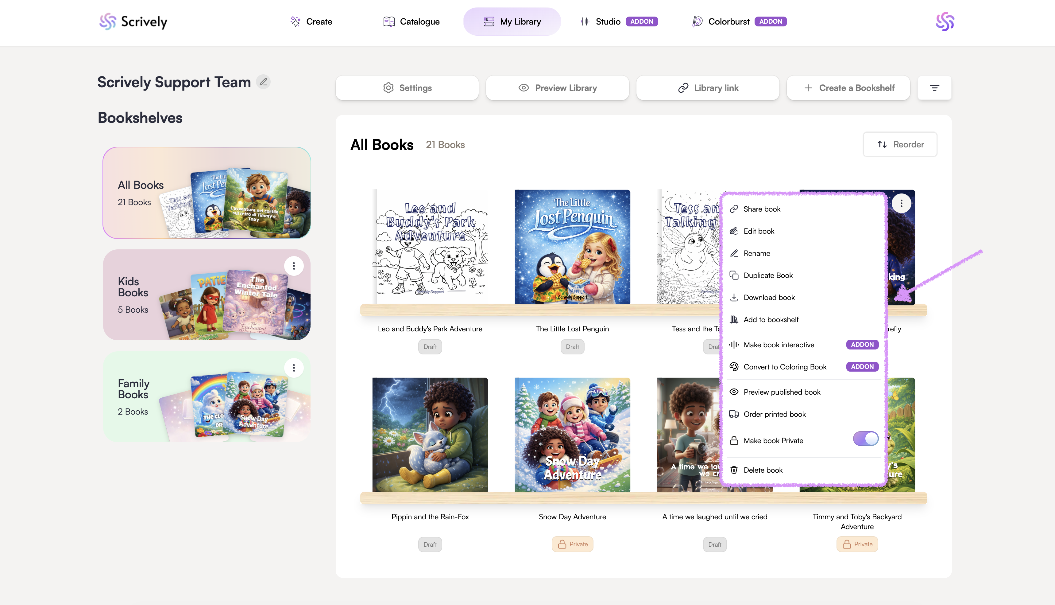 The book's menu option lets you share, edit, rename or duplicate your book, download as a PDF or EPUB, download the book's cover pages and audio, add to bookshelf, open in Studio (add-on), convert to a coloring book in ColorBurst (add-on), preview the published book on your shareable bookshelf, order printed copies, set your book to private, or delete it.